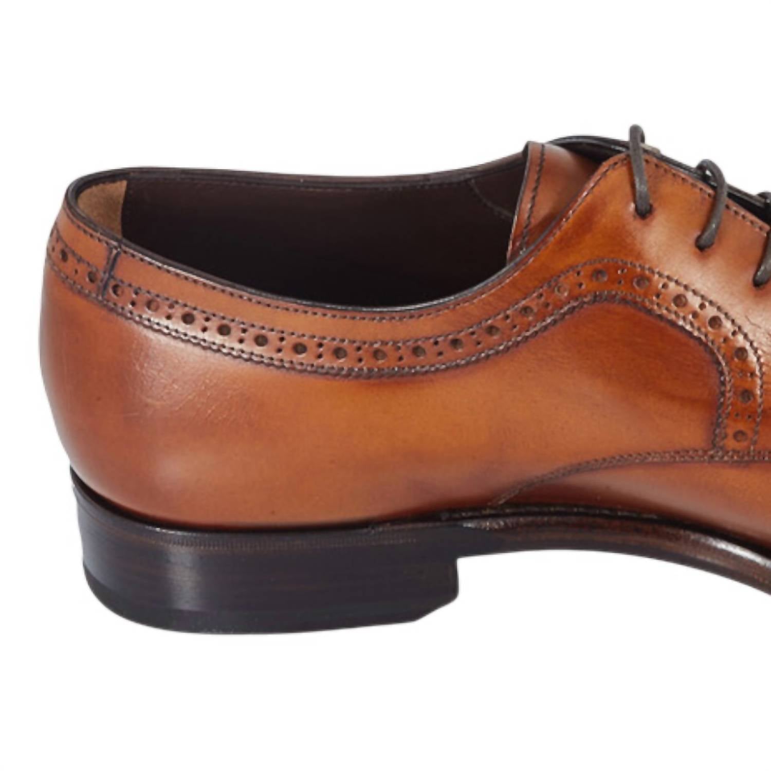 Introducing the Salvatore Ferragamo Men's Tullio Leather Derby Shoes in a sophisticated brown, perfect for spring weddings and Thanksgiving celebrations. These minimalist derbies feature an almond-shaped toe and brogue detailing atop a low stacked heel for a sleek profile. Made in Italy with high-quality leather for both the upper and sole, they offer a timeless lace-up style in oxfords and derbies. Ideal for the modern gentleman seeking elegance and comfort.