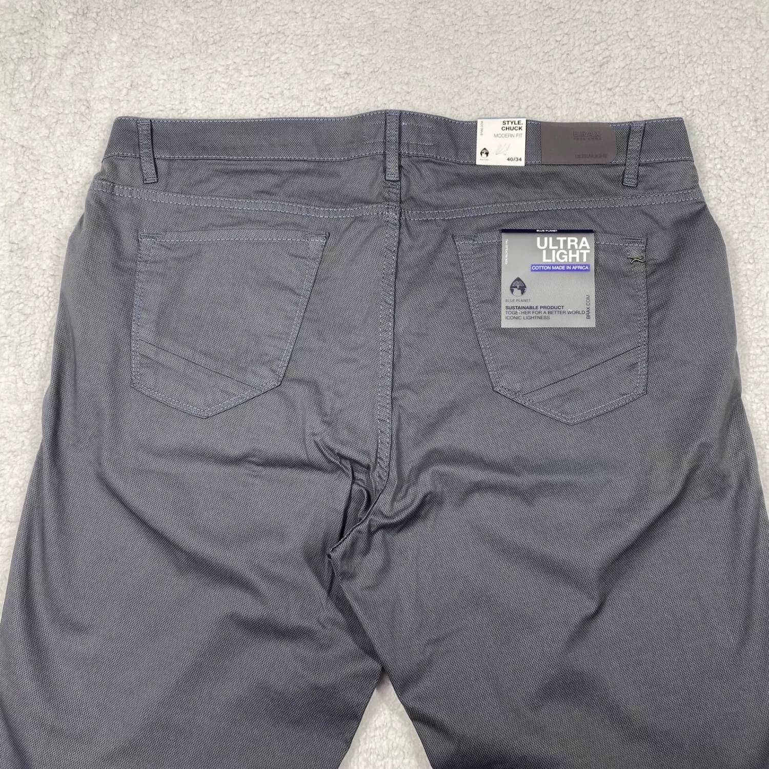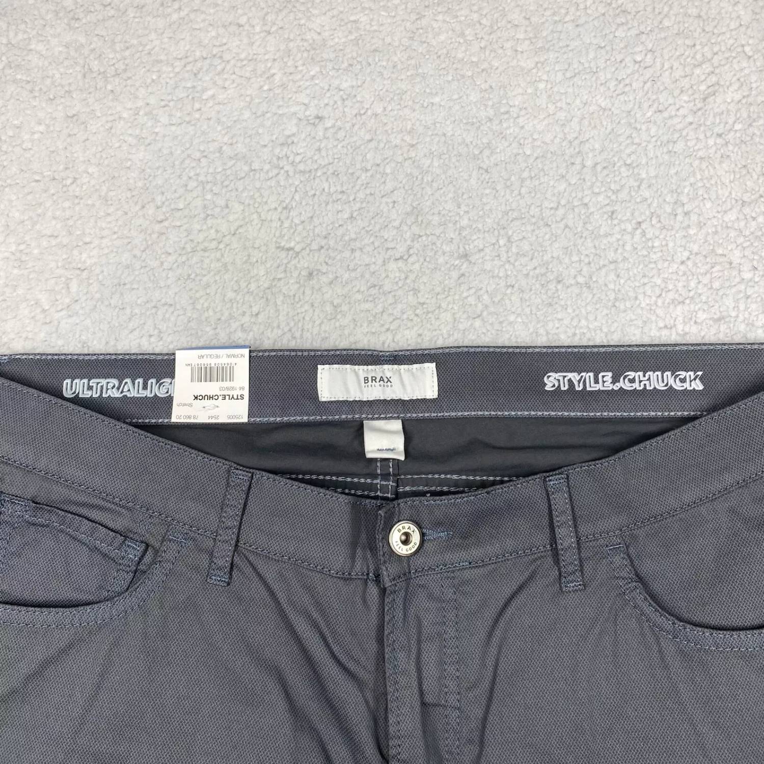 Introducing the Brax Men's Chuck Modern Fit Pant, a stylish addition to any wardrobe. These slim-fit chinos in a classic grey feature a straight leg design and convenient zip closure, crafted from comfortable cotton. Expertly made in Bulgaria, they boast a solid pattern and low-rise waist, delivering both style and function with five pockets. Care is simple: machine wash and lay flat to dry.