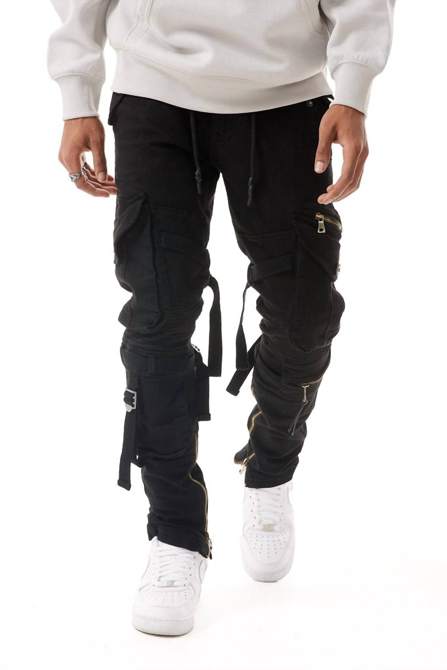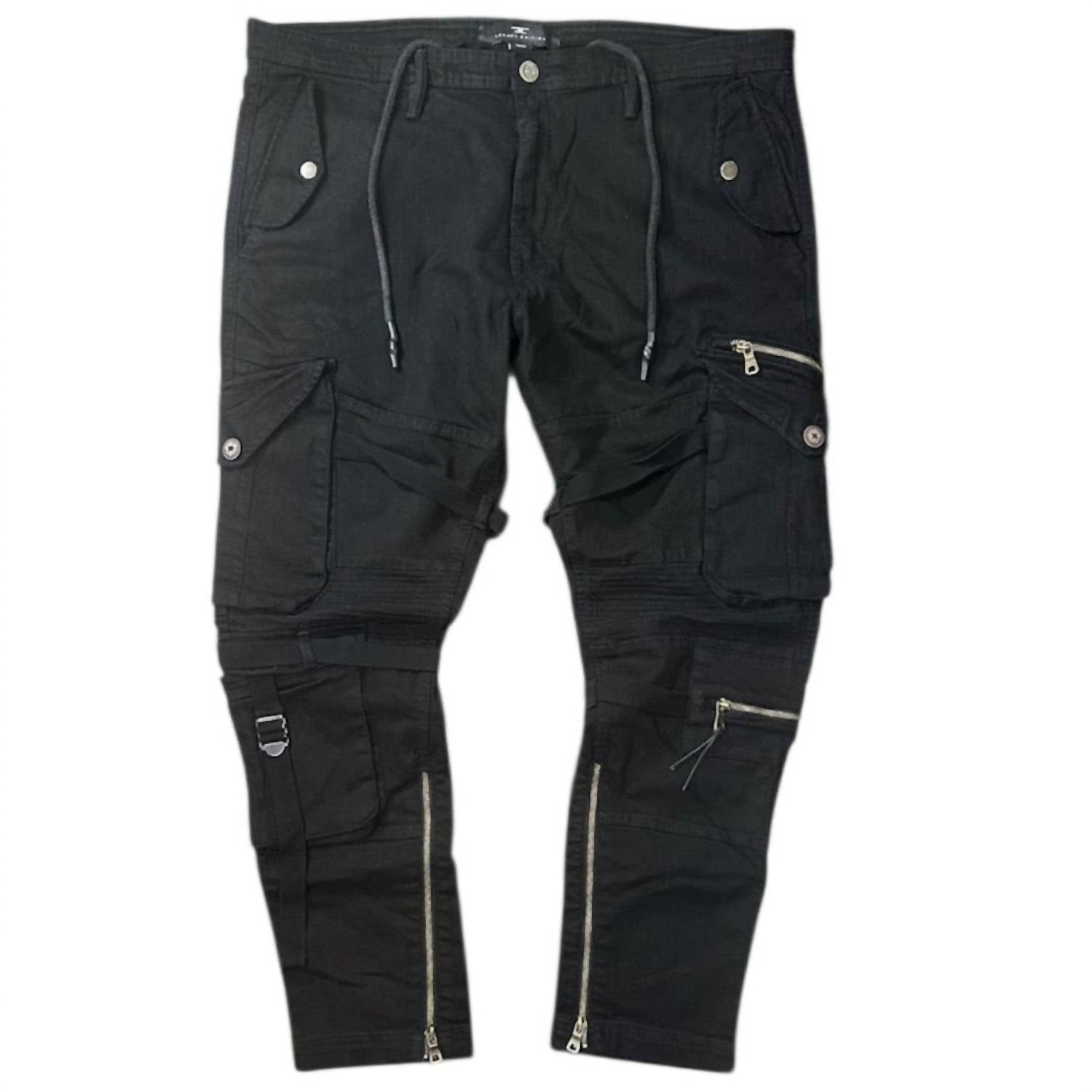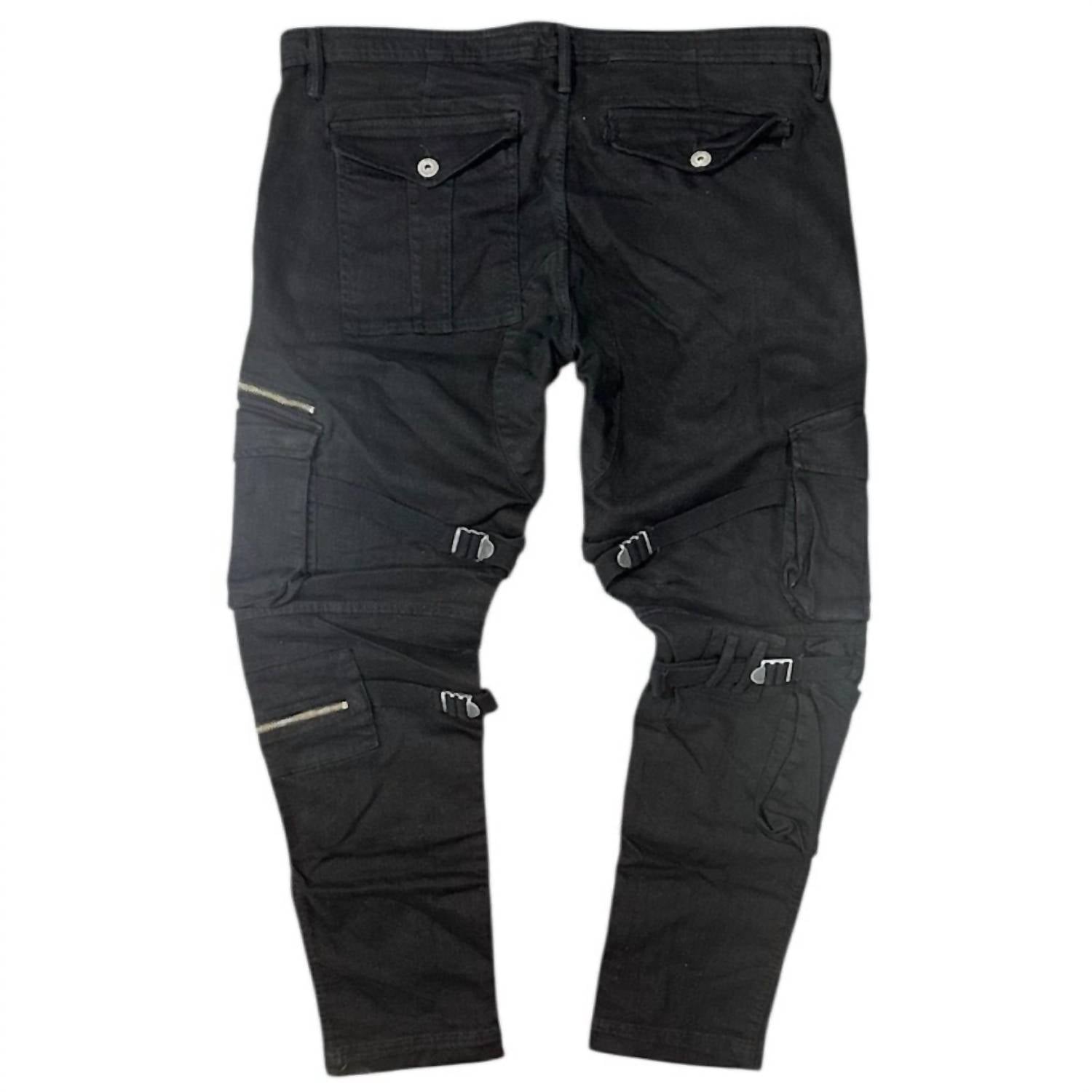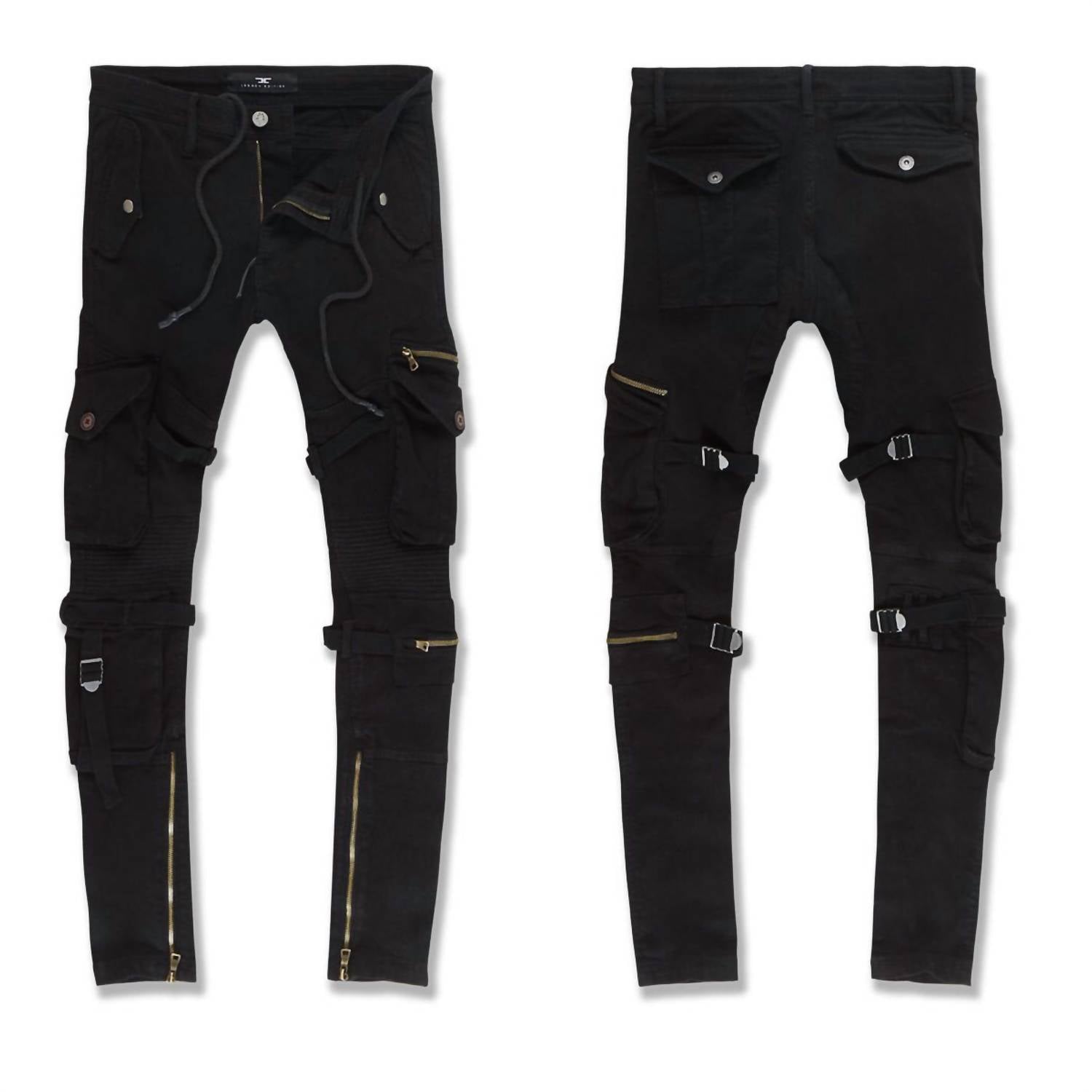 Presenting the Ross Brighton Cargo Pants by Jordan Craig, designed in versatile black for the modern man. These pants feature a button closure and come in our slimmest fit, with tight tapering from knee to ankle and functional cargo pockets on both legs. Crafted from a comfortable cotton blend of 98% Cotton and 2% Lycra, they include adjustable straps and zipper gussets at the ankle openings for added style. Perfect for any occasion, these pants offer practical design without compromising on comfort.