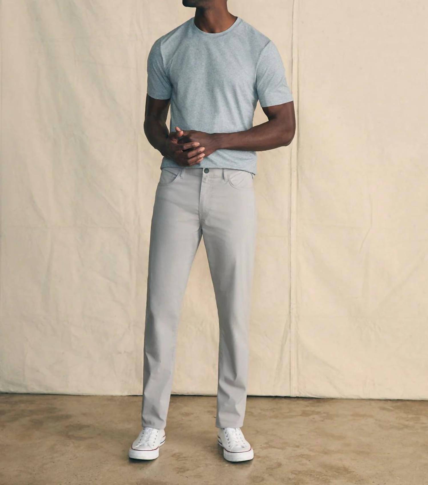 Experience unparalleled comfort and style with the Movement Straight Leg Pant by Faherty in a versatile fossil hue. Designed for all-day wear, these pants feature a slim and straight fit with a 32-inch inseam, sitting just below the natural waist. The classic 5-pocket silhouette includes a zip fly with rubberized logo metal shank closure and a hidden zip pocket at the back. Composed of 63% Organic Cotton, 33% COOLMAX® EcoMade Polyester, and 4% Elastane, these pants also feature an elastic interior waistband for improved fit and comfort. Closure: Zip closure. Care: Close all zippers before wash, turn inside out, machine wash cold with like colors on a delicate cycle, tumble dry, and do not bleach. Model Jamal, standing at 6’2", is wearing size 32WX32L.