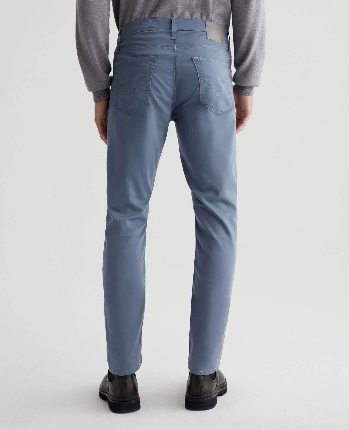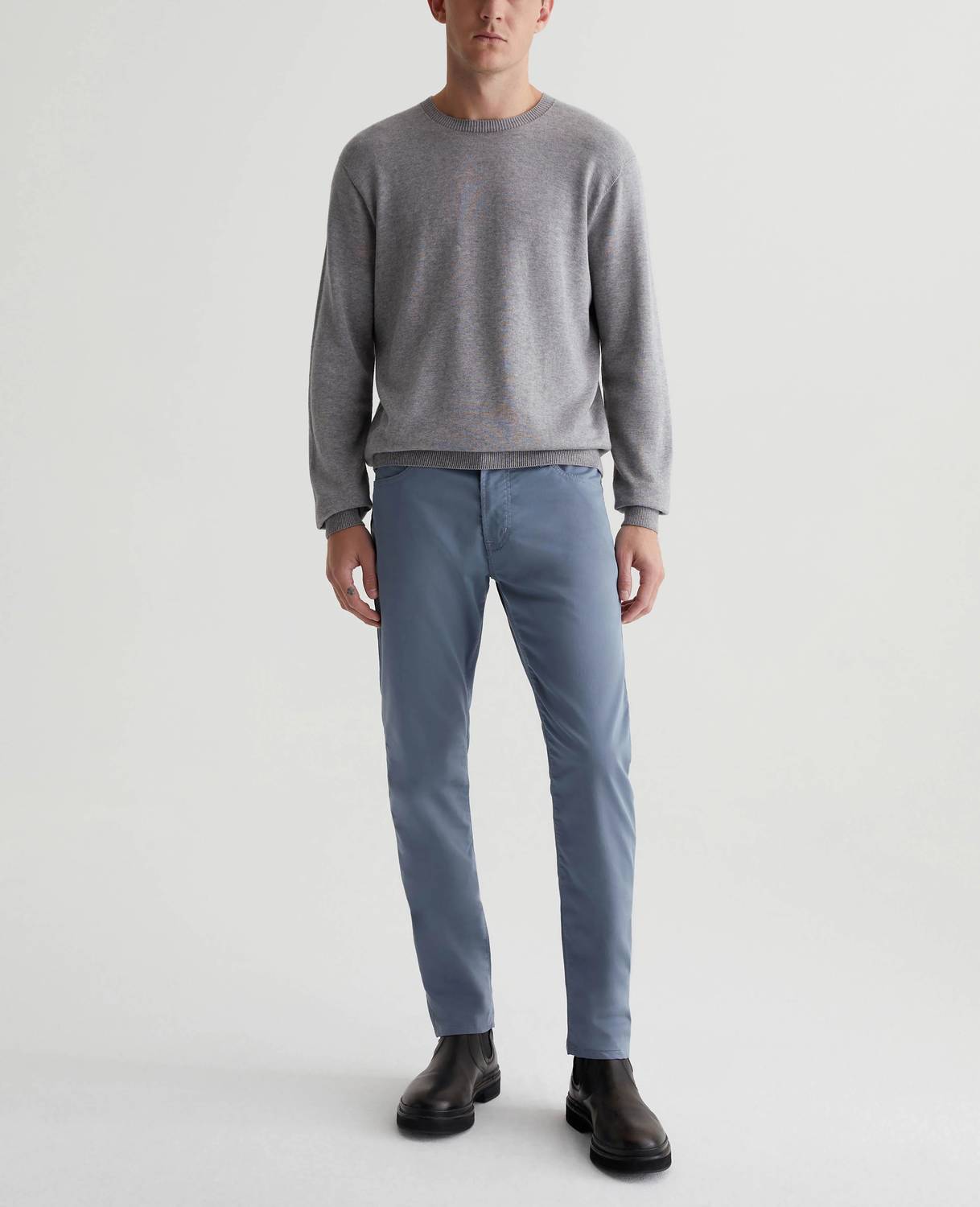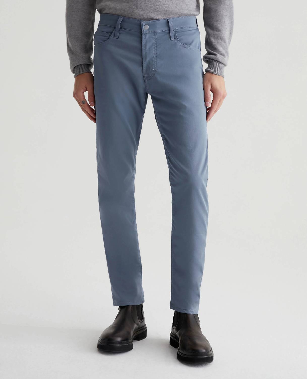 Introducing the AG Jeans Tellis Modern Slim Fit Pant, a sophisticated addition to your wardrobe in Blue Ice shade. Crafted with Airluxe™ Commuter Performance Sateen, this cotton blend comprises 53% Cotton, 44% Polyester, and 3% Elastane, offering premium stretch and a refined texture. Designed with a slim fit, these chinos are tailored with a mid-rise waist, a 34" inseam, and a tapered leg opening of 14" for superior style and comfort. Closure: Zip closure. Care: Machine wash. Model is wearing size 32, with dimensions including a 10" front rise and a 16 1/2" knee opening.