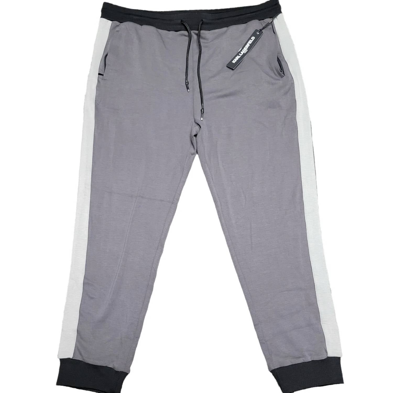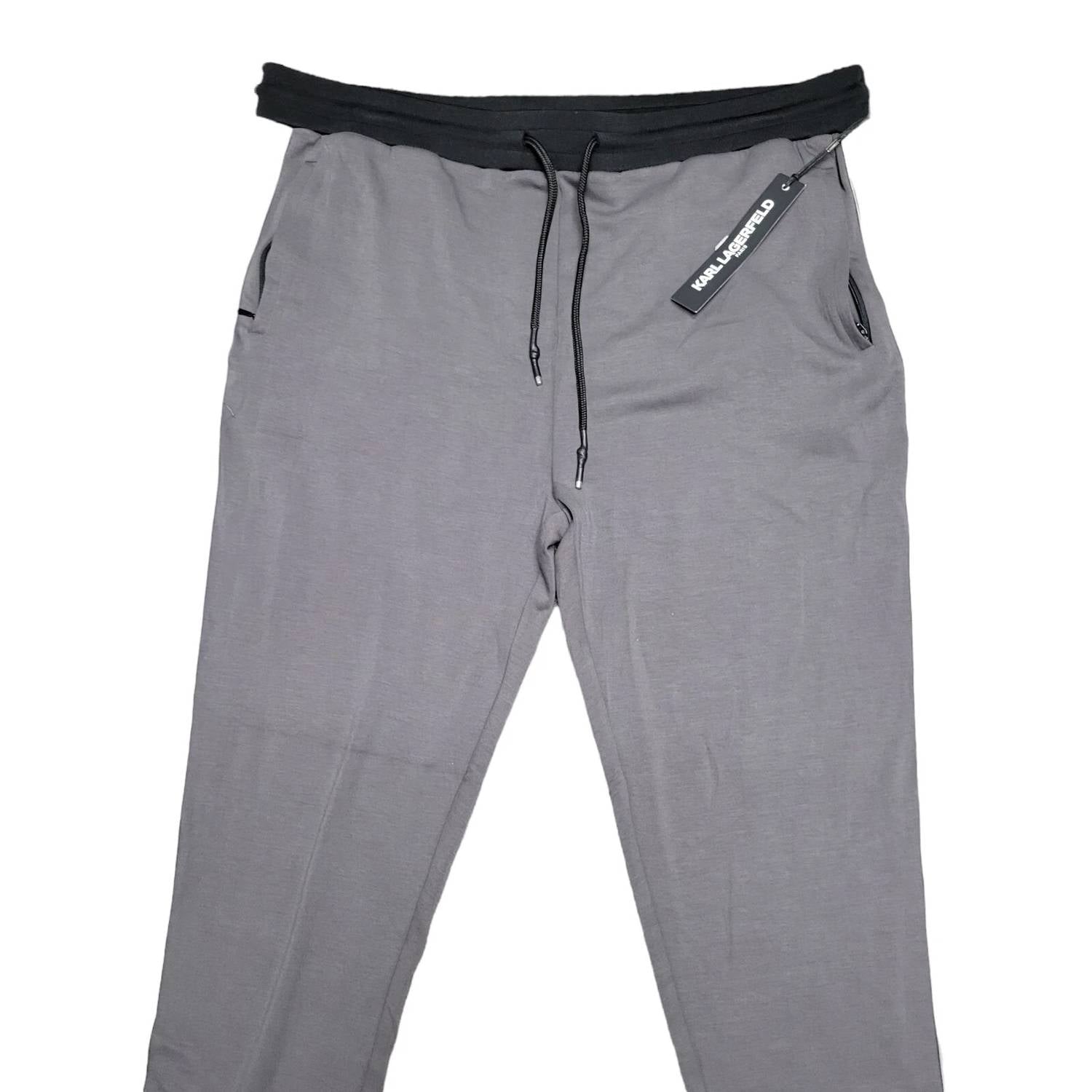 Achieve both comfort and style with the Men's Track Pants by KARL LAGERFELD in an elegant grey hue. Featuring a regular fit with tapered legs, these track pants are made from a blend of 79% Rayon, 17% Polyester, and 4% Spandex. The elastic waist and drawstring closure offer an adjustable fit, complemented by functional pockets. Care: Machine washable. Enjoy the perfect blend of athleisure fashion with a 28.5-inch inseam showcasing your active lifestyle.