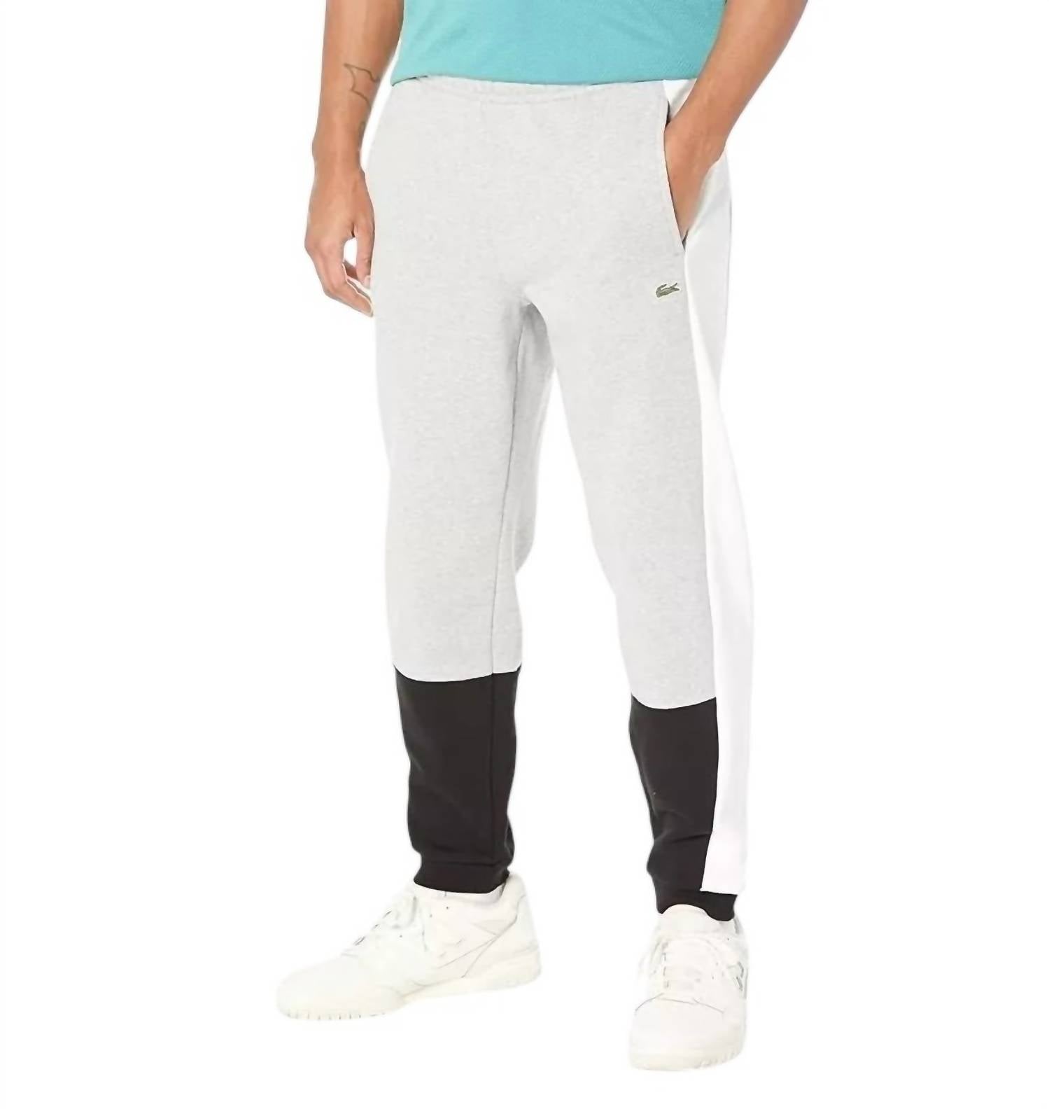 Step out in style with the Men's Regular Fit Color Block Joggers by LACOSTE. These chic joggers boast a contemporary colorblock design and a drawstring waist for a personalized fit, complemented by functional side pockets. Crafted from a premium cotton blend, the composition includes 80% Cotton and 20% Polyester in the shell, with added comfort from a 97% Cotton, 3% Elastane bottom rib and 100% Cotton pocket lining. Designed with a pull-on closure, these joggers feature a tapered leg style, perfect for modern casual wear.