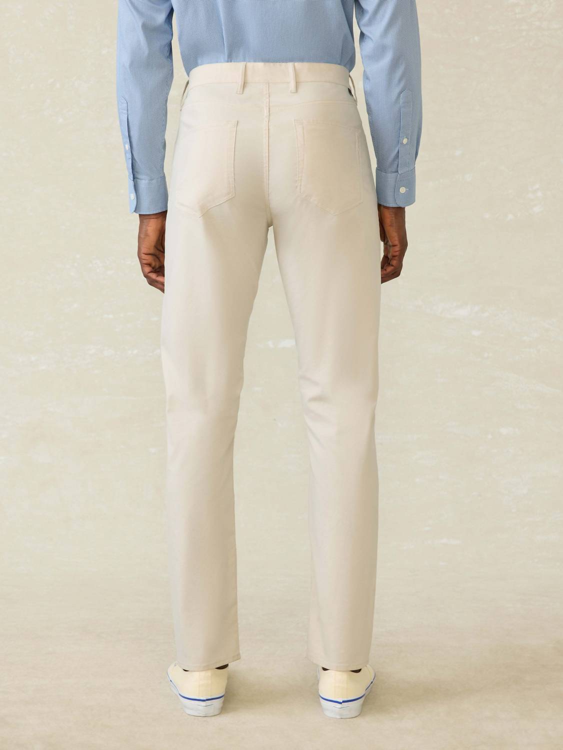 Experience unparalleled comfort and style with the Movement Straight Leg Pant by Faherty in a versatile fossil hue. Designed for all-day wear, these pants feature a slim and straight fit with a 32-inch inseam, sitting just below the natural waist. The classic 5-pocket silhouette includes a zip fly with rubberized logo metal shank closure and a hidden zip pocket at the back. Composed of 63% Organic Cotton, 33% COOLMAX® EcoMade Polyester, and 4% Elastane, these pants also feature an elastic interior waistband for improved fit and comfort. Closure: Zip closure. Care: Close all zippers before wash, turn inside out, machine wash cold with like colors on a delicate cycle, tumble dry, and do not bleach. Model Jamal, standing at 6’2", is wearing size 32WX32L.