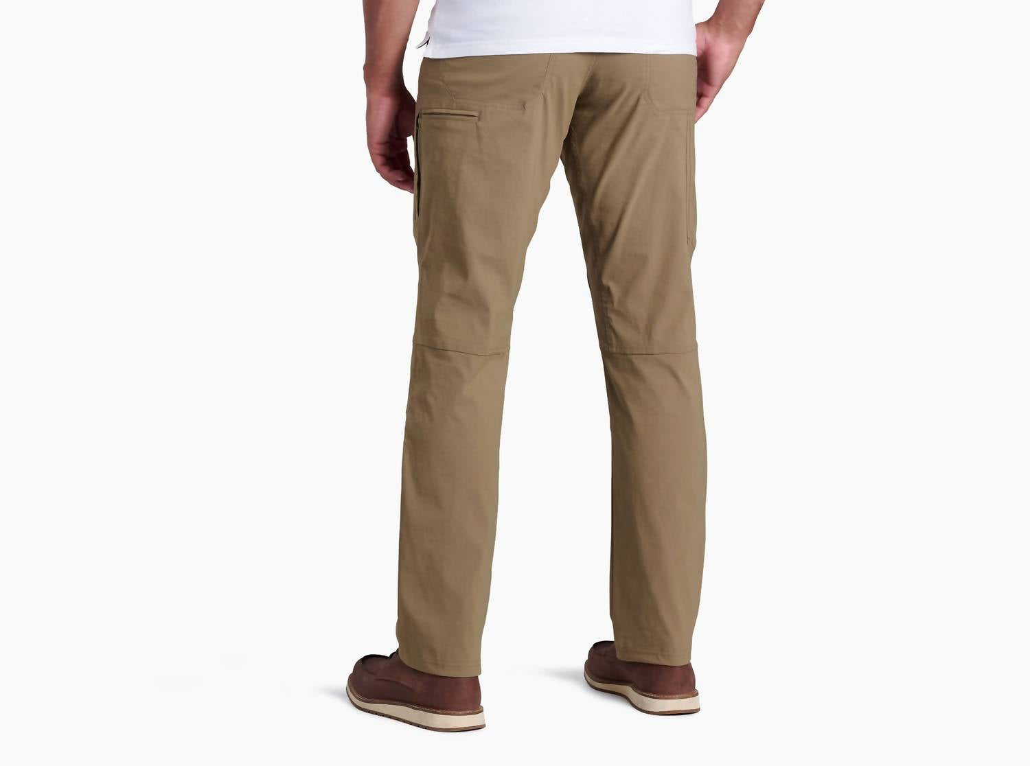 Introducing the Men's Renegade Pants by KUHL in Buckskin Khaki, featuring a solid pattern and designed for an adventurous lifestyle. These versatile chinos & khakis offer a slim fit and mid-rise with a straight leg style, perfect for streetwear occasions or summer vacations. Made from a durable blend of nylon and spandex, these pants offer UV protection, quick drying, and water resistance, ensuring comfort and performance. With a convenient zip closure and eight-pocket design, including zippered side and drop-in cellphone pockets, these imported pants combine functionality with style. Easy care instructions include machine wash cold and tumble dry low.
