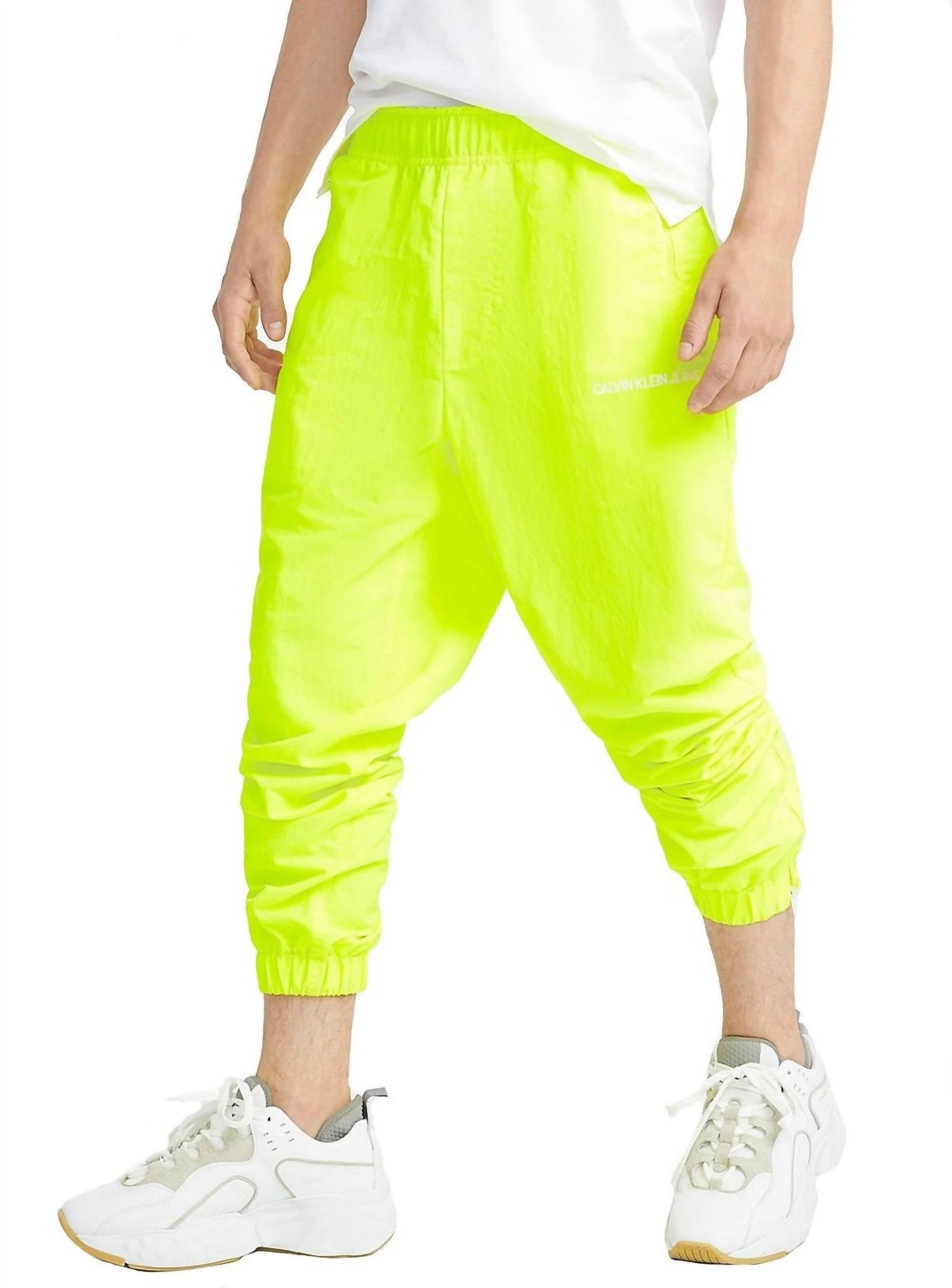 Made from windproof nylon fabric. Elastic waist with an adjustable inner drawstring. Elastic ankles with half-zip. 100% Cotton.