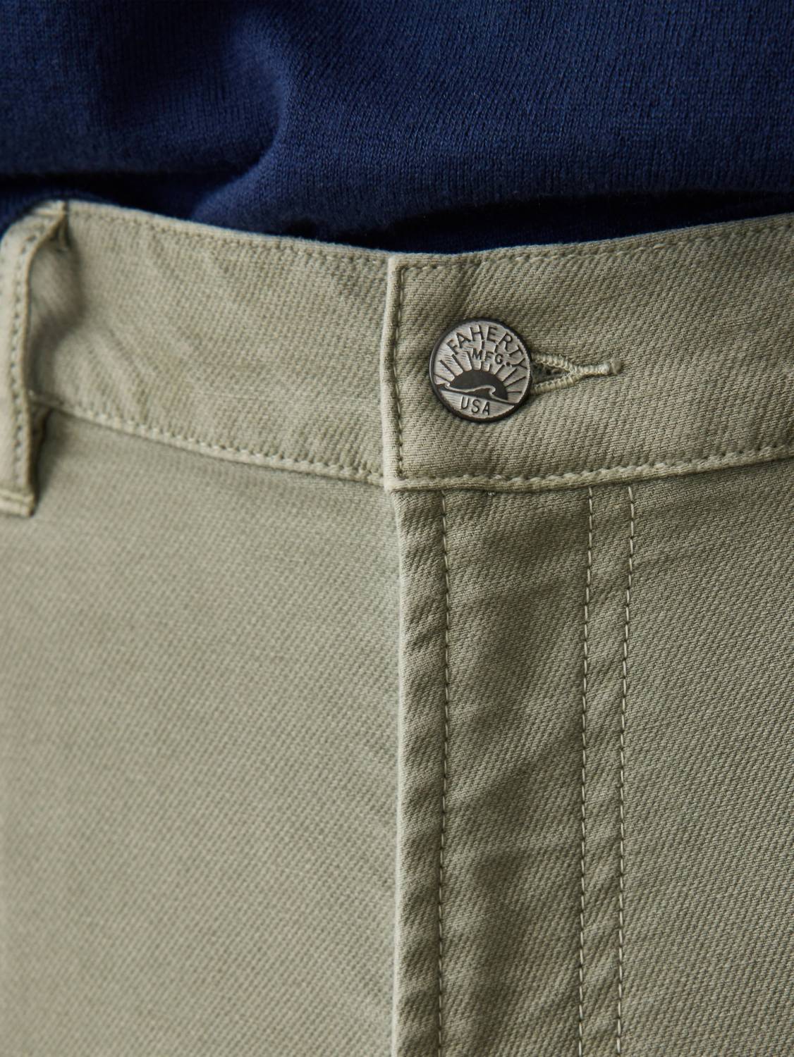 Embrace laid-back style with the Faherty Stretch Terry 5-Pocket Pant, an essential addition to your men's wardrobe in Faded Olive. Crafted from a high-quality cotton blend, these chinos feature a mid-rise waist and a slim fit through the hip and thigh, complete with a 32-inch inseam. This solid-patterned pant boasts the classic 5-pocket design and a secure button closure, making it ideal for both vacations and everyday ventures. Care for these pants by machine washing with similar colors and tumble drying on low, ensuring lasting comfort and style.