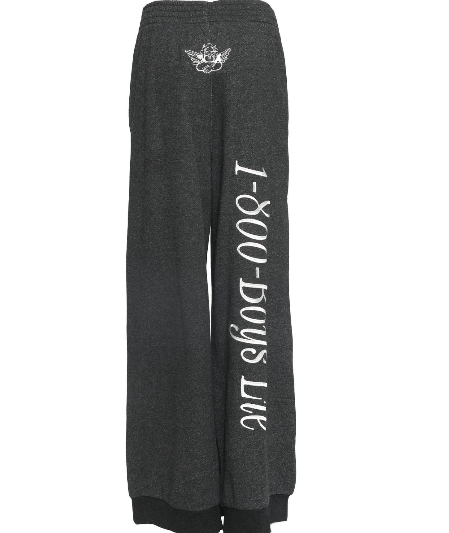 Elevate your casual wear with the Men's Refresh Mm Pants by BOYS LIE, boasting a relaxed wide-leg fit for ultimate comfort. These dark grey sweatpants feature a striking graphic design with "1-800 Boys Lie" written vertically down one leg. Composition: 66% Cotton, 21% Rayon, 13% Polyester Terry Natural. Closure: Pull-on style. Care: Machine wash cold with like colors, tumble dry low, and cool iron if needed, but avoid ironing decorations.