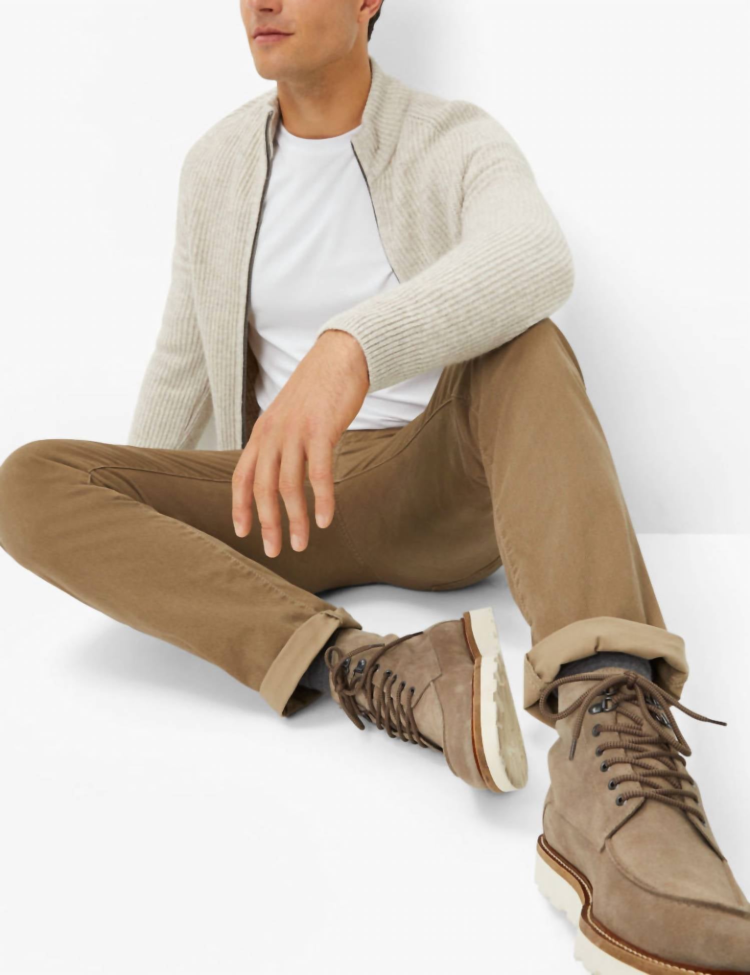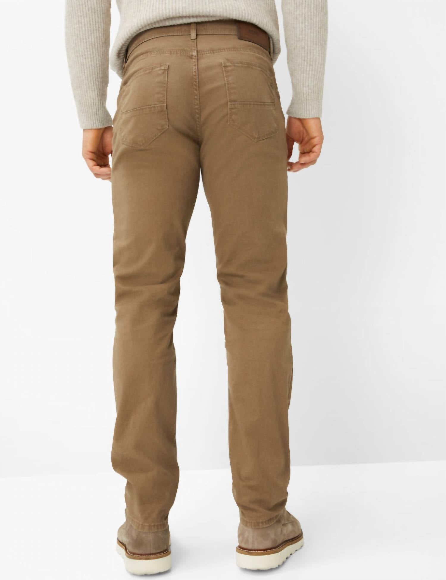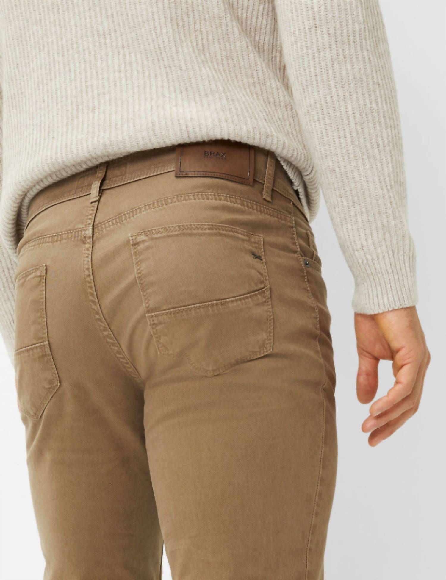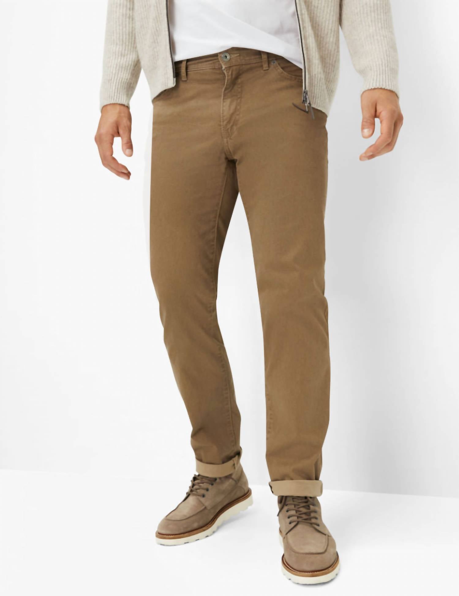 Introducing the Marathon Print Five-pocket Pants by Brax, a stylish choice for men seeking both fashion and comfort. These straight-fit chinos come in a sophisticated camel color with a minimal print, featuring a normal rise and straight leg style. Crafted from a 97% cotton and 3% elastane blend, the pants boast decorative studs, faux leather trims, and a hidden zip closure for added flair. Care: Machine wash at 65F-85F on a gentle cycle, do not bleach or tumble dry, iron at low temperature, and let dry flat in the shade. Ideal for spring holiday parties.