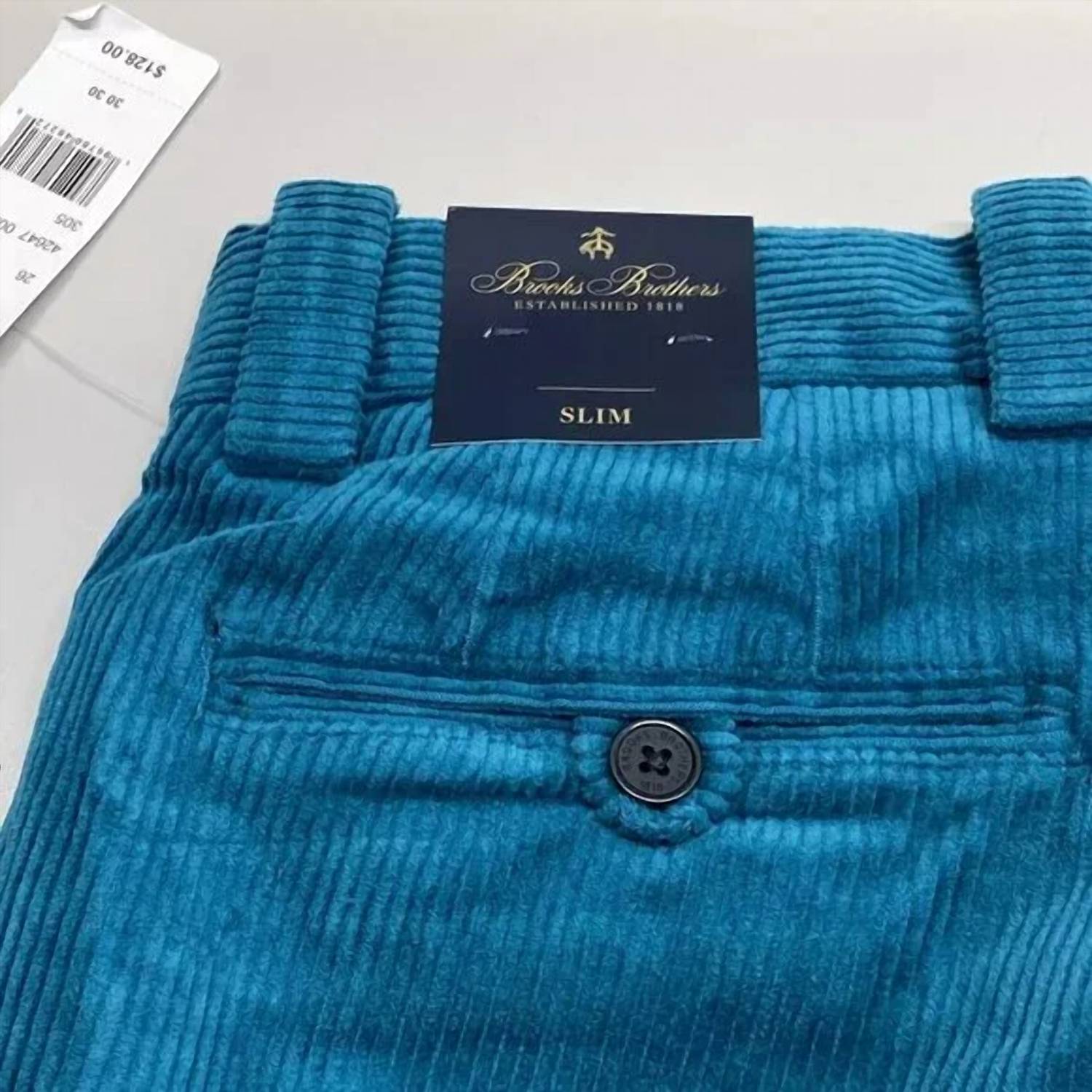 Elevate your wardrobe with the Men's Wide Wale Corduroy Pants from Brooks Brothers, a perfect blend of style and comfort in a striking teal hue. Designed with a regular fit and straight leg for easy wear, these pants are crafted from 100% cotton corduroy, featuring a soft wide wale texture and classic design. Made in Vietnam, they offer a practical zip closure and convenient pockets, ideal for travel and workwear occasions. Care: Machine wash, tumble dry for effortless maintenance.