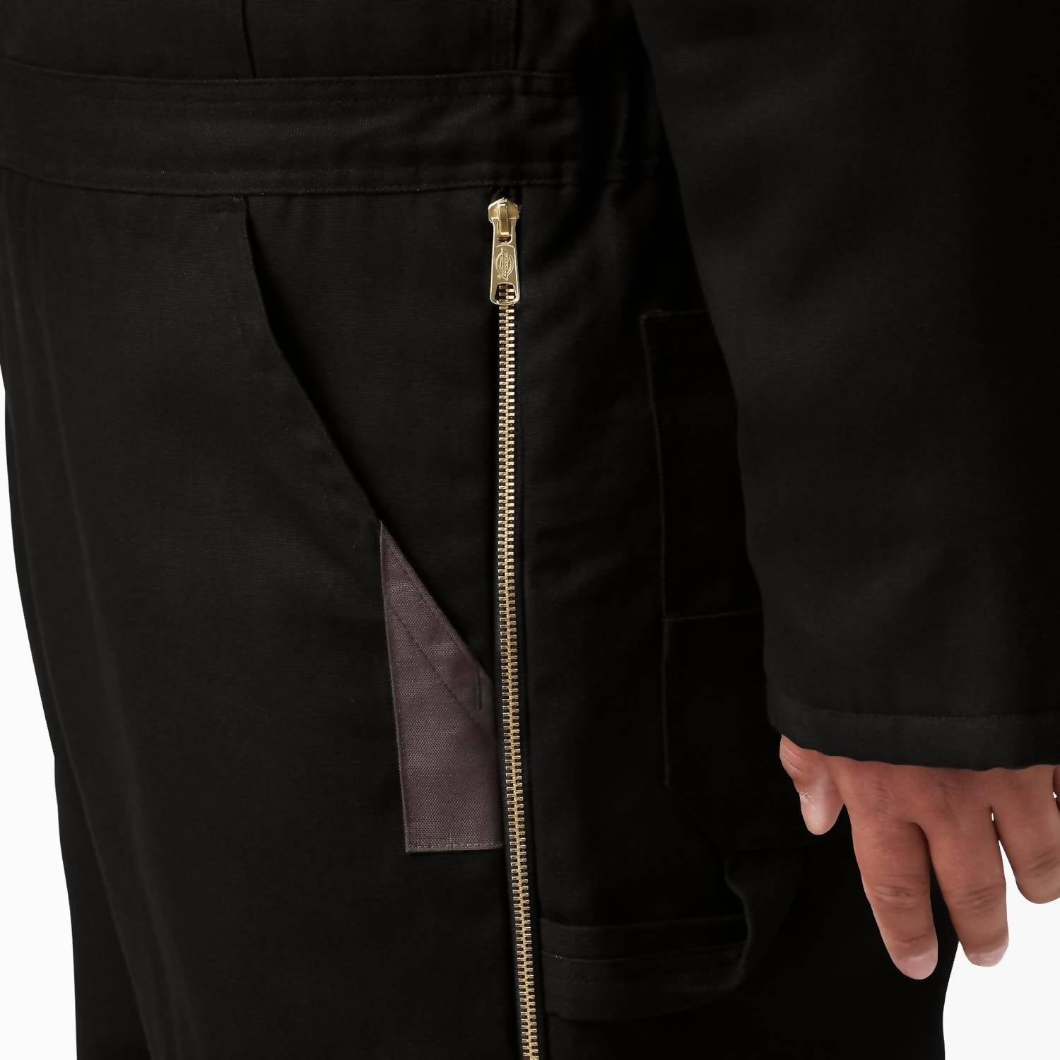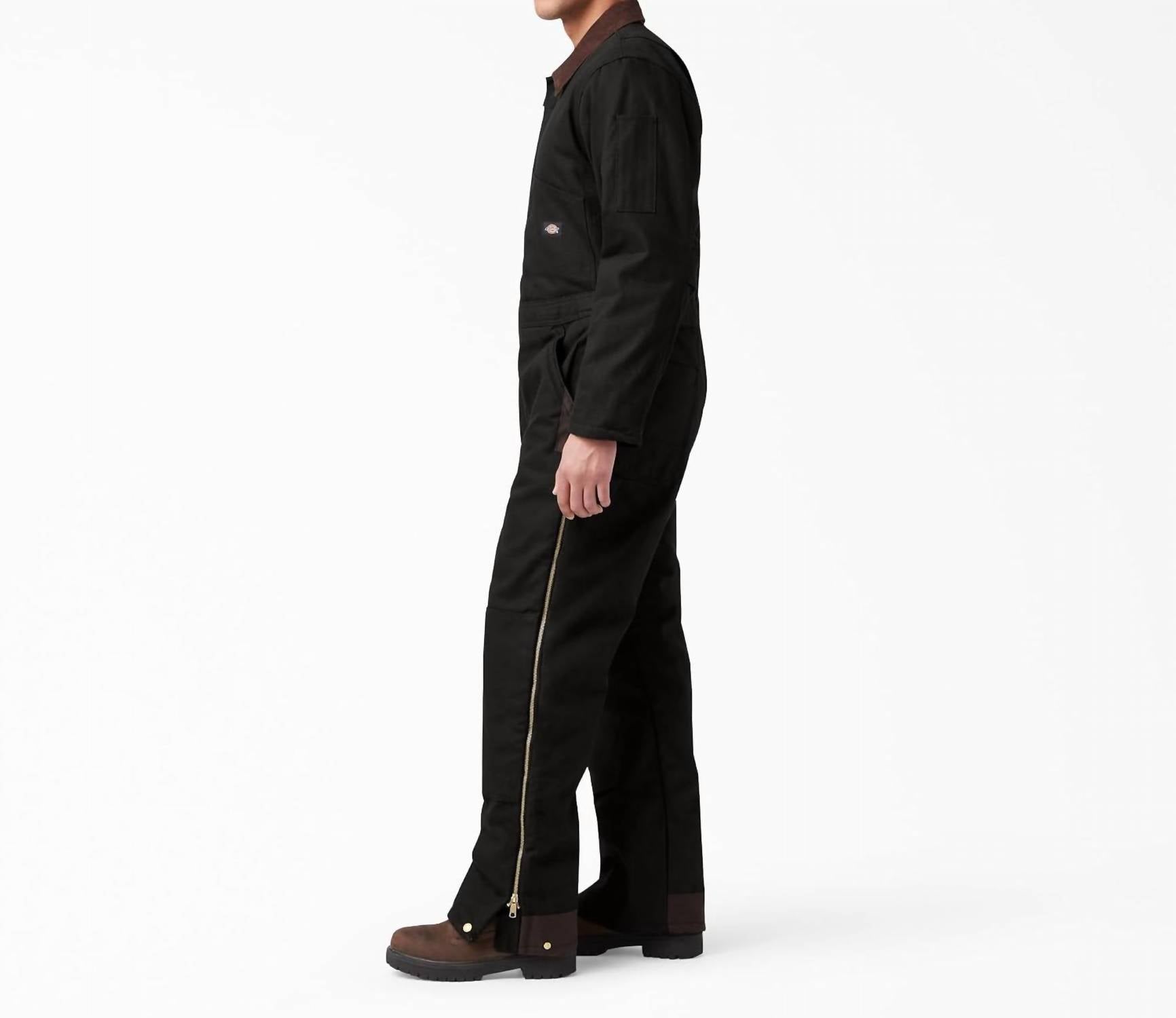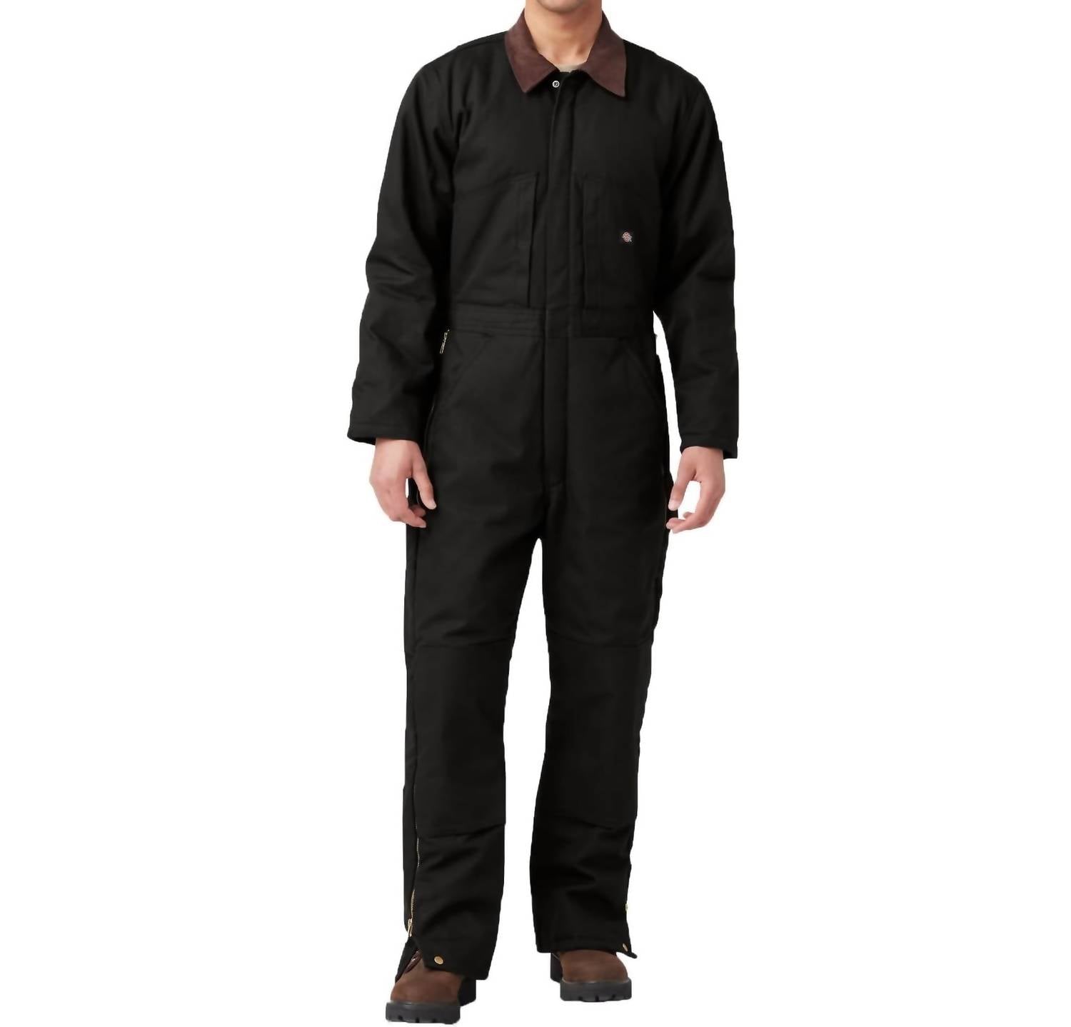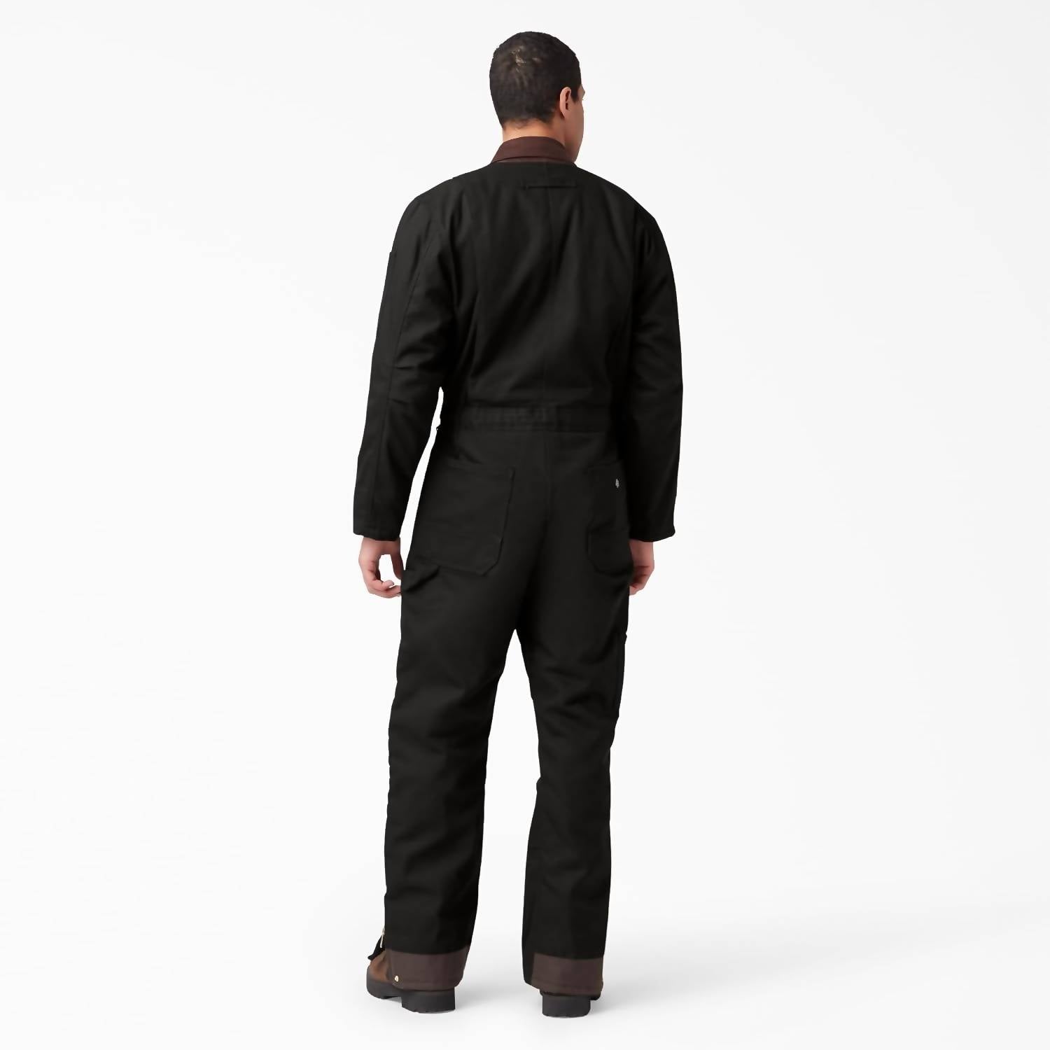 Introducing the Dickies Duck Insulated Coveralls in Black, a must-have for those demanding all-weather work environments. Crafted from 10 oz. rigid duck, this garment offers 100% cotton composition with a polyester/nylon lining for superior warmth and comfort. Designed in China, these overalls feature a zip-to-waist closure for easy on and off, bi-swing back for flexibility, and elastic waist inserts for movement ease. These straight leg, big & tall coveralls are machine washable, making them ideal for winter travel and workwear needs.