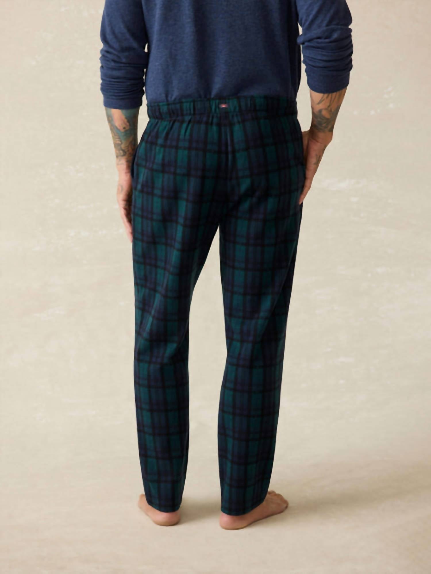 Experience ultimate comfort with Faherty's Legend Pajama Pants, crafted from 100% organic cotton in a classic Blackwatch plaid pattern. These men's pajama bottoms feature a relaxed, straight leg fit with an easy pull-on closure, enhanced by a cotton drawcord at the waistband. Practicality meets style with two front pockets and a 30.5" inseam, ideal for lounging at home or casual outings. Care instructions: Machine wash cold with like colors, gentle cycle, tumble dry low, and cool iron when needed. David, who stands at 6’2", wears a size medium.