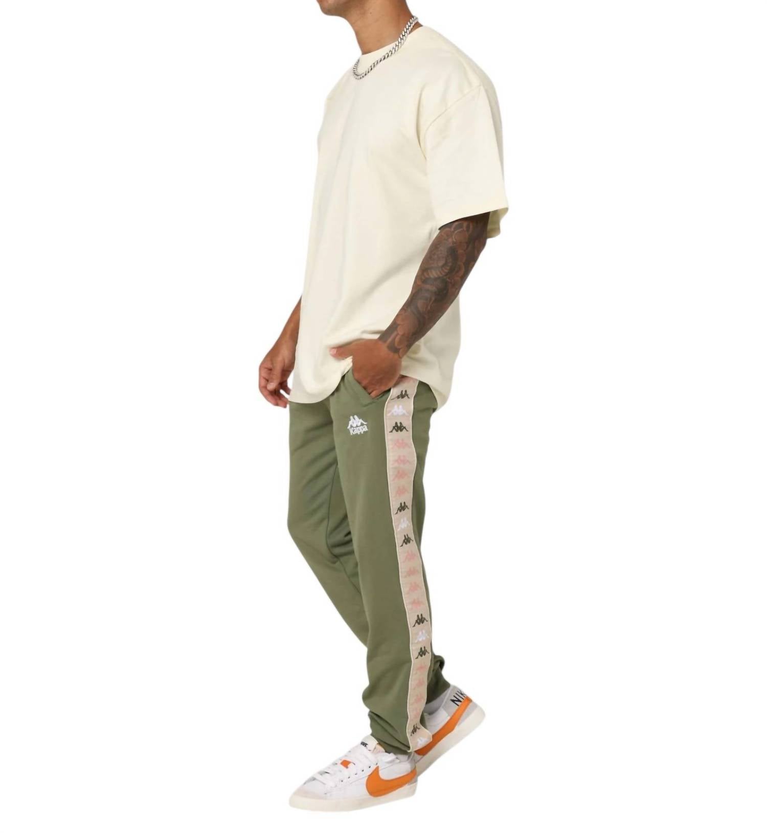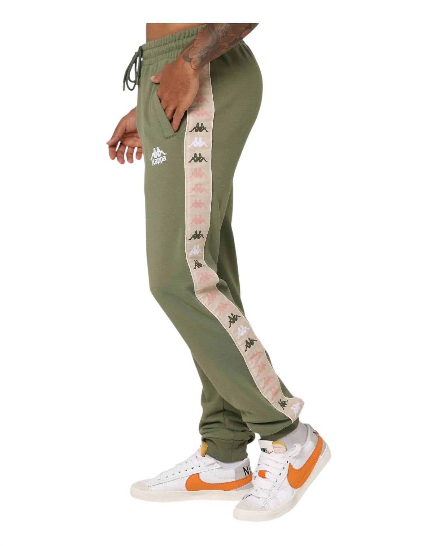 Meet the Kappa 222 Banda Alanz 3 Sweatpants, designed for men's athleisure in a stylish army green hue. These sweatpants boast a regular fit with a straight leg style, featuring Kappa's iconic jacquard Omini logo tape on the sides. Constructed from 80% cotton and 20% polyester, they offer comfort with an elastic waistband and practicality with side and back pockets. Closure is secured with a tie, and they are easy to maintain with machine wash and line dry care instructions.