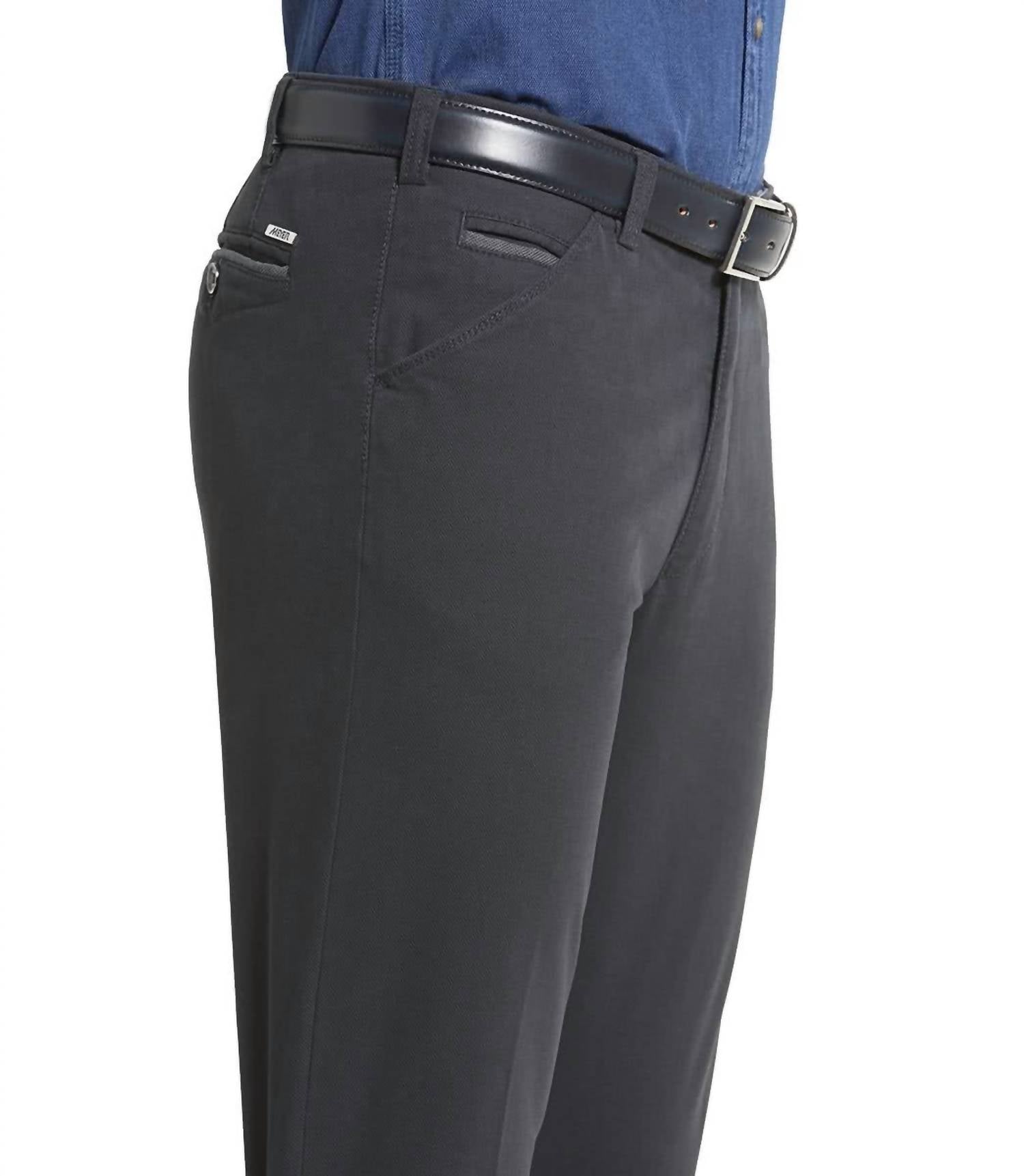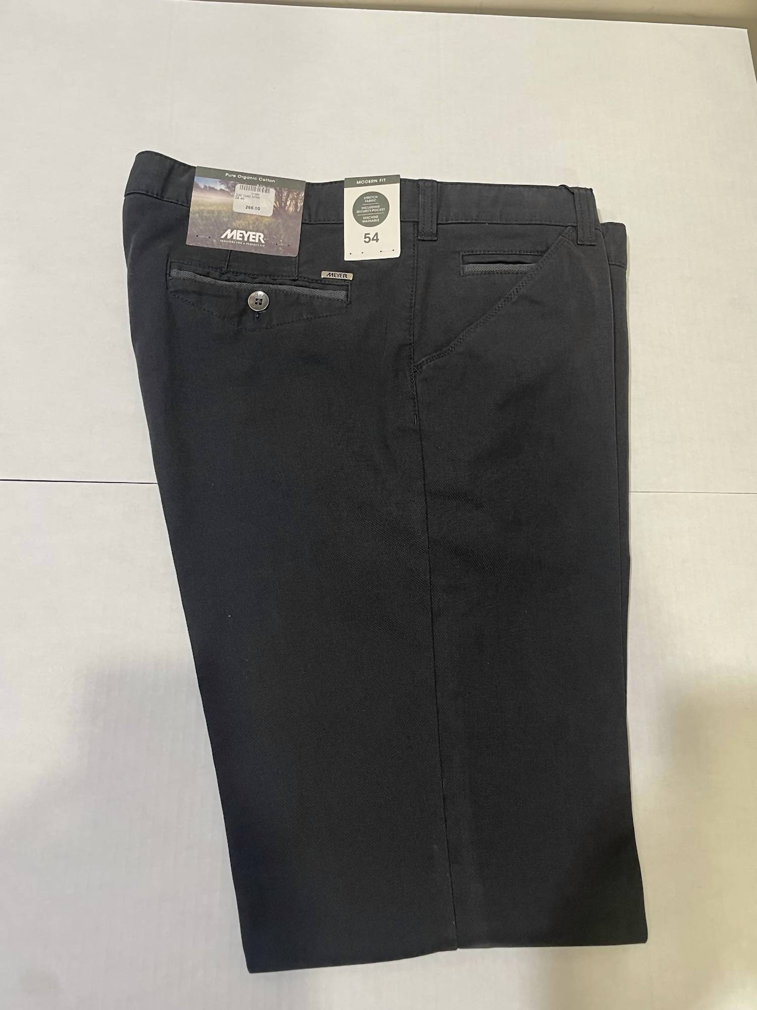 Introducing the Men's Chicago Chino Pant by Meyer, crafted for style and comfort in classic black. Designed with a slim fit and straight leg, these chinos are made from a supportive cotton blend of 98% organic cotton and 2% elastane, weighing 400g. They feature practical details such as diagonal pockets with a coin pocket, buttoned back pockets, and a hidden zip-up security pocket. These MEYER chinos ensure a secure fit with an elasticated waistband and secure zip closure, combining effortless elegance with functional wear. For care, simply machine wash and lay flat to dry.