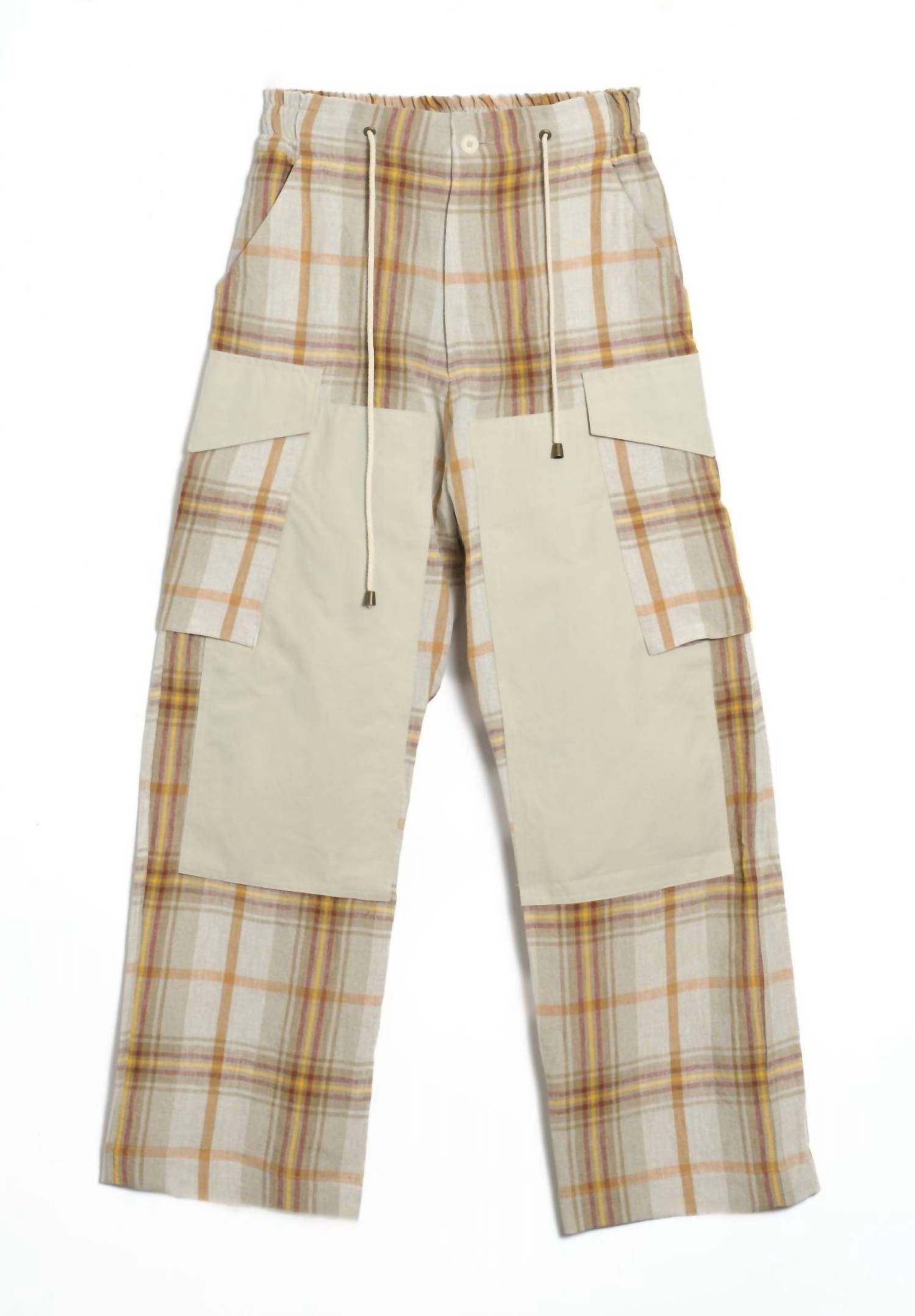These tartan cargo pants are crafted from 100% linen with contrasting 100% waxed cotton details. Designed with an elastic waistband and pullcord, they offer a comfortable, adjustable fit, while the textured fabric and functional pockets create a stylish, utilitarian look.