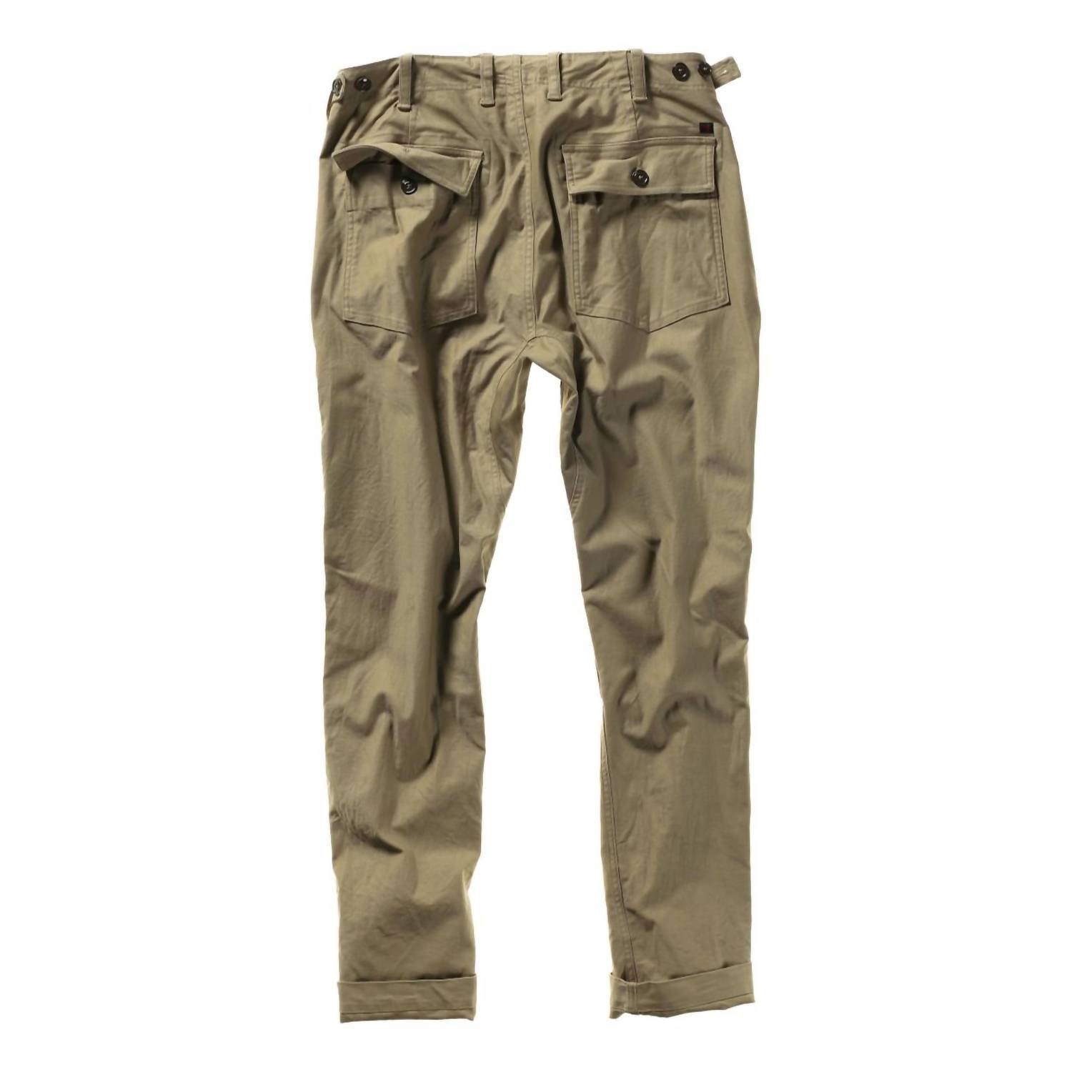 Meet the Military Supply Pant by Relwen, a perfect blend of vintage and contemporary style. Crafted from a durable yet flexible cotton blend of 97% cotton and 3% spandex, this khaki pant features a semi-tapered leg for a sleek, modern look. Inspired by the U.S. military utility trousers from the '50s and '60s, it boasts authentic details like rolled front pockets and spacious back pockets for practical styling. Closure: Button closure. Origin: Imported. Ideal for travel and fall fashion, this piece embodies the richness of 90s fashion trends.