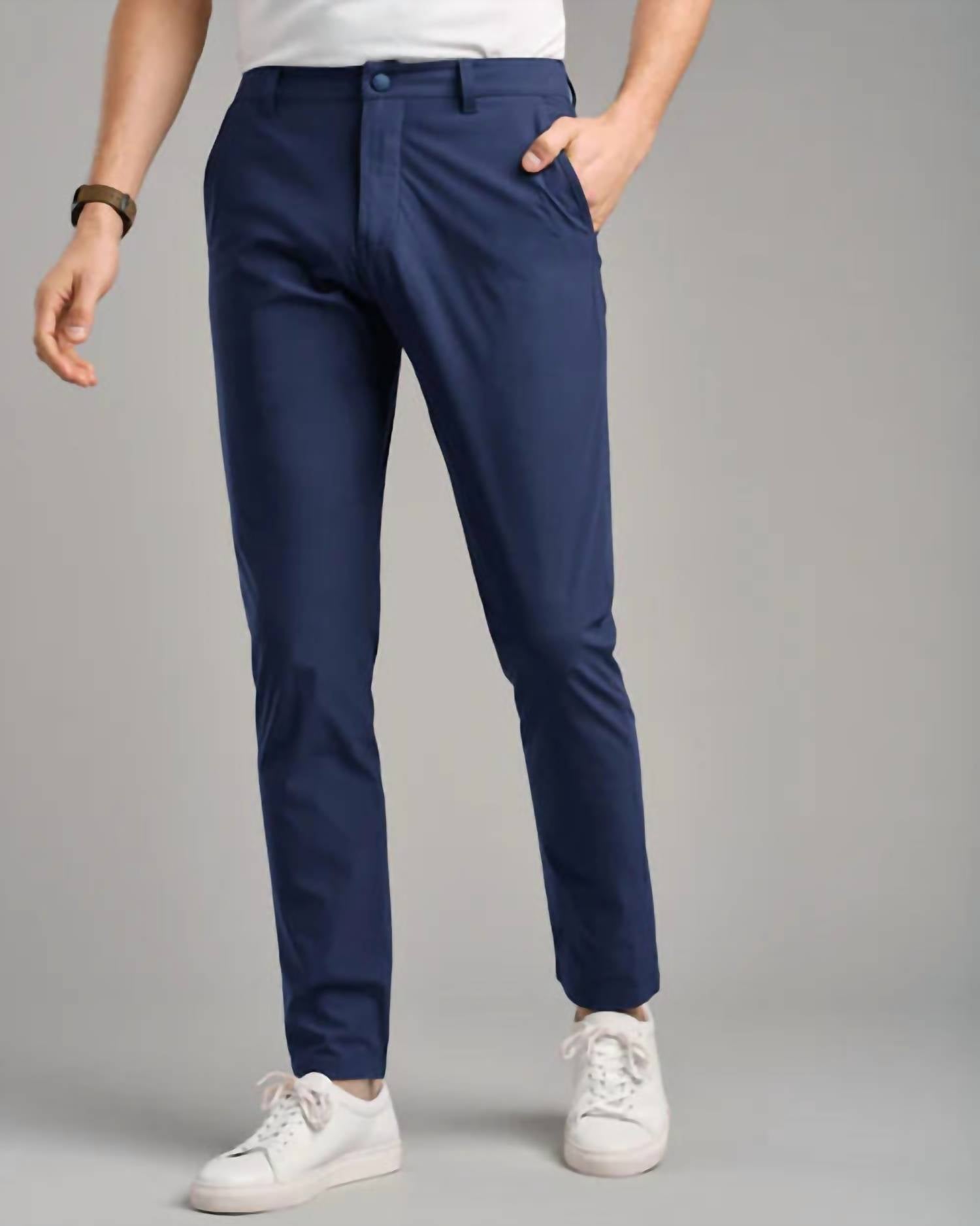 Discover the versatile Commuter Slim Pant by RHONE, perfect for every aspect of your day. These men's pants in True Navy are crafted with revolutionary Flex-Knit® fabric providing impressive 4-way stretch, ultimate comfort, and wrinkle resistance. Featuring a zip closure and practical pockets like a security zipper pocket and media pocket, these slim fit chinos are ideal for workwear and beyond. Care for this solid pattern staple with a simple hand wash.