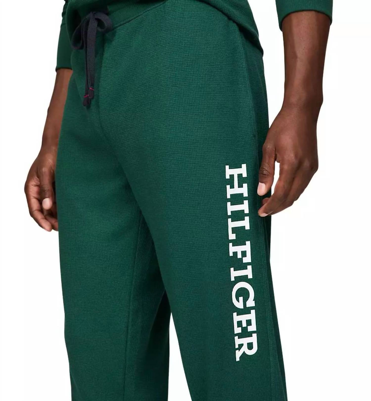 Experience ultimate comfort with the Tommy Hilfiger Thermal Logo Jogger Pajama Pant in a textured waffle knit, perfect for relaxed loungewear. Designed with a regular fit, these joggers feature a pull-on drawstring waistband and practical side-seam pockets, complemented by the iconic logo on the left leg. Crafted from a soft cotton blend of 60% cotton and 40% polyester, they offer a cozy feel in a stylish spruce color. Care is hassle-free with easy machine wash instructions, making them an ideal choice for fall travel and streetwear trends.