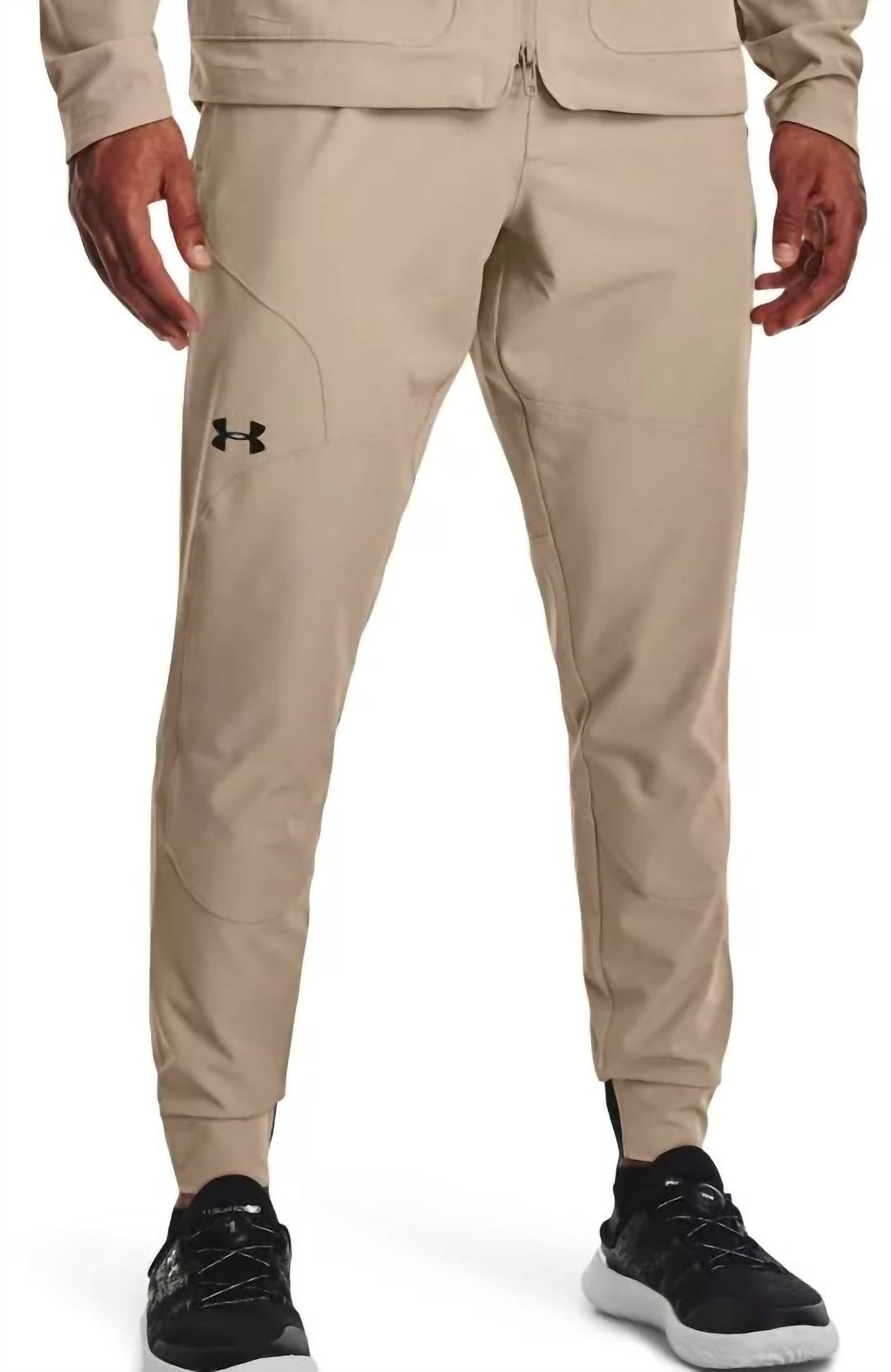 Step up your travel gear with the Men's Pull On Unstoppable Jogger by Under Armour, presented in a versatile tan color. These joggers feature a relaxed fit with a tapered leg design and an inseam of 29.75", perfect for a spring getaway. Constructed from 87% Polyester and 13% Elastane, the stretch-woven fabric offers tough durability while remaining lightweight and breathable. Finished with an encased elastic waistband with an internal drawcord, they also include open hand pockets and a secure zip back pocket. Care: Machine wash cold with like colors, tumble dry low.