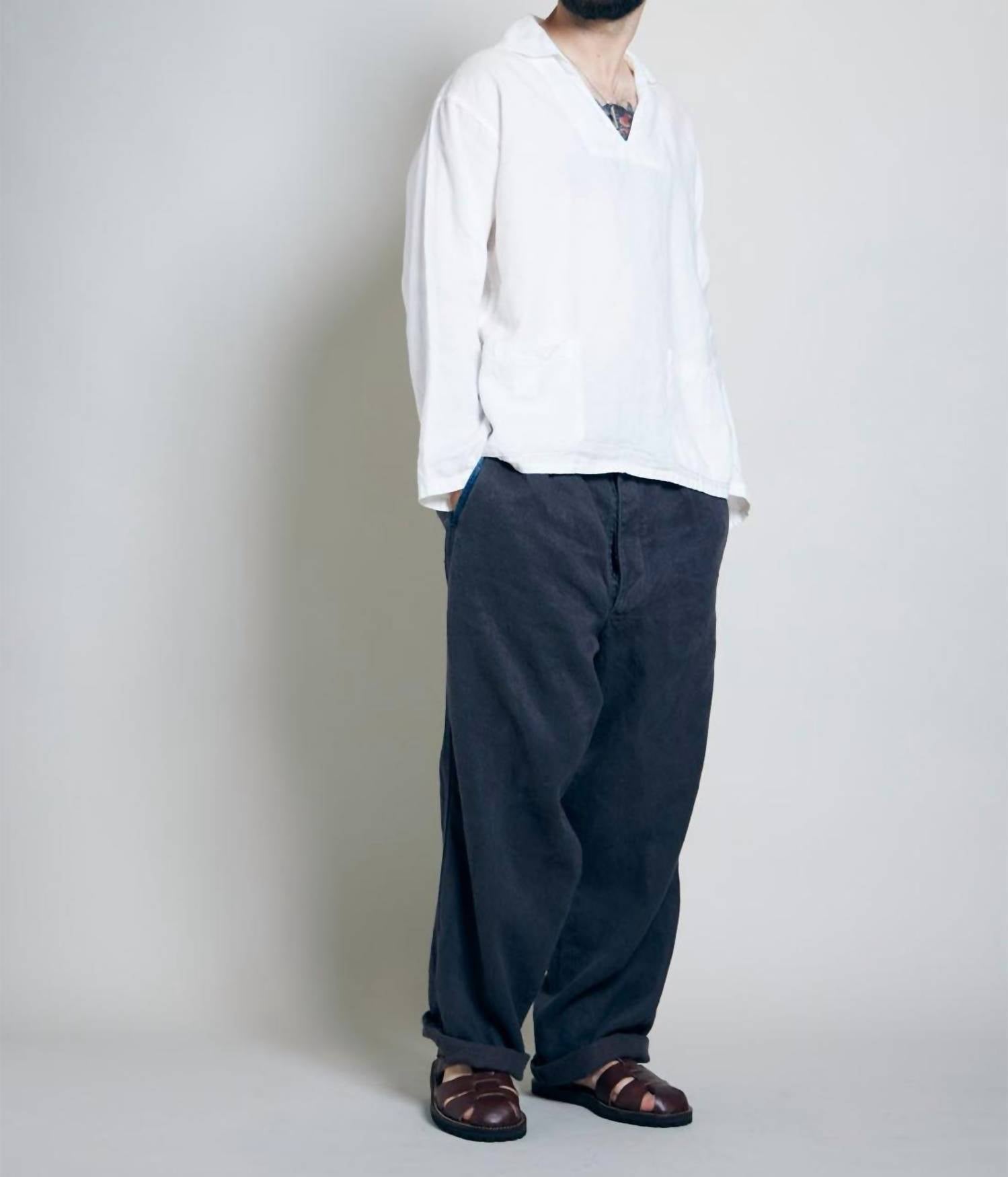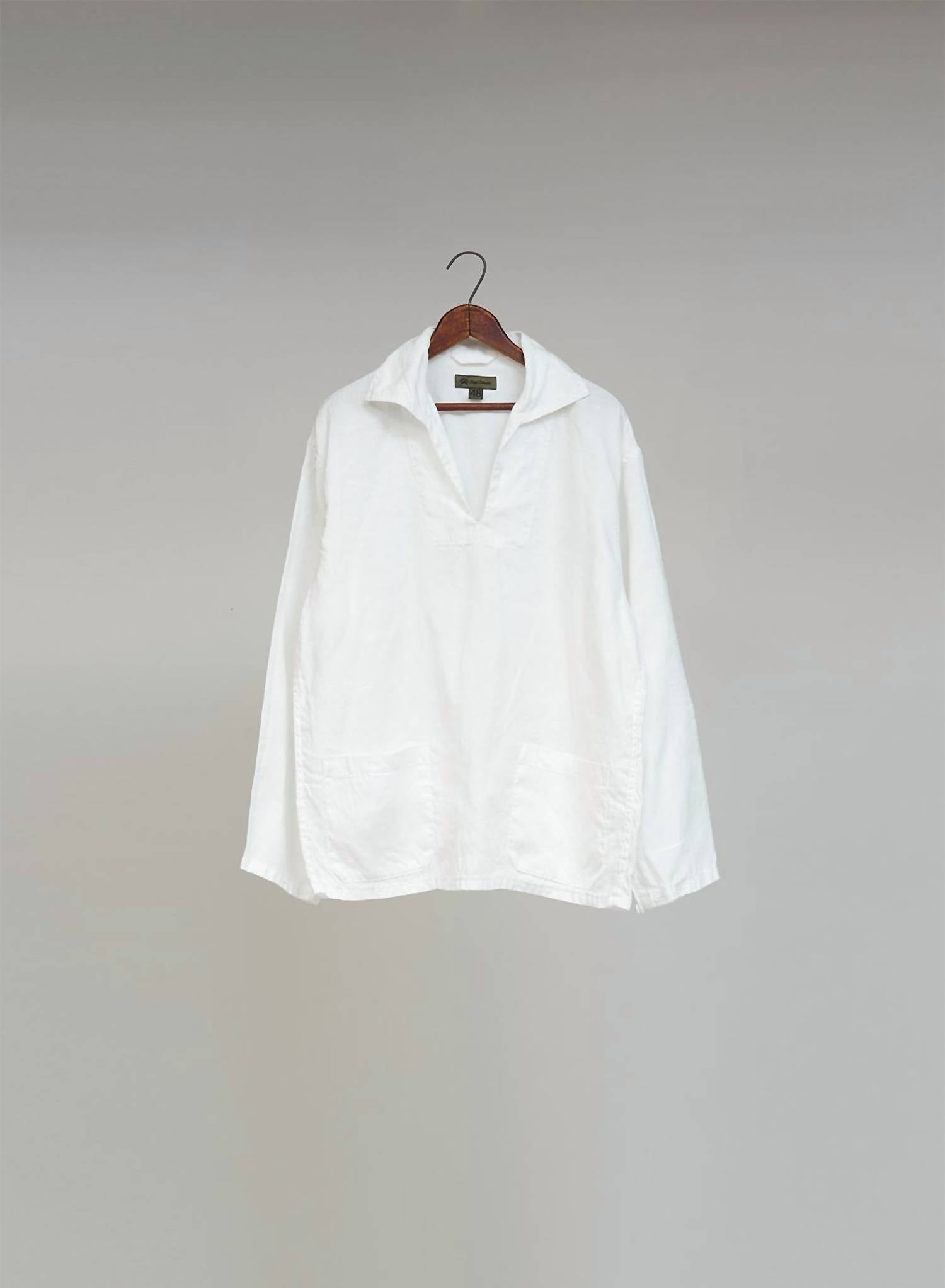 The Nigel Cabourn French Pullover Shirt in white combines timeless design with premium fabric for a distinguished look. Its long sleeves and V-neck collar are crafted from 100% hemp, ensuring sustainability and luxury. The shirt is thoughtfully designed with two patch pockets, reflecting inspiration from traditional French workwear. Made in Japan, it features a convenient pull-on closure for effortless wear.