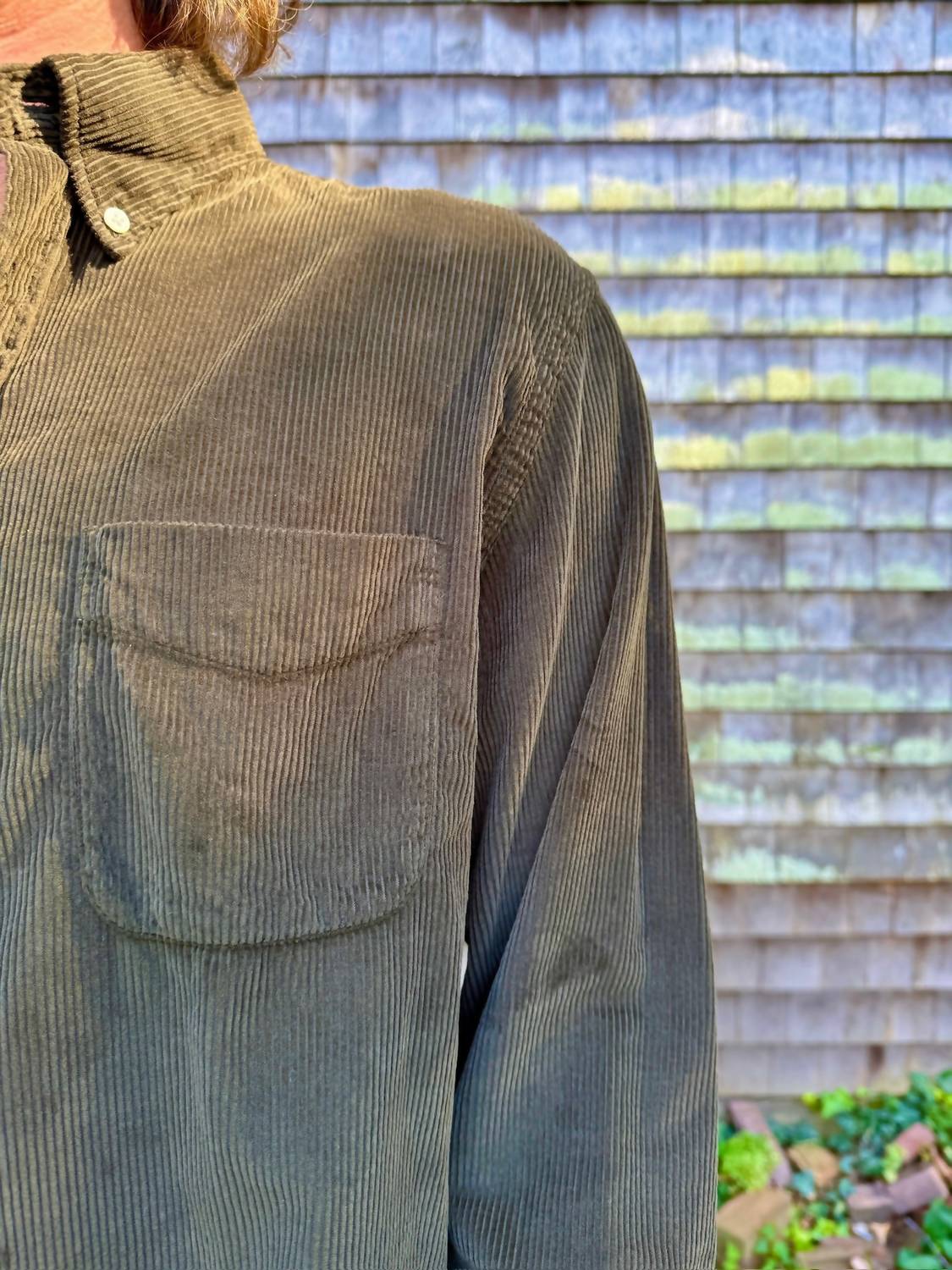Introducing the Pitt Tencel Cotton Shirt by Hartford, a staple of casual sophistication. Made in Morocco from lightweight 11 Wales corduroy, this long sleeve shirt offers a fluid fit with a soft buttoned collar. Designed in a rich Forest hue, it features mother-of-pearl button closure and two inverted pleats for added style. This shirt is perfect for fall, delivering preppy elegance at any holiday party.