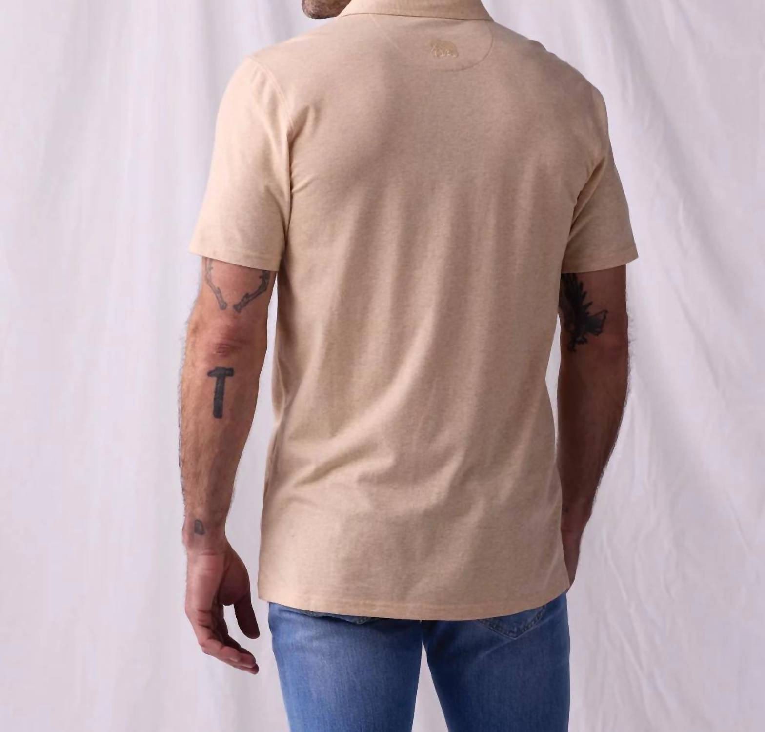 Presenting the Puremeso Active Polo Shirt by The Normal Brand, a stylish and versatile piece in a refreshing Iced Latte color, perfect for summer travel and workwear. This men's polo features short sleeves, a modern collar neckline, and a solid pattern with thoughtful detailing like a 2-ply collar, back half-moon detail, and a round chest pocket. Made from 57% Cotton, 38% Polyester, and 5% Spandex, it ensures comfort and flexibility. Closure: Pull-on. Care: Machine wash cold, gentle cycle with like colors, non-chlorine bleach if needed, tumble dry low, and cool iron as needed.