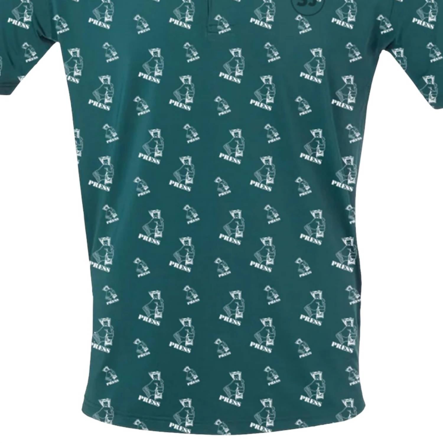 Introducing the Men's Golf Press Polo Shirt by SwingJuice, a style statement in vibrant pine. Featuring short sleeves with an open cuff and a three-button placket, this polo ensures a comfortable fit with an uneven vented hem. The fabric is made from 92% bamboo charcoal-infused microfiber polyester and 8% spandex, offering natural odor resistance and UPF 50+ sun protection. Care for this patterned polo is simple: machine wash cold and tumble dry low, so you can focus on your game.