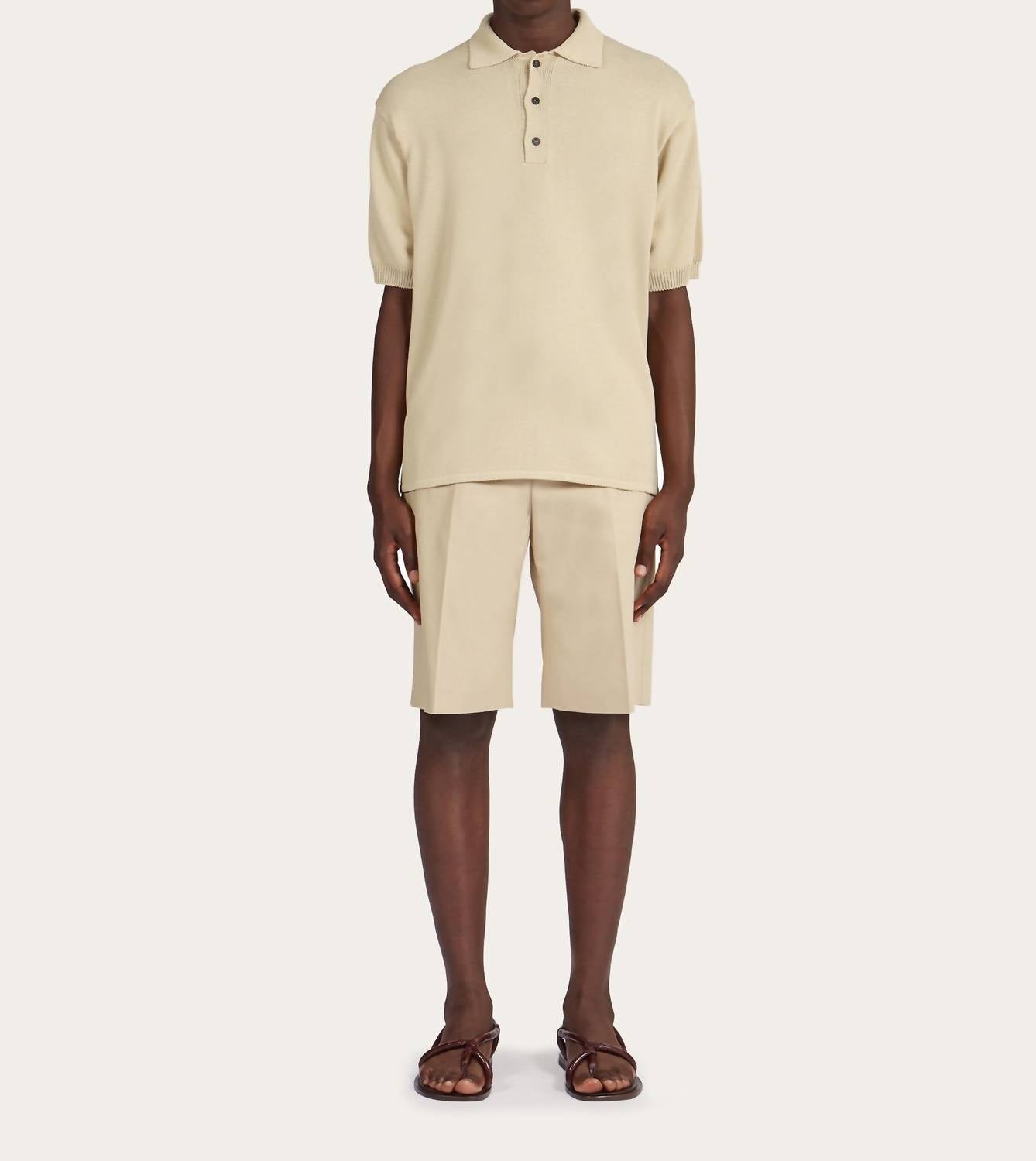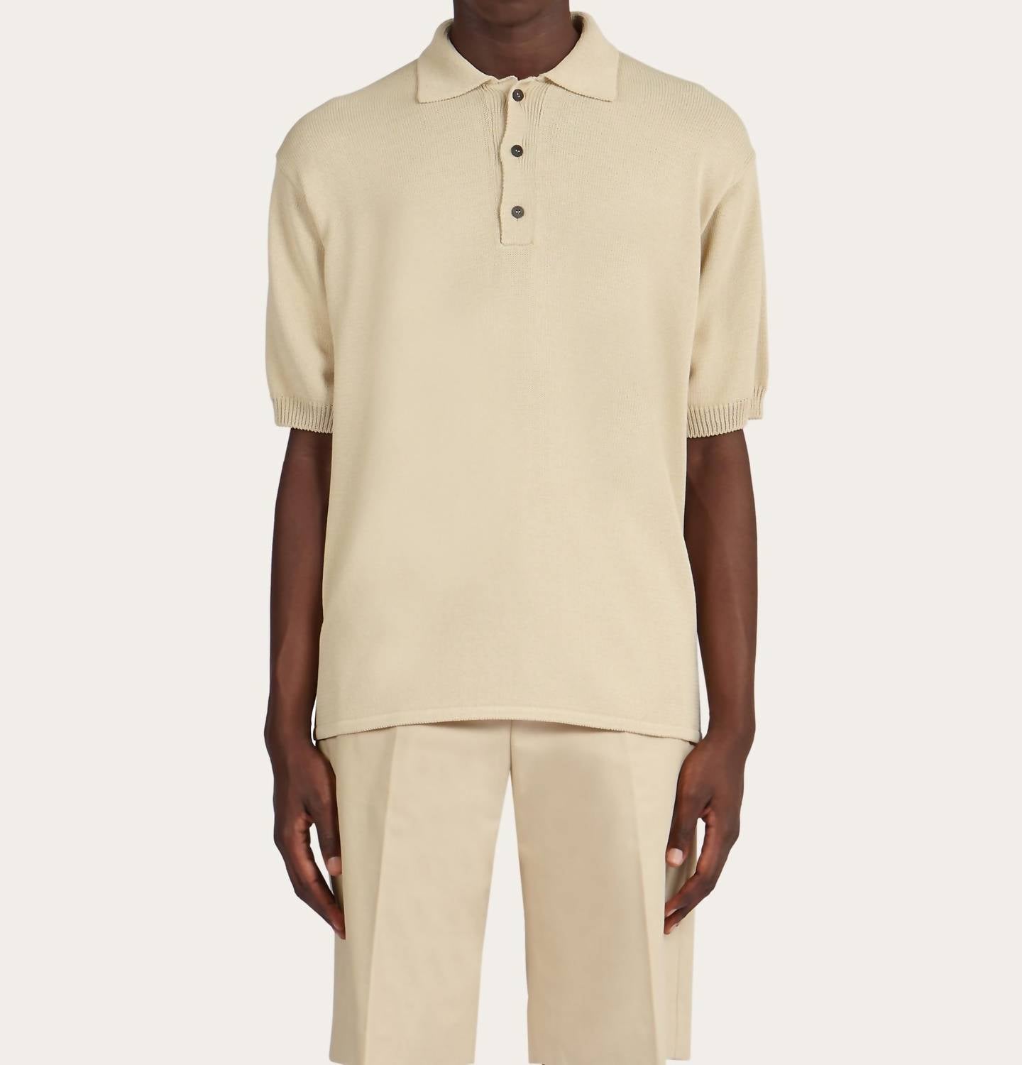 The Salvatore Ferragamo Short Sleeve Polo in white offers a refined blend of comfort and elegance. Featuring a classic three-button collar and elbow-length rib knit sleeves, this polo is crafted from a 56% viscose and 44% cotton blend, ensuring a soft and lightweight finish. Made in Italy, the design includes a custom metal tab at the back of the neck for a distinctive touch. Closure is provided by a button, making it perfect for a preppy travel look in the spring season.