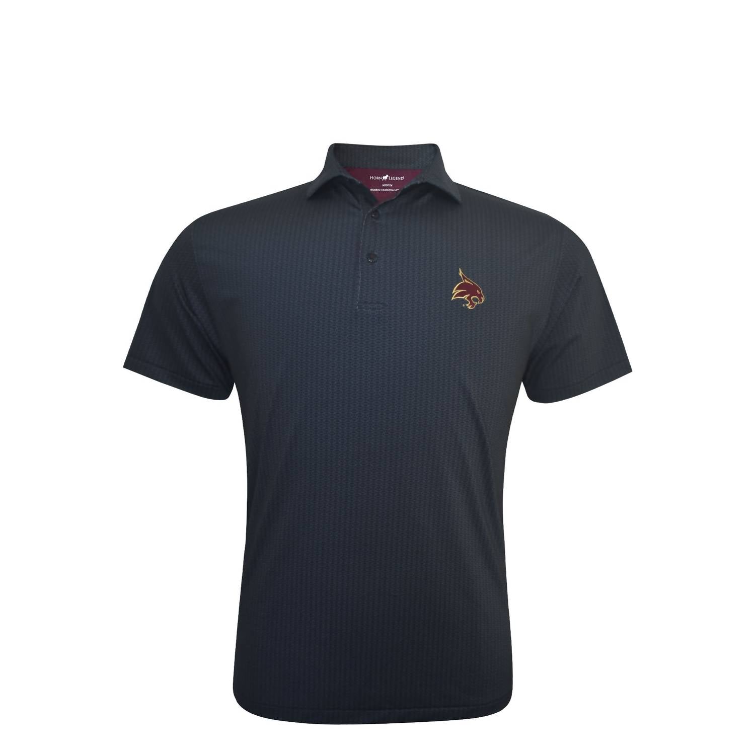 Elevate your style with the Texas State Football Weave Polo by Horn Legend, perfect for the back-to-school season. This short sleeve polo in Black/Charcoal offers a comfortable fit with its stretchable outer layer and patterned design. It is crafted from 88% polyester with bamboo charcoal and 12% spandex, featuring a UPF 50+ wicking fabric for moisture management. With a classic button closure and collar neckline, this polo requires machine wash on a gentle cycle and can be tumble dried on low.