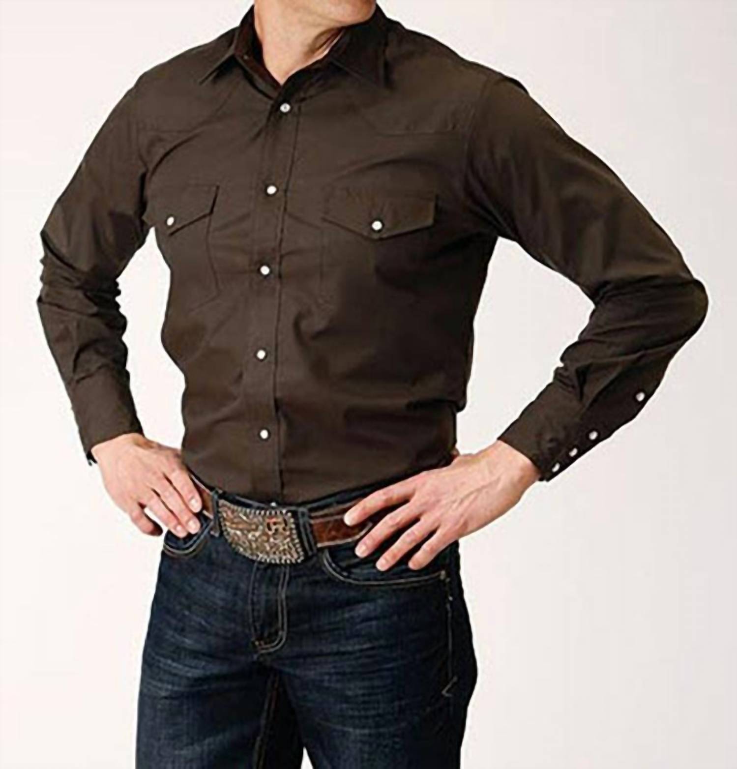 Stay stylishly comfortable with the Men's Classic Solid Western Shirt by ROPER, featuring long sleeves crafted from a durable cotton blend of 55% cotton and 45% polyester. The shirt's snap closure design ensures easy wear and offers the perfect solid brown tone for both casual and formal occasions. Embrace the unique western style with this versatile piece, complete with practical pockets and a classic collared neckline. Care is simple with machine wash and tumble dry instructions, making it an ideal choice for fall travels or any event on your calendar.