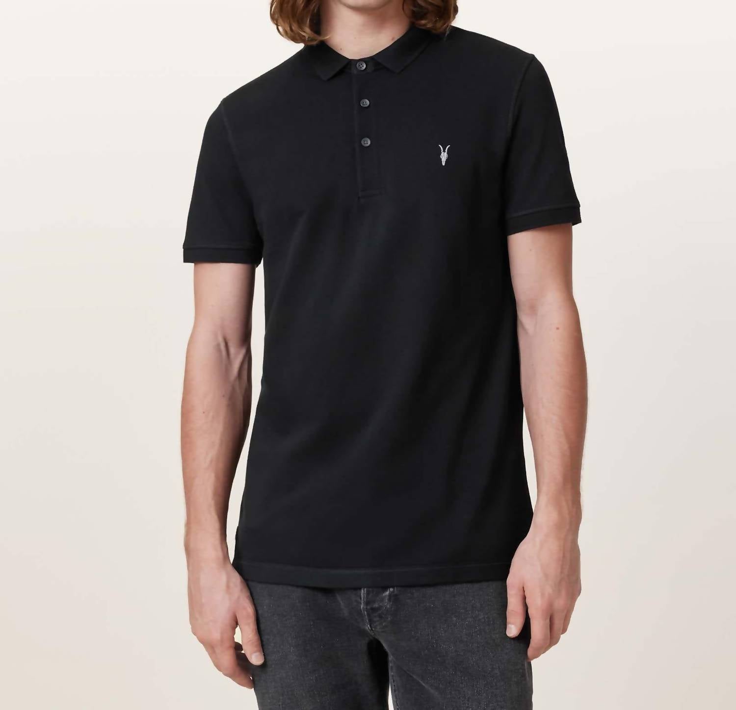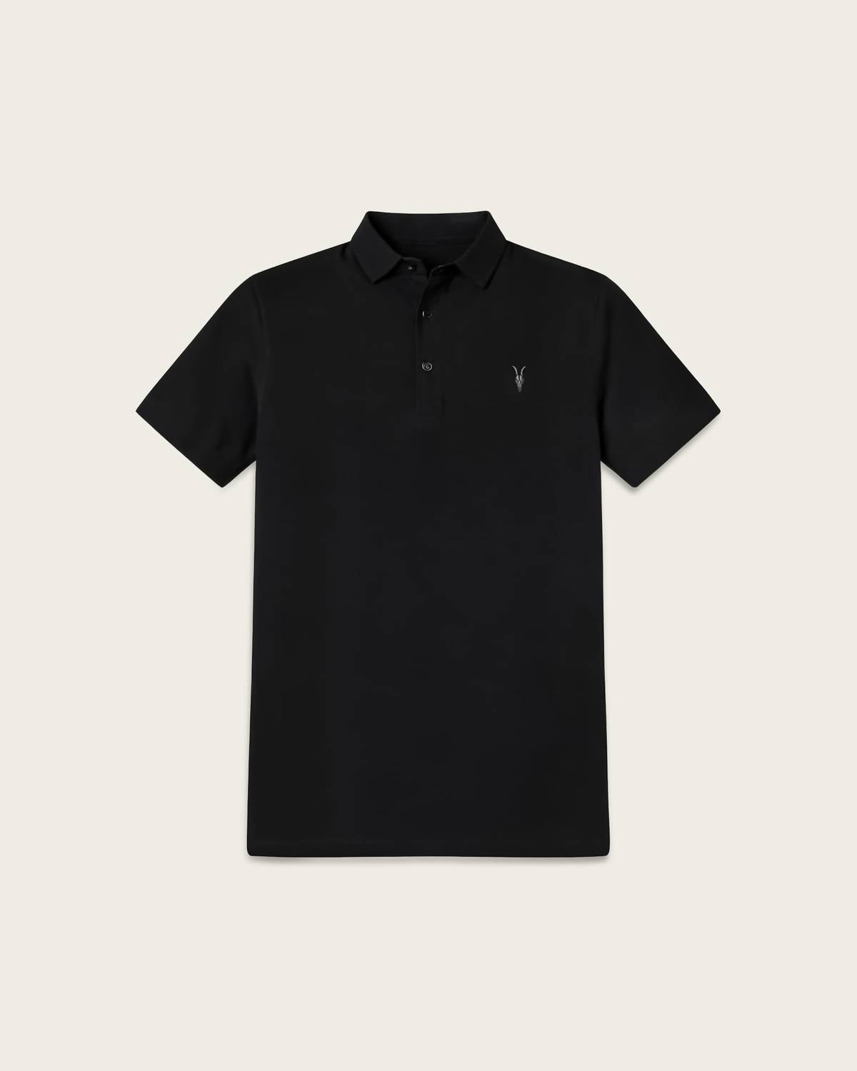 Introducing the Reform Short Sleeve Polo Shirt by AllSaints, a minimalist staple designed for spring adventures. Made from 100% breathable cotton, this slim-fit polo features short sleeves and a stylish classic collar with ribbed details. Adorning the chest is the signature Ramskull embroidery, lending a unique touch to its solid black design. Originating from Turkey, this polo sports a convenient button closure, while care instructions suggest machine washing inside out.