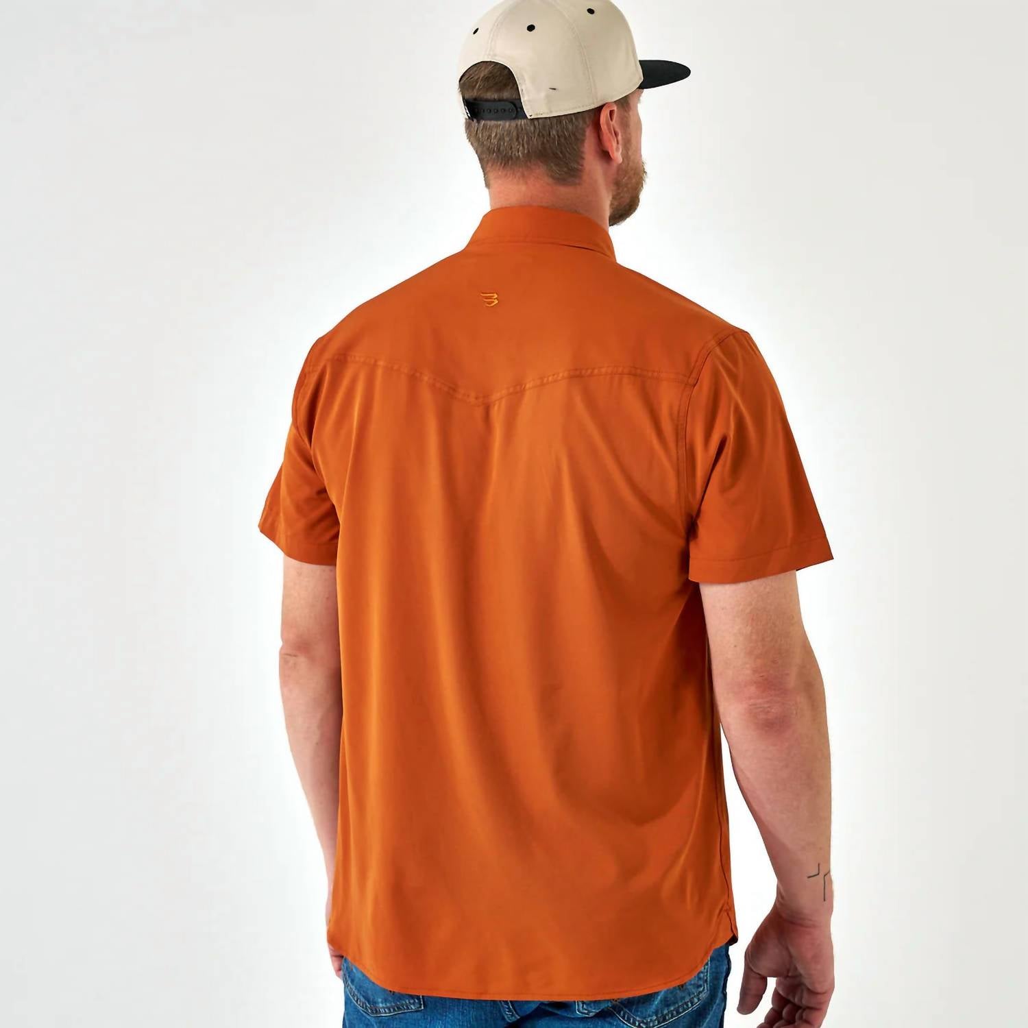 Discover the Men's Performance Western Shirt by BURLEBO, an ideal fusion of style and practicality crafted for the modern man. With short sleeves and a solid monochrome pattern in vibrant orange, this shirt is made from a premium blend of 90% Polyester and 10% Spandex. It features a spread collar, a left chest pocket, and a pearl snap button closure. Designed with lightweight performance fabric, it boasts quick-drying, moisture-wicking properties alongside four-way stretch for ultimate comfort. Care is simple with machine wash and tumble dry instructions.