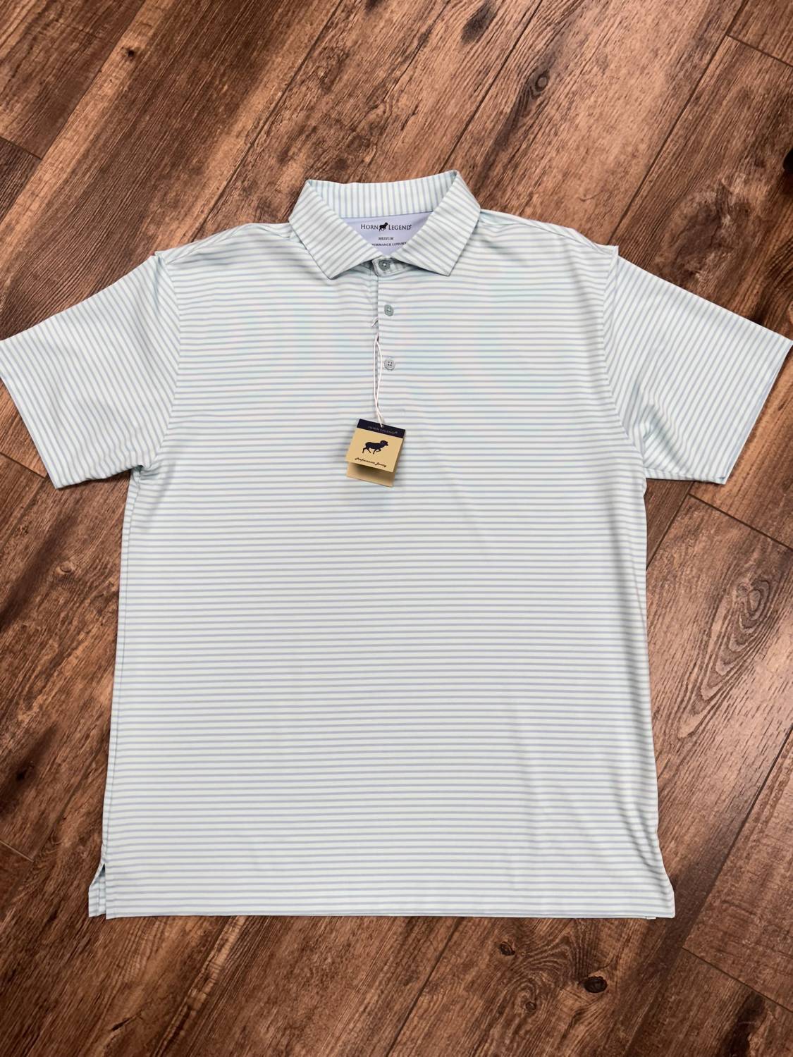 The Men's Performance Polo by Horn Legend is an ideal choice for a stylish summer vacation, featuring a refreshing Aqua/Serenity stripe pattern. Designed with short sleeves and a classic collar, it provides a relaxed fit perfect for any warm-weather occasion. This polo incorporates a button closure for a clean and polished look. Care instructions are not available, but this versatile piece captures the essence of 90s fashion in a contemporary silhouette.