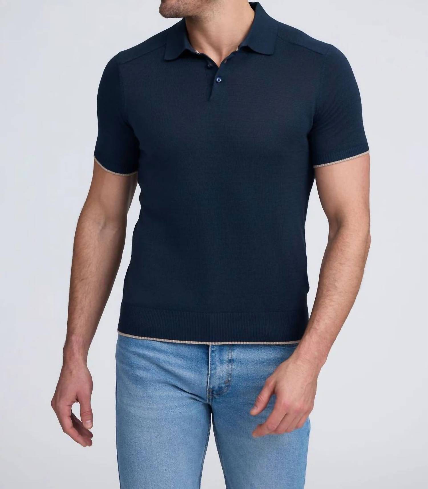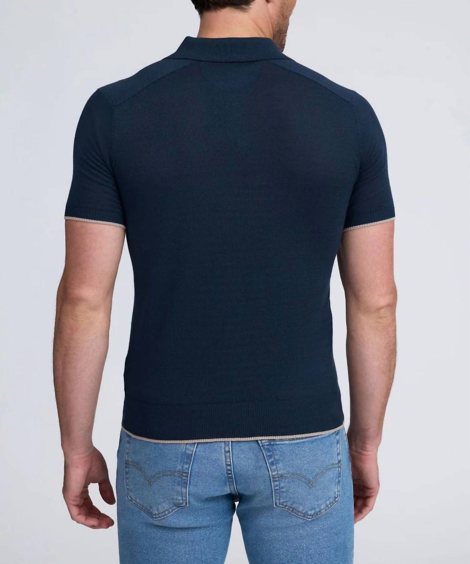 Introducing the Raffi Florian Cotton-modal Blend Polo Sweater in a sophisticated navy hue, perfect for adding a touch of elegance to your wardrobe. This short-sleeve polo sweater features a refined trim and a solid pattern that pairs effortlessly with both vibrant spring colors and classic neutrals. Made from a luxurious blend of 50% cotton and 50% modal, it offers a lightweight comfort suitable for any travel or workwear occasion. Closure: Pull-on. Care: Machine wash and lay flat to dry. Ideal for men seeking style and versatility.