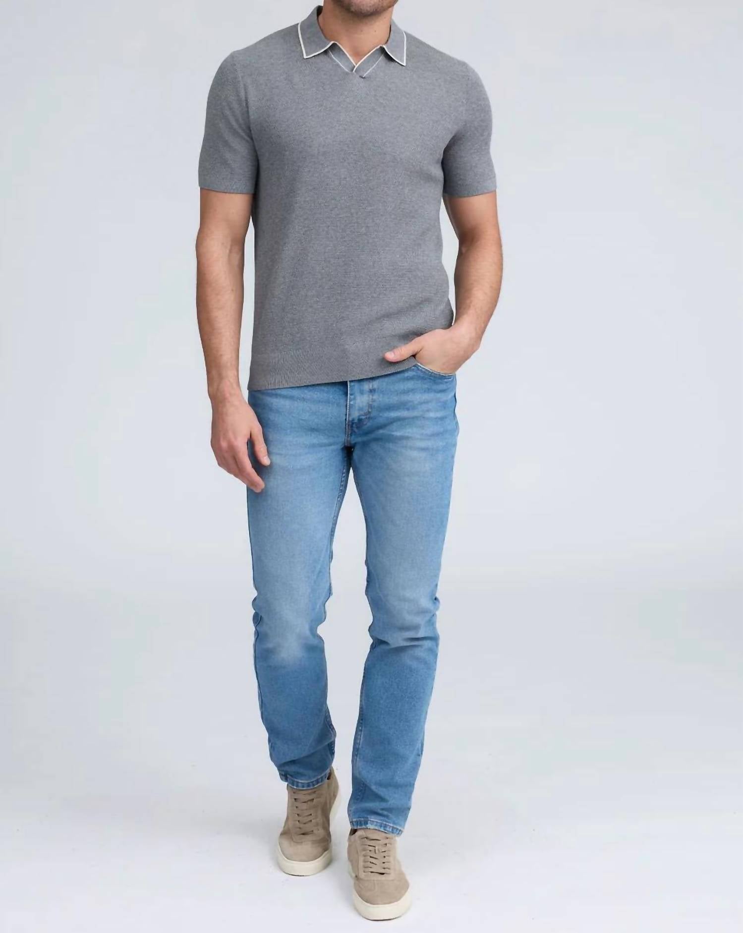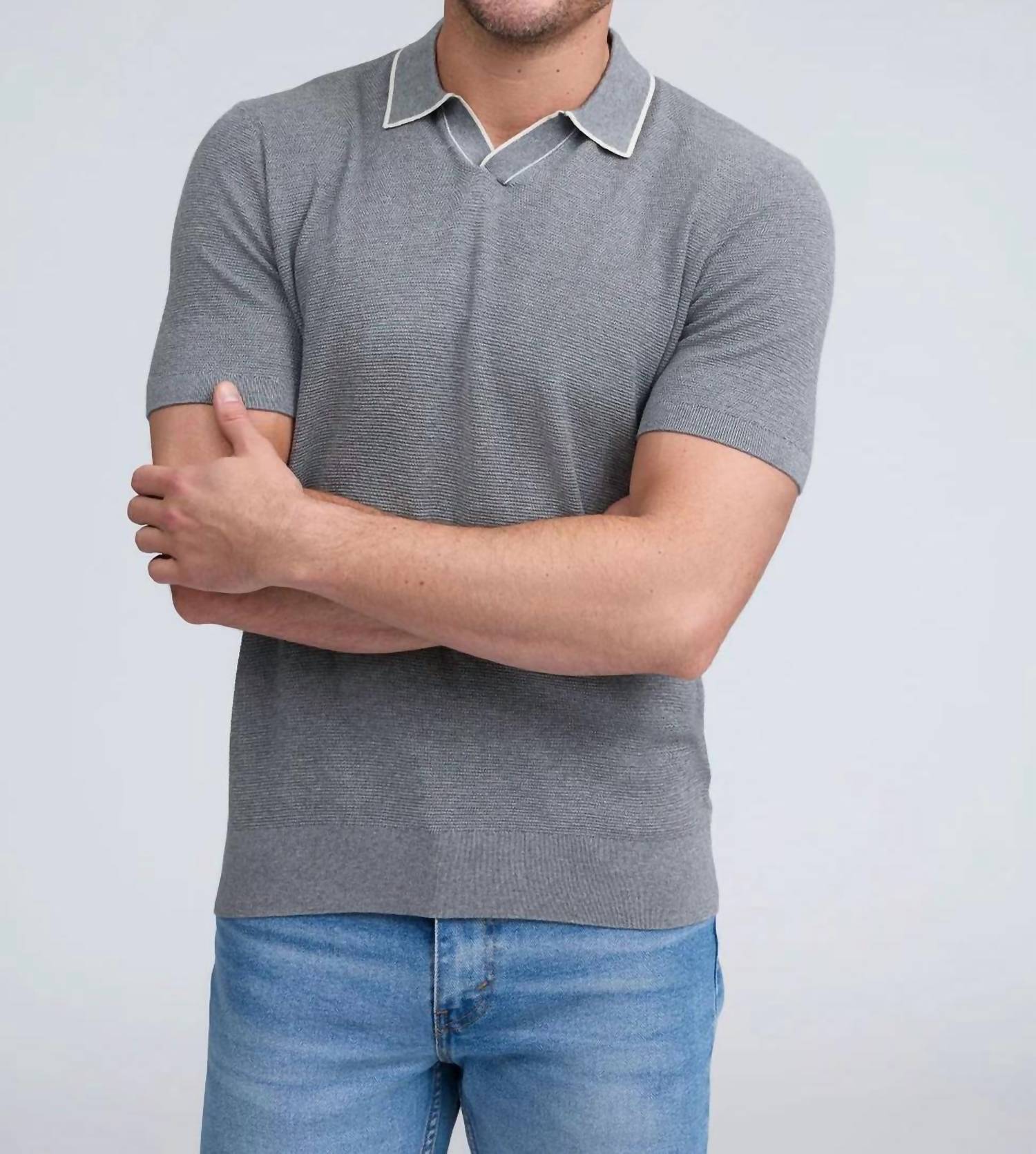 Introducing the Oliver Knitted Polo by Raffi, a sophisticated addition to any wardrobe in a stylish grey tone. With short sleeves and a Johnny collar, this polo showcases a refined V-neck design, accentuated by white trim. Crafted from a luxurious 55% Silk and 45% Cotton blend, it offers exceptional comfort and style. This pull-on polo is machine washable and should be laid flat to dry, making it perfect for travel or professional wear.