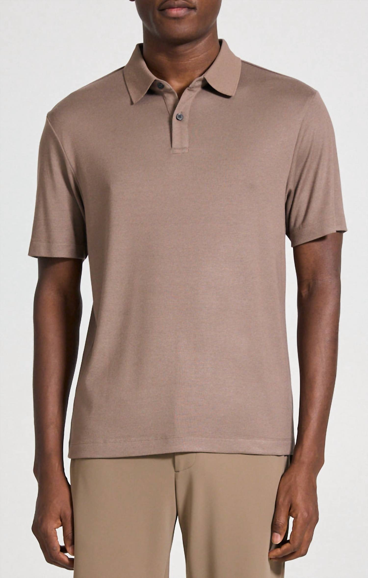 Introducing the Kayser Polo by Theory in Anemone Walnut—a modern twist on the classic men's polo. This stylish piece features short sleeves and a crisp collar, complete with a two-button closure for added sophistication. It's crafted from a blend of 72% Modal, 23% Recycled Polyester, and 5% Spandex, offering both comfort and a sustainable edge. For care, simply machine wash cold on a gentle cycle.