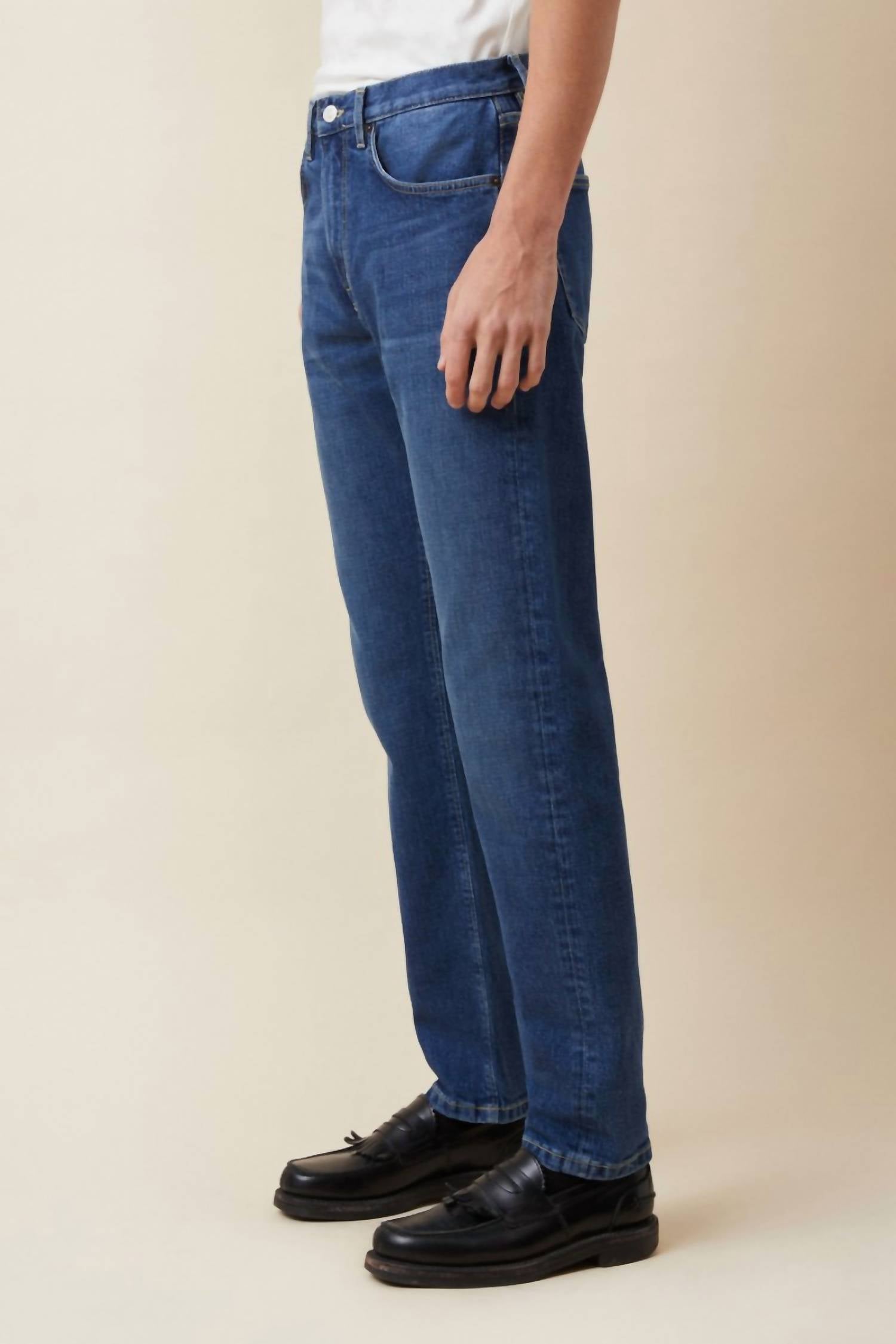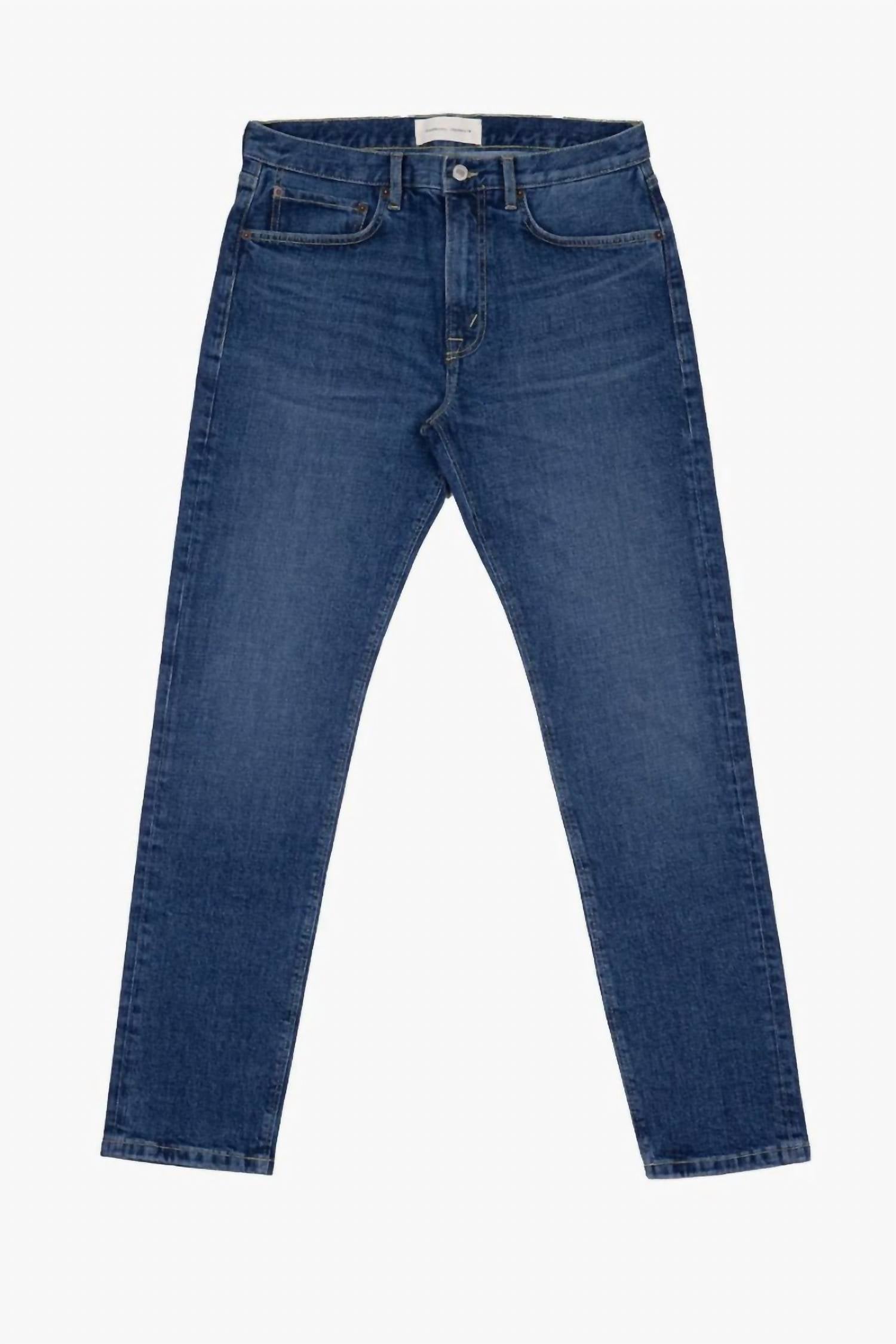 Meet the Mid Rise Tapered Denim Jeans by Jeanerica in a modern Tom Mid Blue Wash, delivering a vintage appeal with contemporary comfort. Crafted in a cotton blend comprising 98% organic cotton and 2% elastane, these jeans are slightly stretchy, promising ease in movement. The design features a mid-rise waist, a relaxed fit through the thigh, and a tapered leg that ends elegantly at the ankle. Closure is via a zip fly, and they are machine washable for easy care, embodying a blend of classic style and modern functionality.