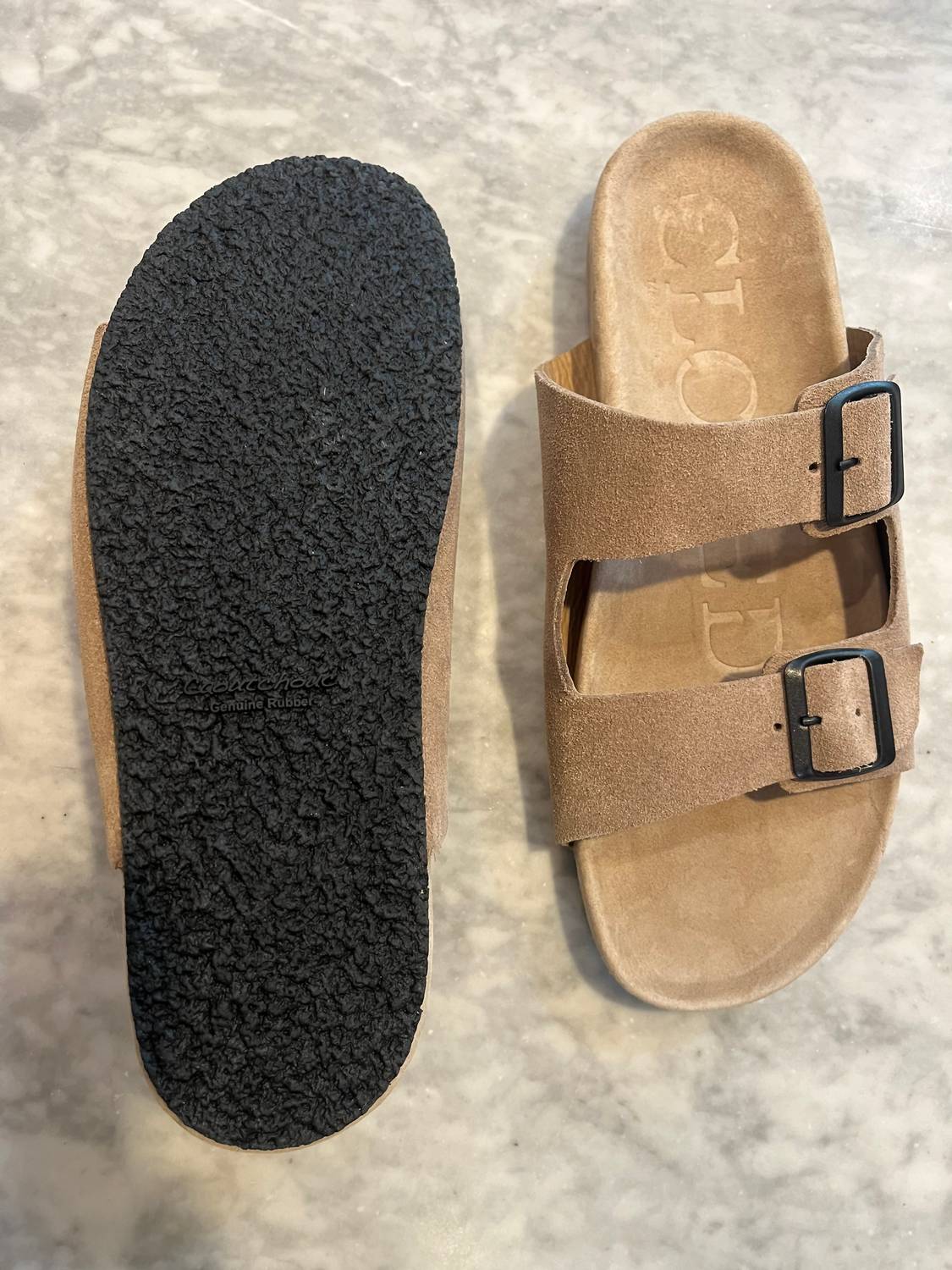 Embrace the minimalist trend with the Men's Two-strap Sandals by CLOSED, designed in a versatile taupe beige shade. Crafted with a suede molded footbed and genuine leather straps, these sandals offer both comfort and style. Featuring adjustable buckles for a customizable fit, they are perfect for summer travel and holiday adventures. These men's adult sandals, with a flat heel and round toe shape, are your go-to choice for the 4th of July celebrations.