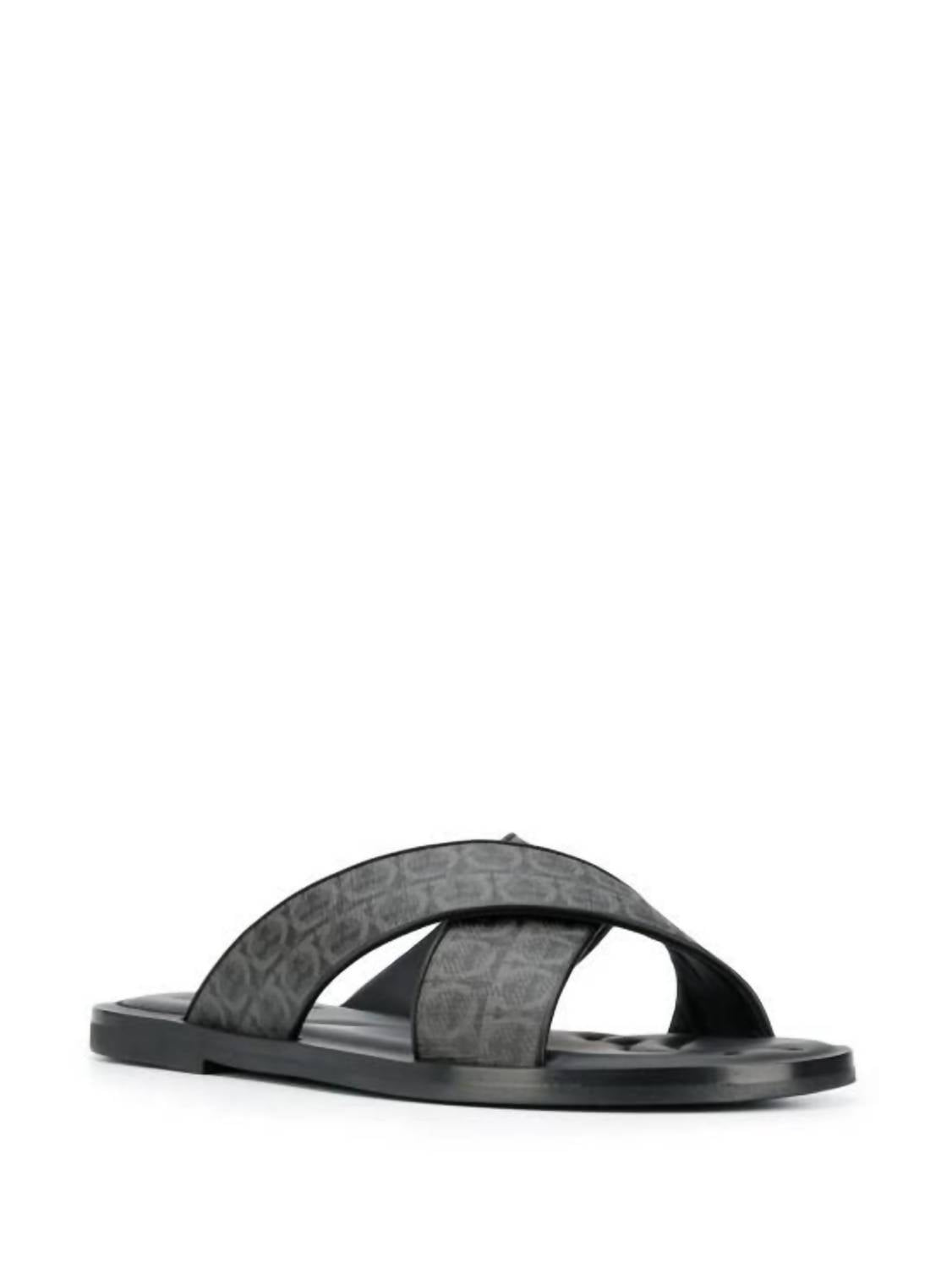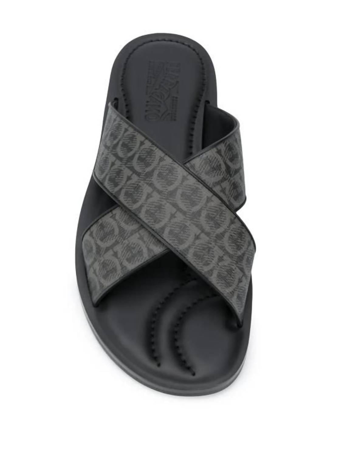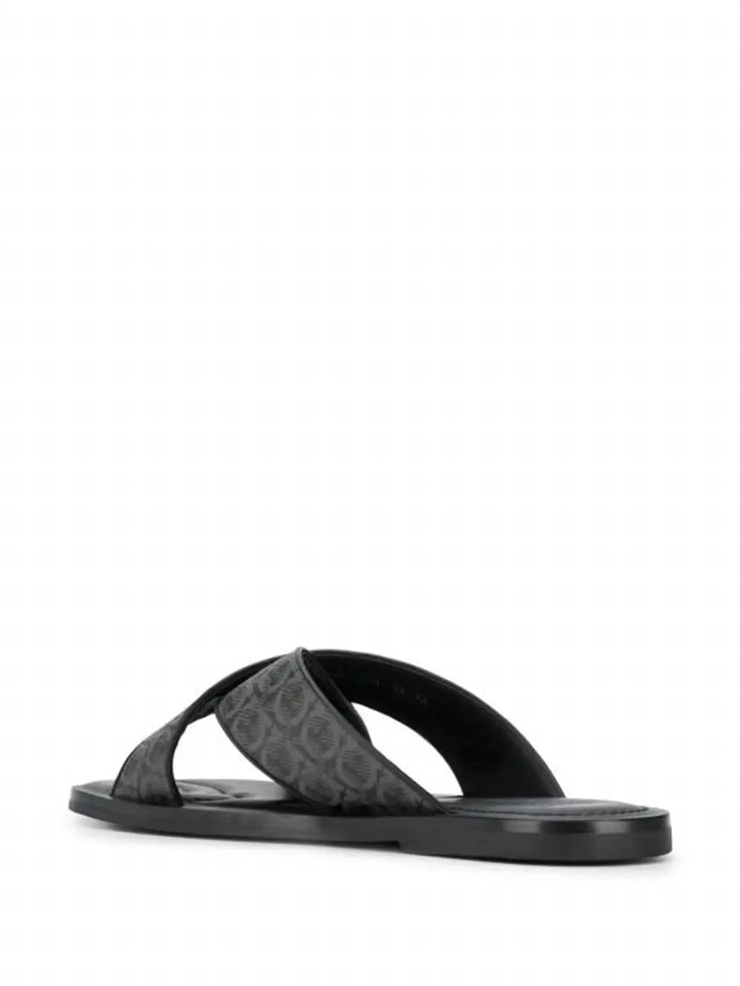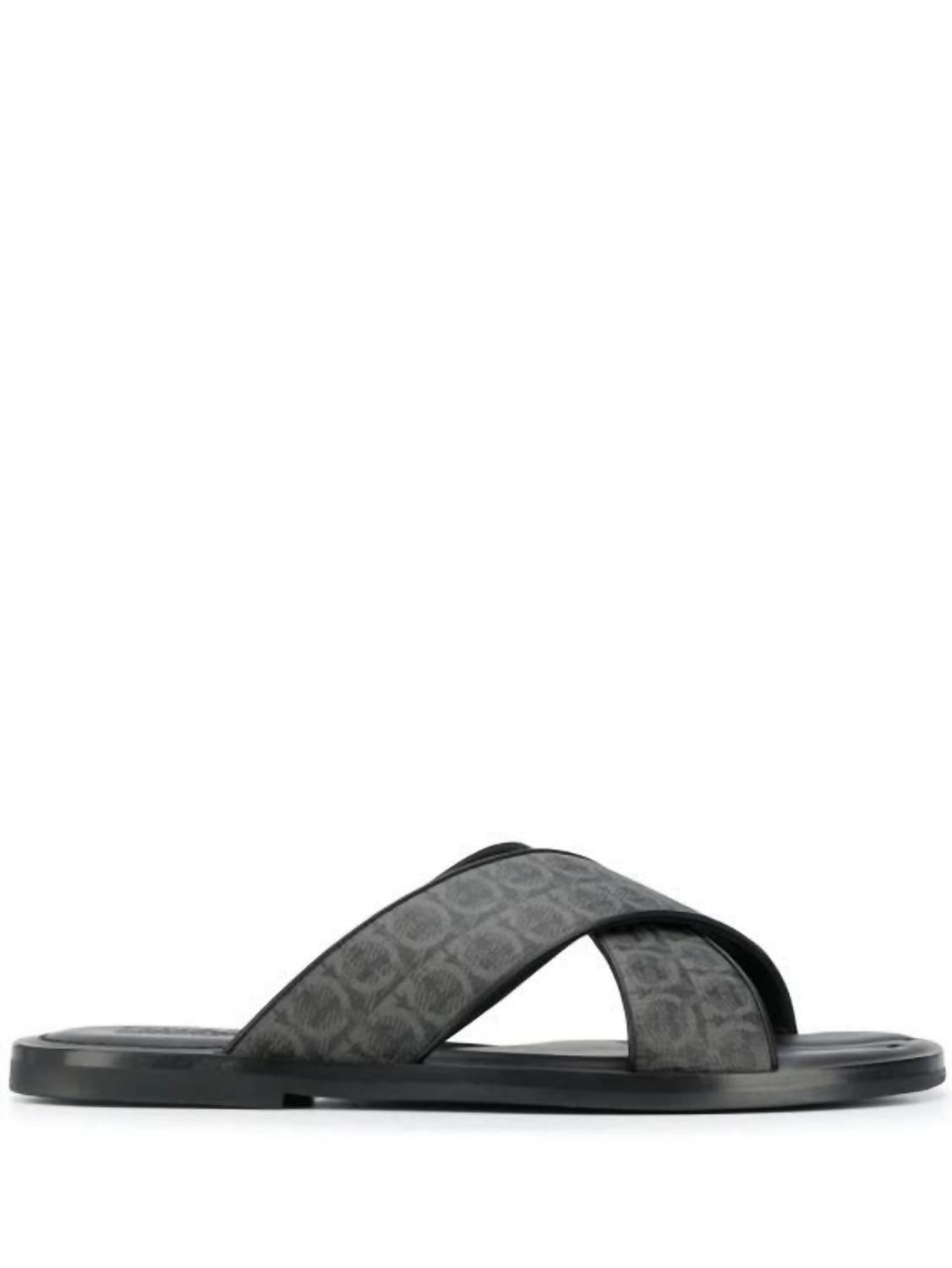 Step into luxury with the Men's Sion Gancini Sandals by Salvatore Ferragamo, perfect for the modern man seeking style and comfort. Crafted in Italy, these Grey/Black sandals feature a sleek saffiano finish with an all-over Gancini print, adding a hint of elegance to your summer wardrobe. With a flat heel height of 0.25 inches and a simple slide-on closure, they ensure ease and relaxation during your vacation. Upper materials include 39% Polyurethane, 38% Calfskin Leather, 13% Polyester, and 10% Cotton, with a 100% rubber lower. Care: Specialist clean only.