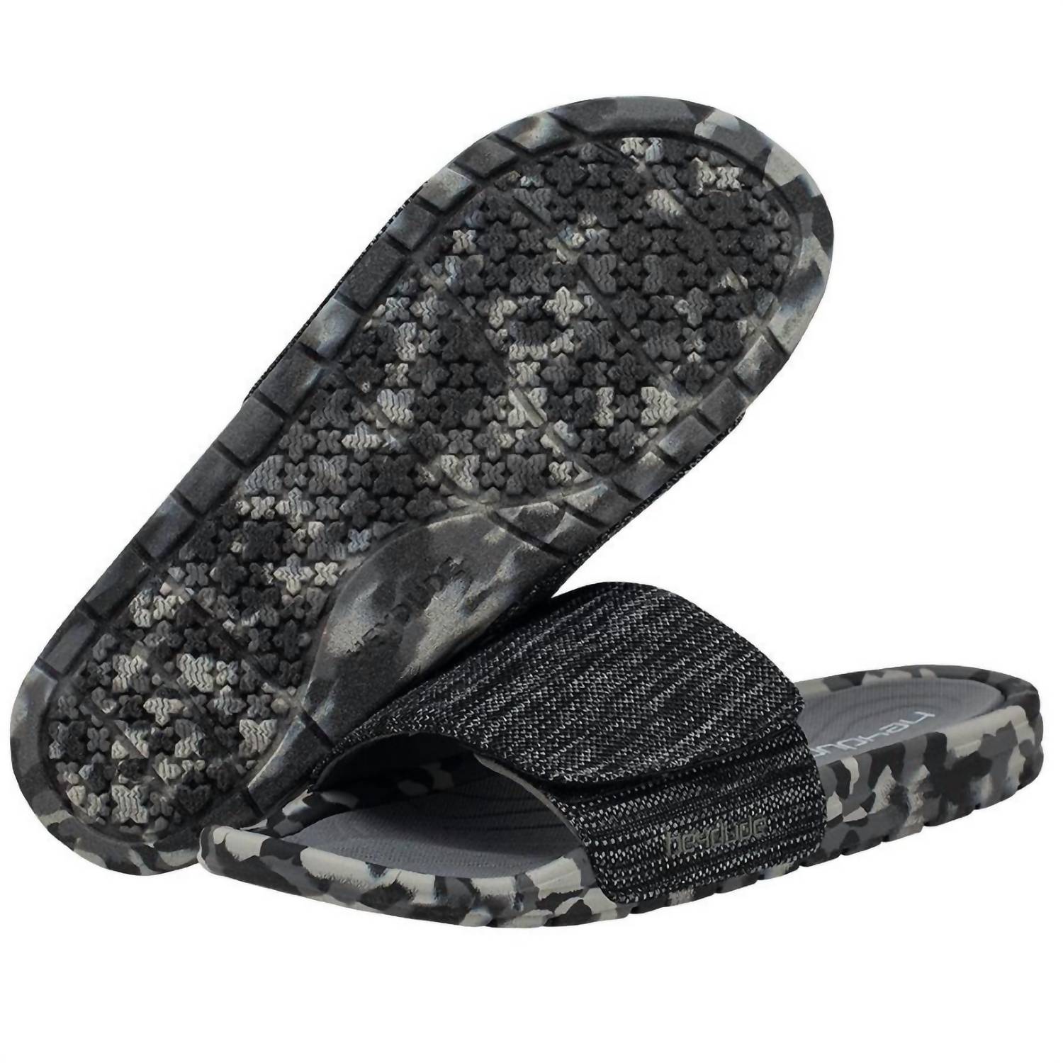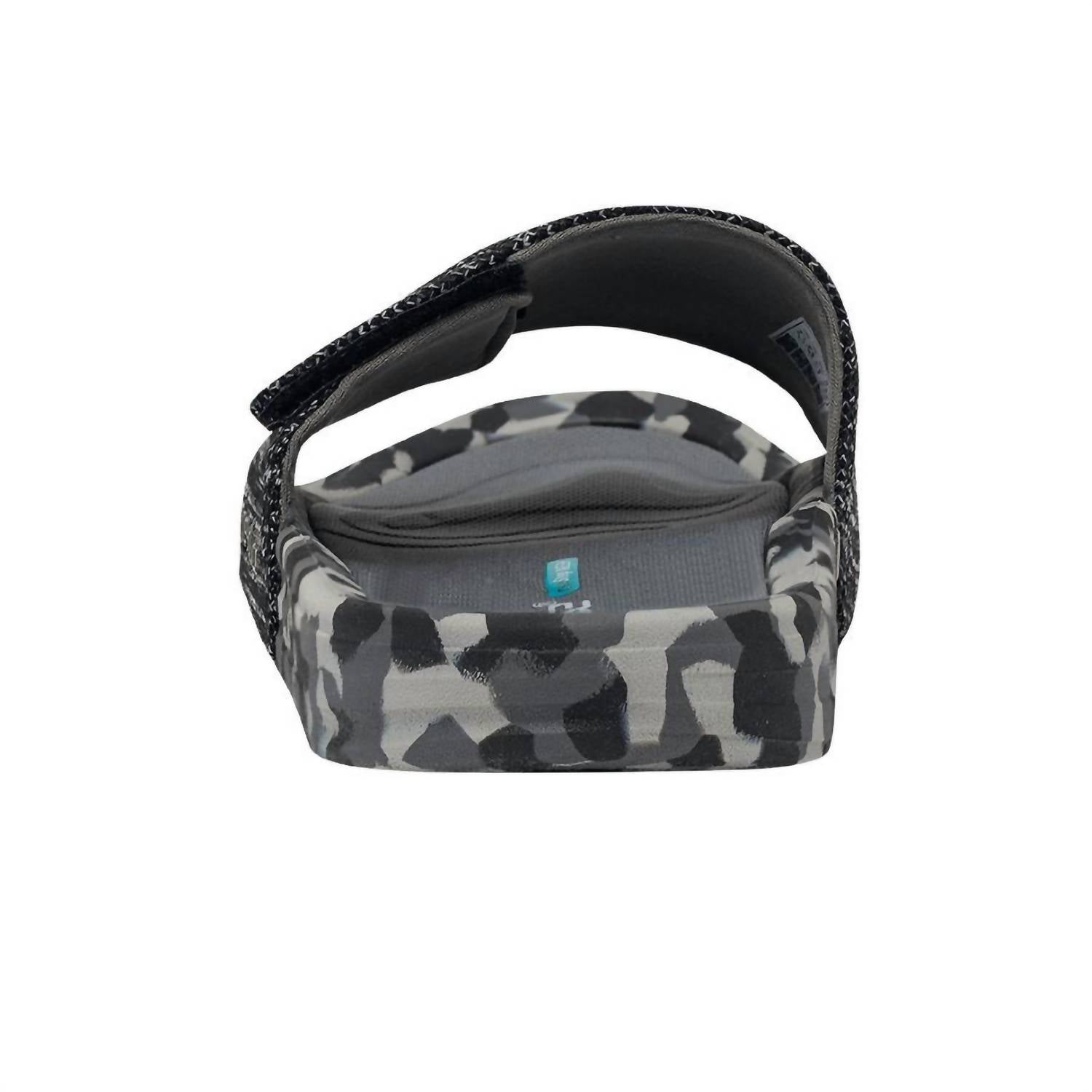 Introducing the Men's Youth Phoenix Sandal by HEY DUDE, designed for ultimate relaxation with its super light sole for maximum comfort. The smooth, mesh-lined foot-bed ensures a non-sticky feel, perfect for long-term summer wear. Featuring an adjustable Velcro upper, these sandals allow an easy, customized fit. Their open toe shape in a striking Dark Quarry Camo makes them ideal for any summer dinner party.