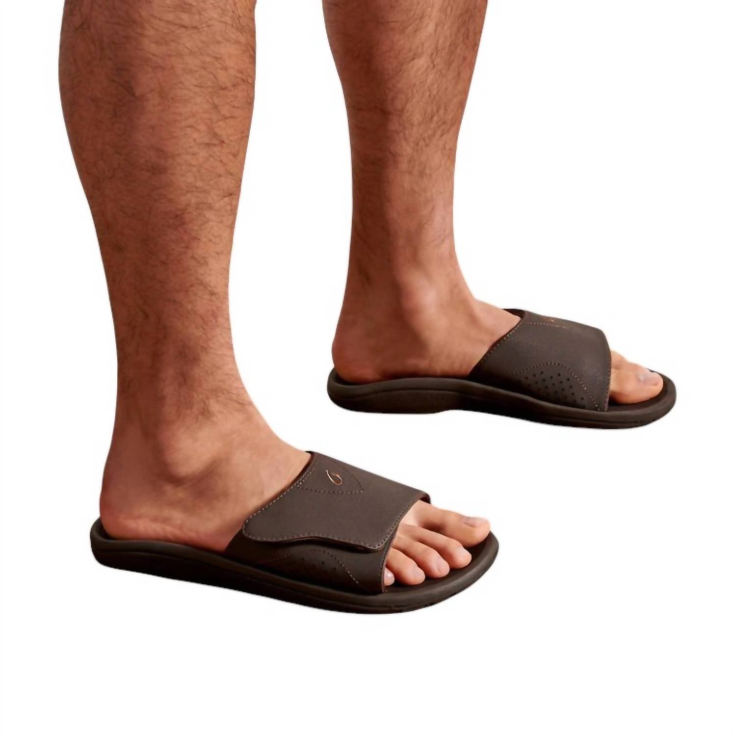 Discover the Men's Nalu Slide Sandals by OluKai, a perfect blend of comfort and versatility in a sleek Dark Java color. These sandals feature an adjustable synthetic strap with quick-drying jersey knit lining and a convenient micro hook-and-loop closure, ensuring they stay secure, even when wet. Designed with an open toe, they boast a cushioned footbed for added comfort and are lightweight yet durable, making them ideal for beach adventures. Transition seamlessly from surf to street with this water-resistant sandal perfect for any occasion.