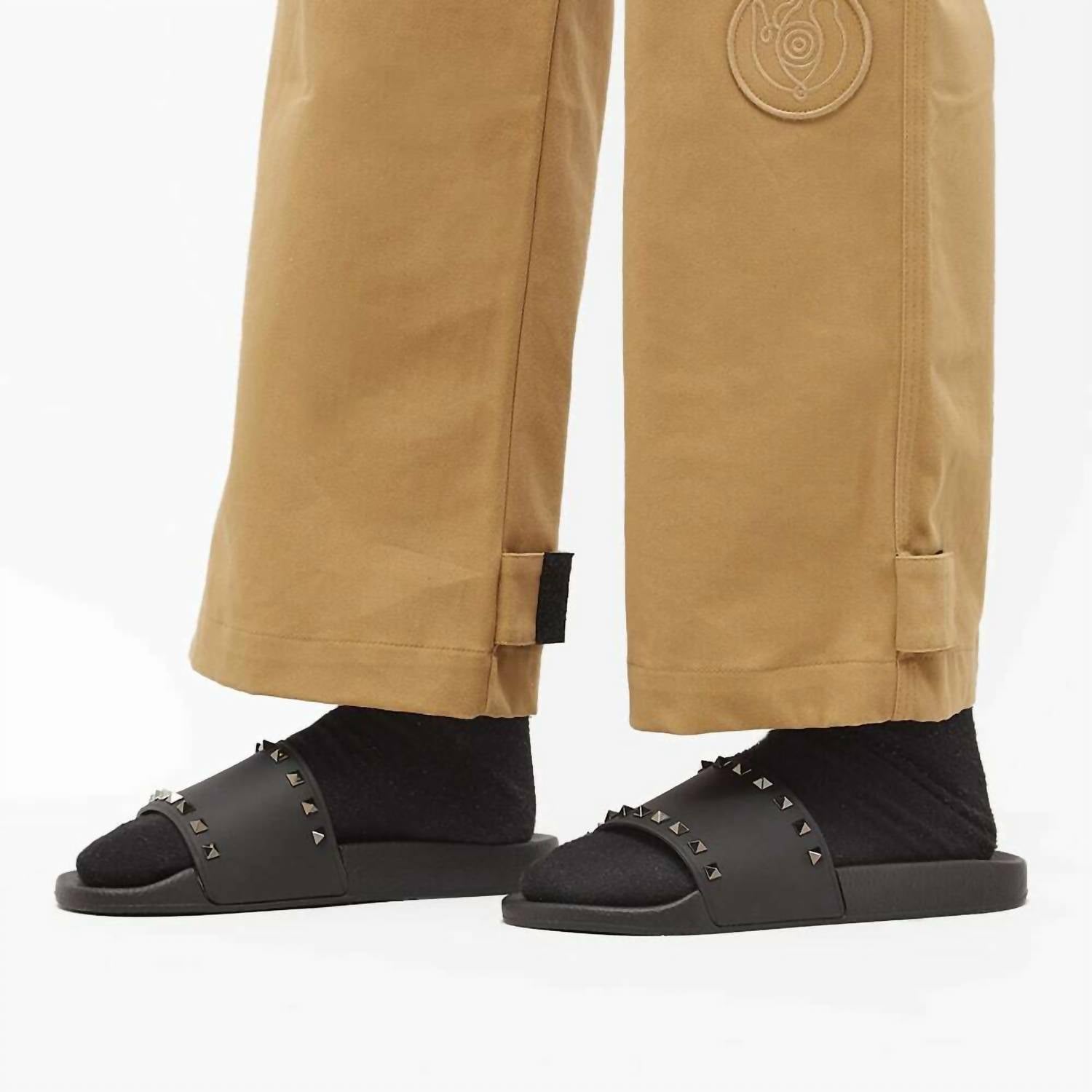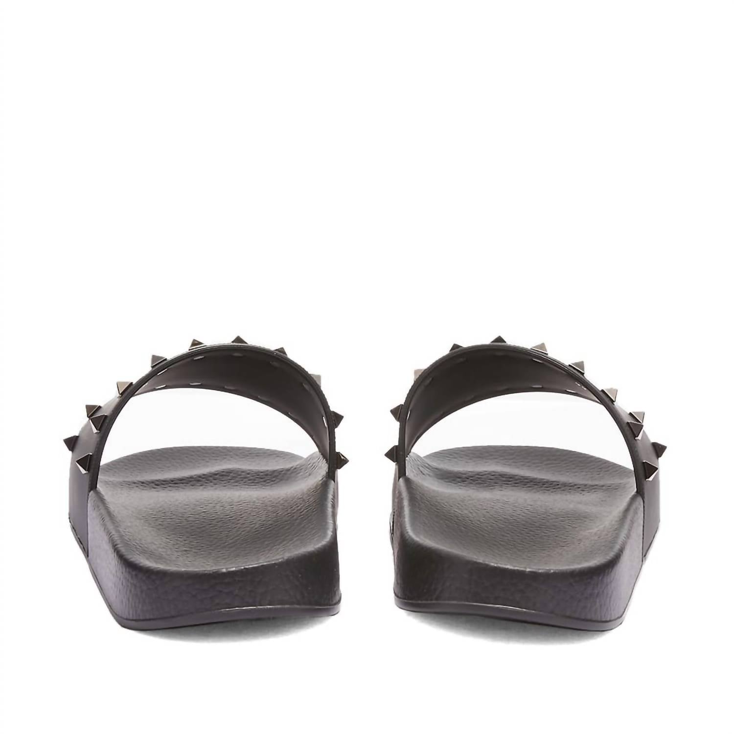 Step into style with the Valentino Men's Rockstud Pool Slides, designed for both comfort and edge. Crafted in black rubber and enhanced with striking metal studs, these slides boast a round toe and a molded insole for a perfect fit. Designed for spring and streetwear trends, they are an ideal choice for vacation looks. Whether it's Easter or any other occasion, these slides add a touch of bold elegance to your ensemble.