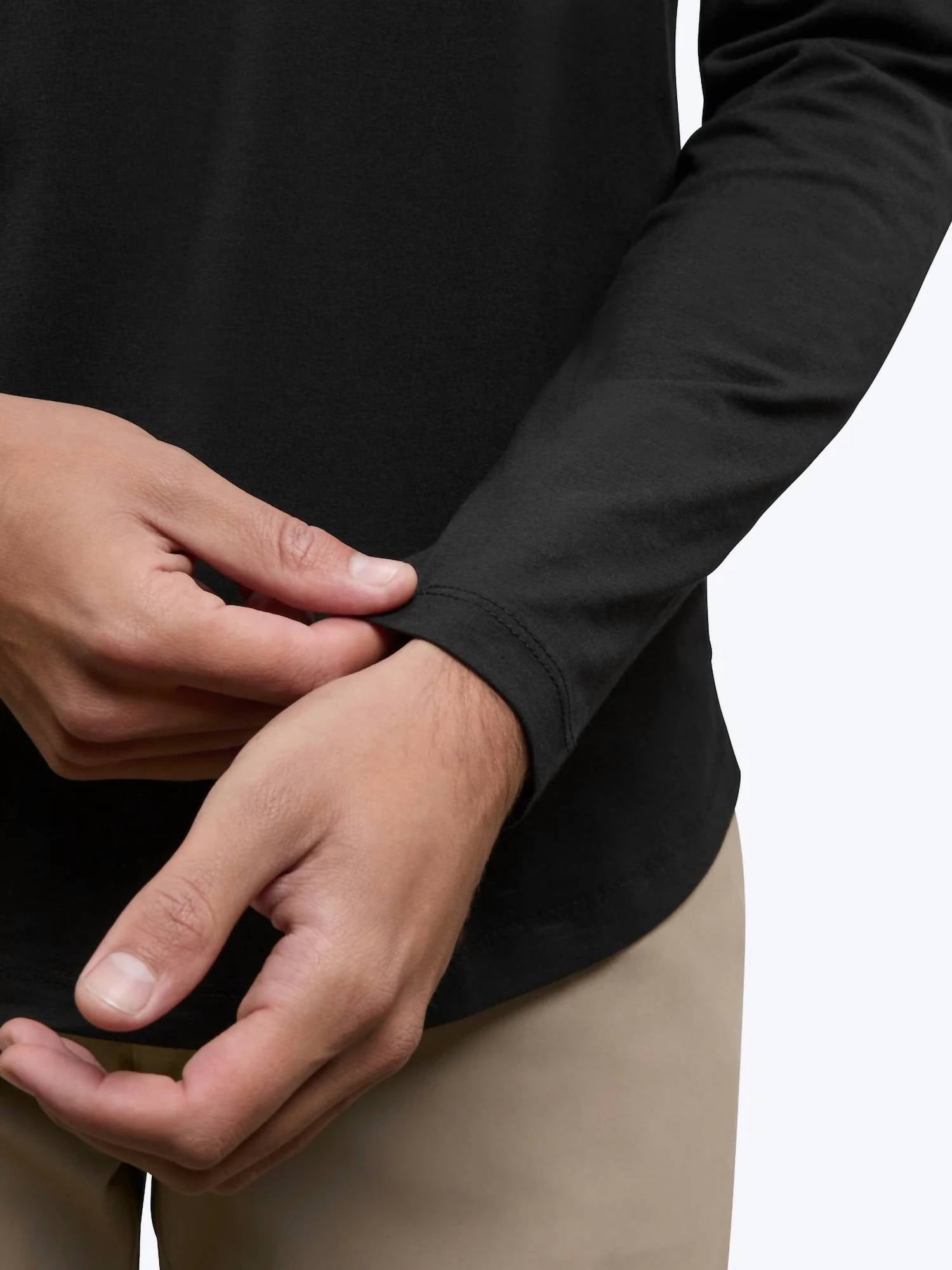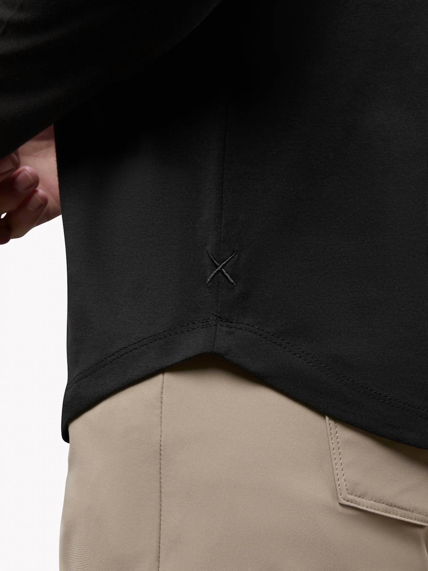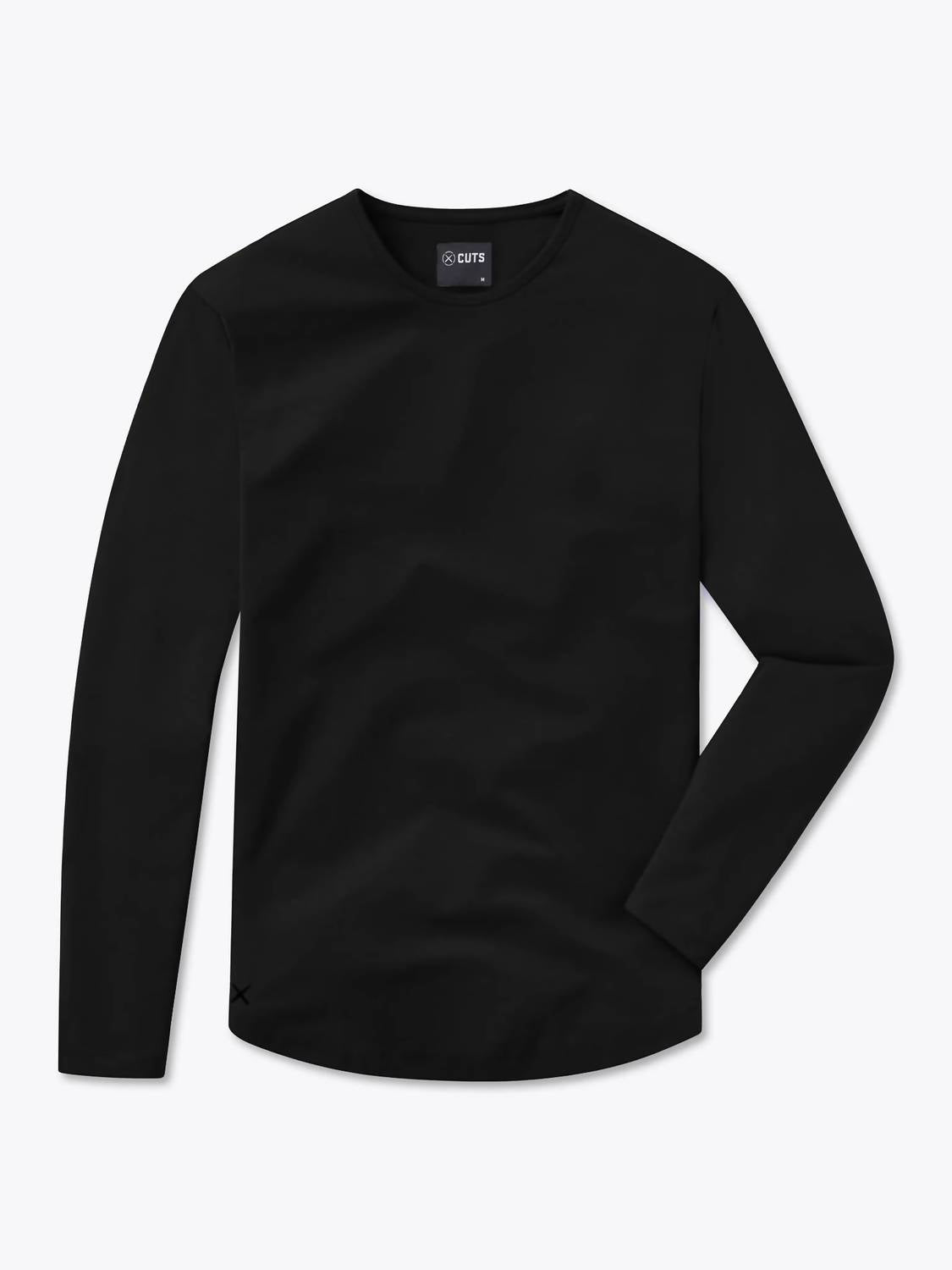 Elevate your wardrobe with the Ao Long Sleeve Curve-Hem Tee by CUTS, a minimalistic solid black staple perfect for any dinner party. This long sleeve t-shirt showcases the brand's custom PYCA Pro® fabric for ultimate comfort and a signature fit that's tapered for a sleek look. Made from a cotton blend of 62% Polyester, 33% Cotton, and 5% Spandex, this tee is designed with a distinctive Curve-Hem to prevent bunching at the waist. Closure: Pull-on style. Care: Machine wash and tumble dry.