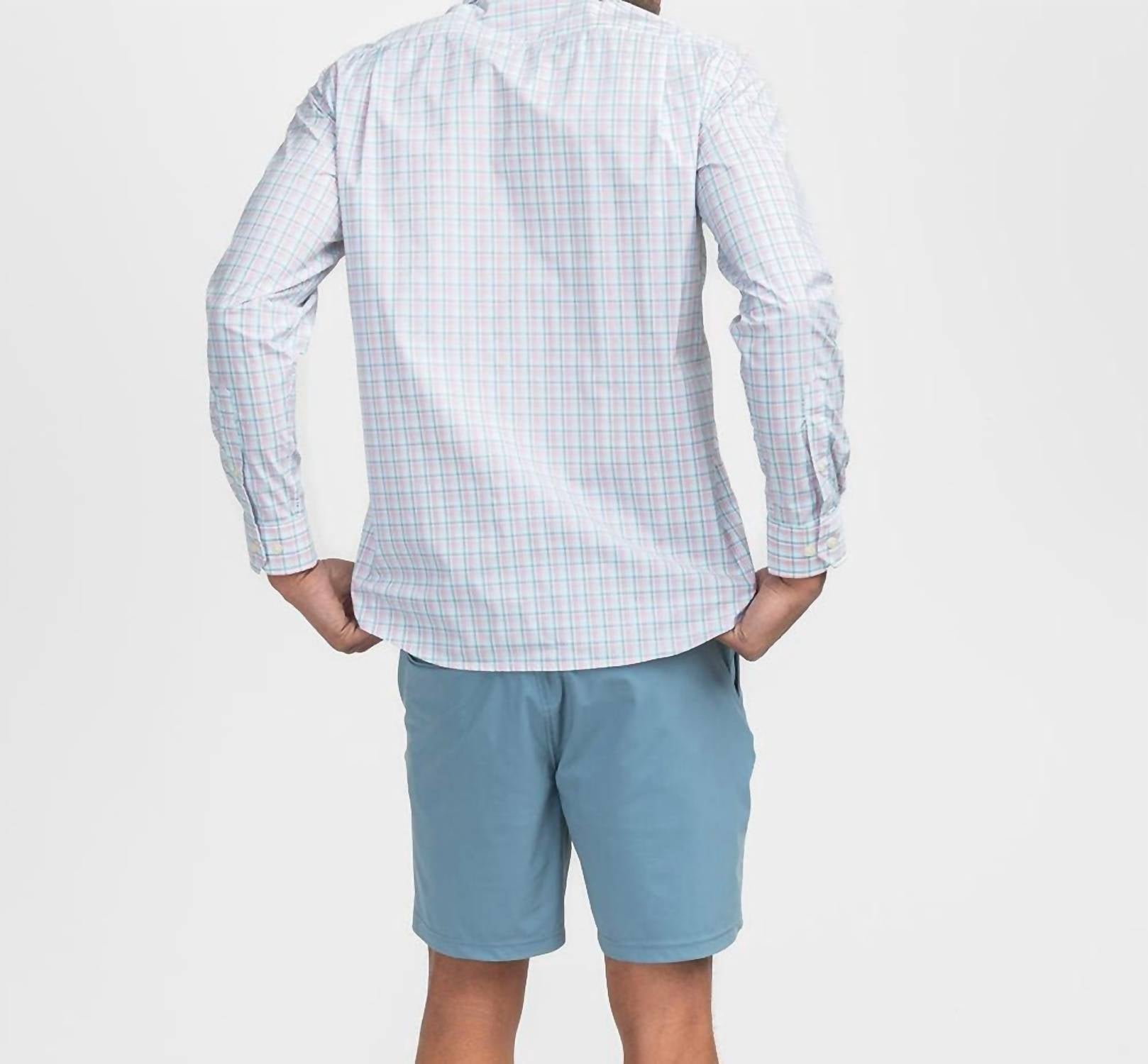 Introducing the Magnolia Plaid Long Sleeve Shirt by Southern Shirt Company, a perfect addition to your spring wardrobe in the refreshing Pacific Cooler hue. This men's dress shirt, designed with a modern fit, offers long sleeves, a classic collar, and a functional button closure. Crafted from a lightweight, breathable nylon blend with 95% nylon and 5% spandex, it features quick-drying, moisture-wicking, and wrinkle-resistant properties. Turn inside out and machine wash cold with like colors, tumble dry low, and low iron if needed to maintain its preppy style for your next dinner party.
