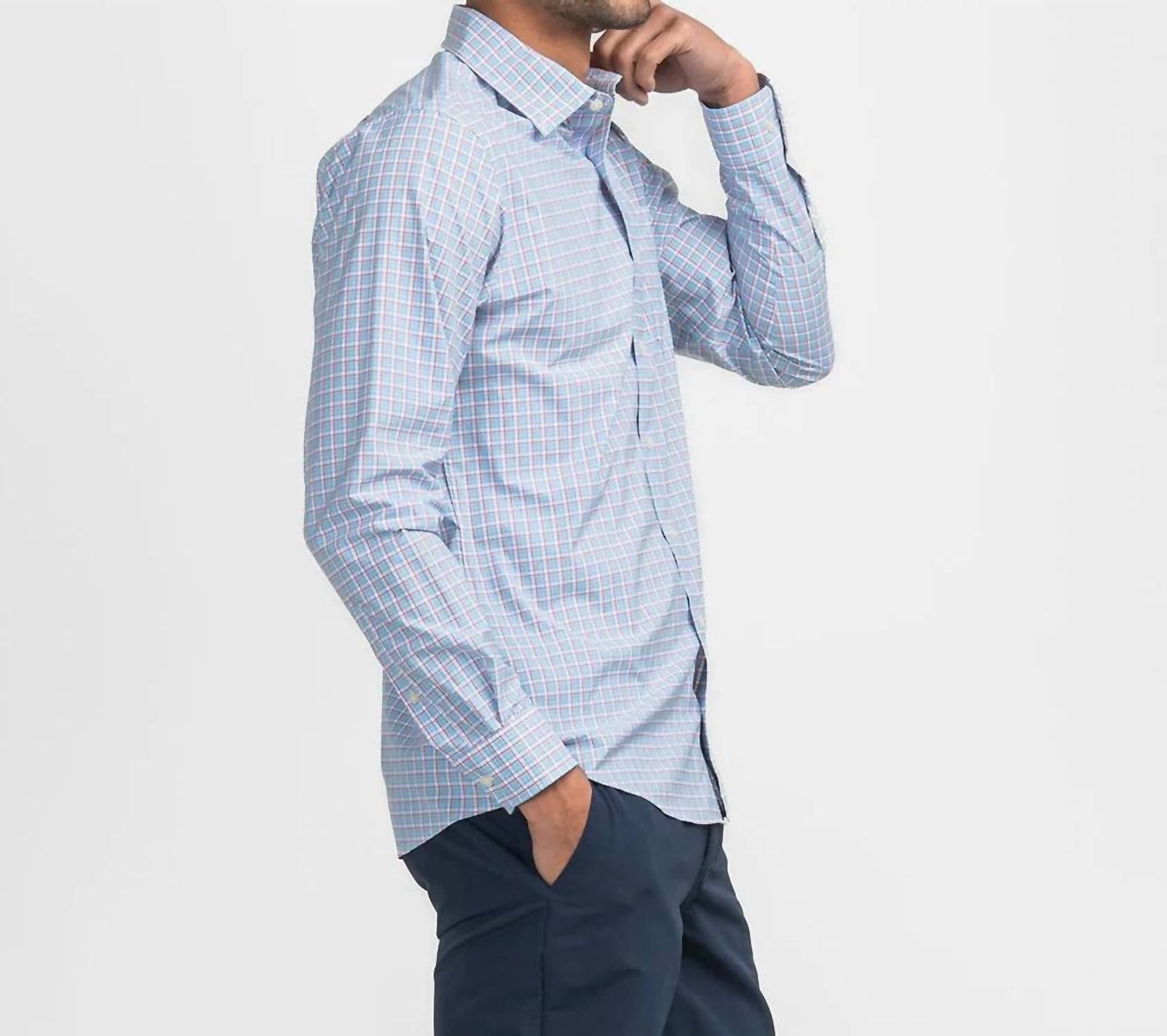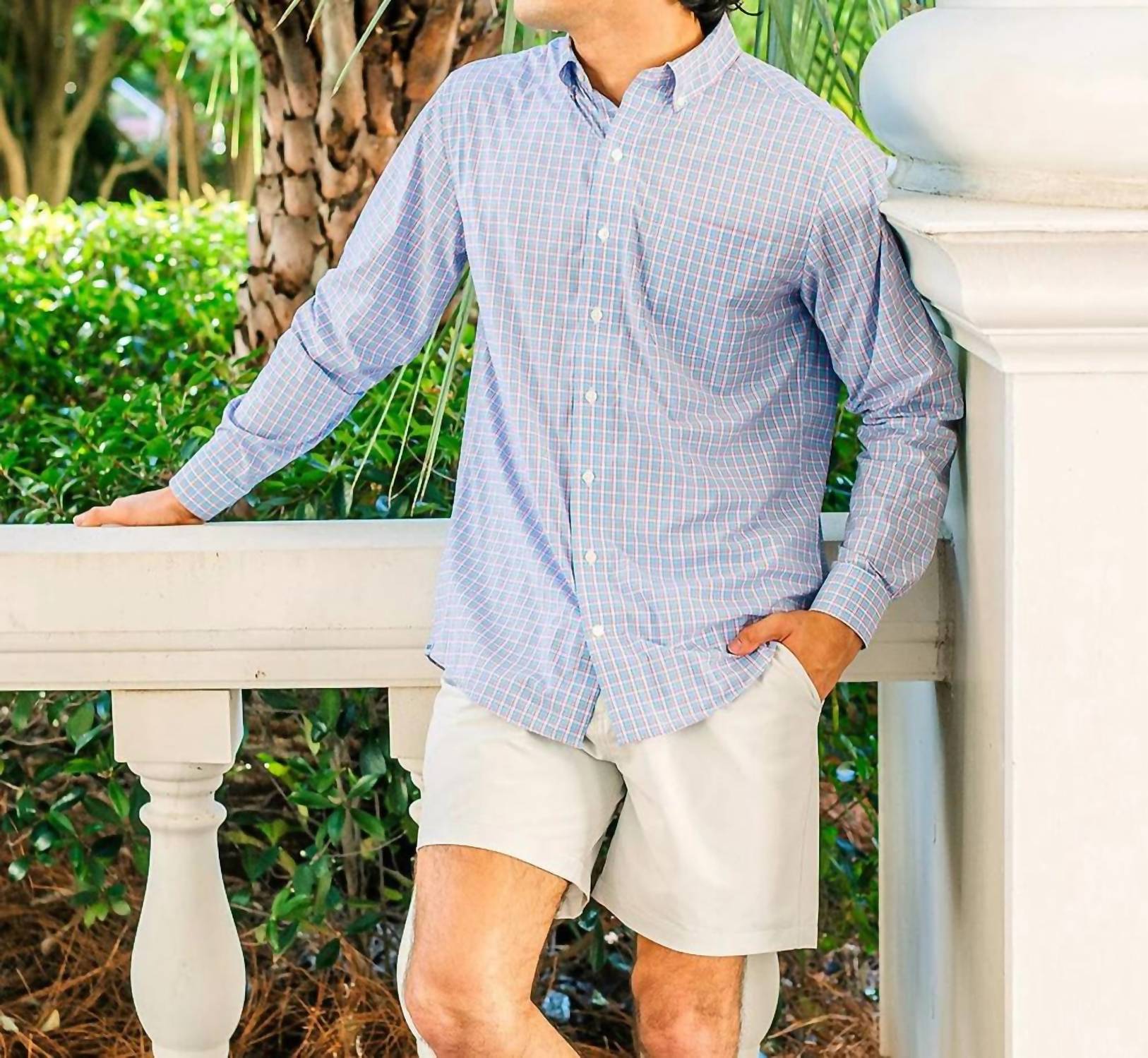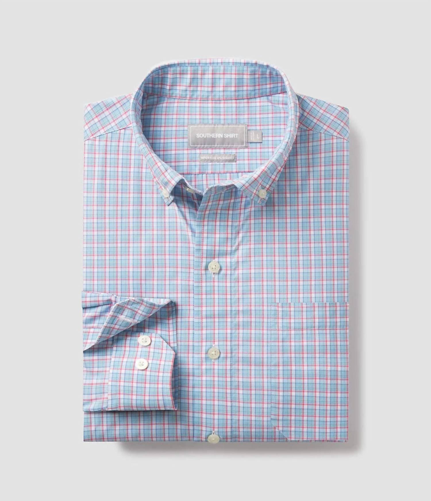 Introducing the Crestwood Plaid Long Sleeve Shirt by Southern Shirt Company, a stylish men's piece in vibrant blue. With its long sleeves and collar neckline, this shirt offers a non-boxy modern fit. Crafted from a 95% Nylon and 5% Spandex blend, it features a two-way stretch for comfort, quick-drying, moisture-wicking, and wrinkle-resistant properties. Closure: Button closure. Care: Machine wash. Perfect for a variety of occasions, including travel and Father's Day. Shayne is 6'3" and wearing a medium.