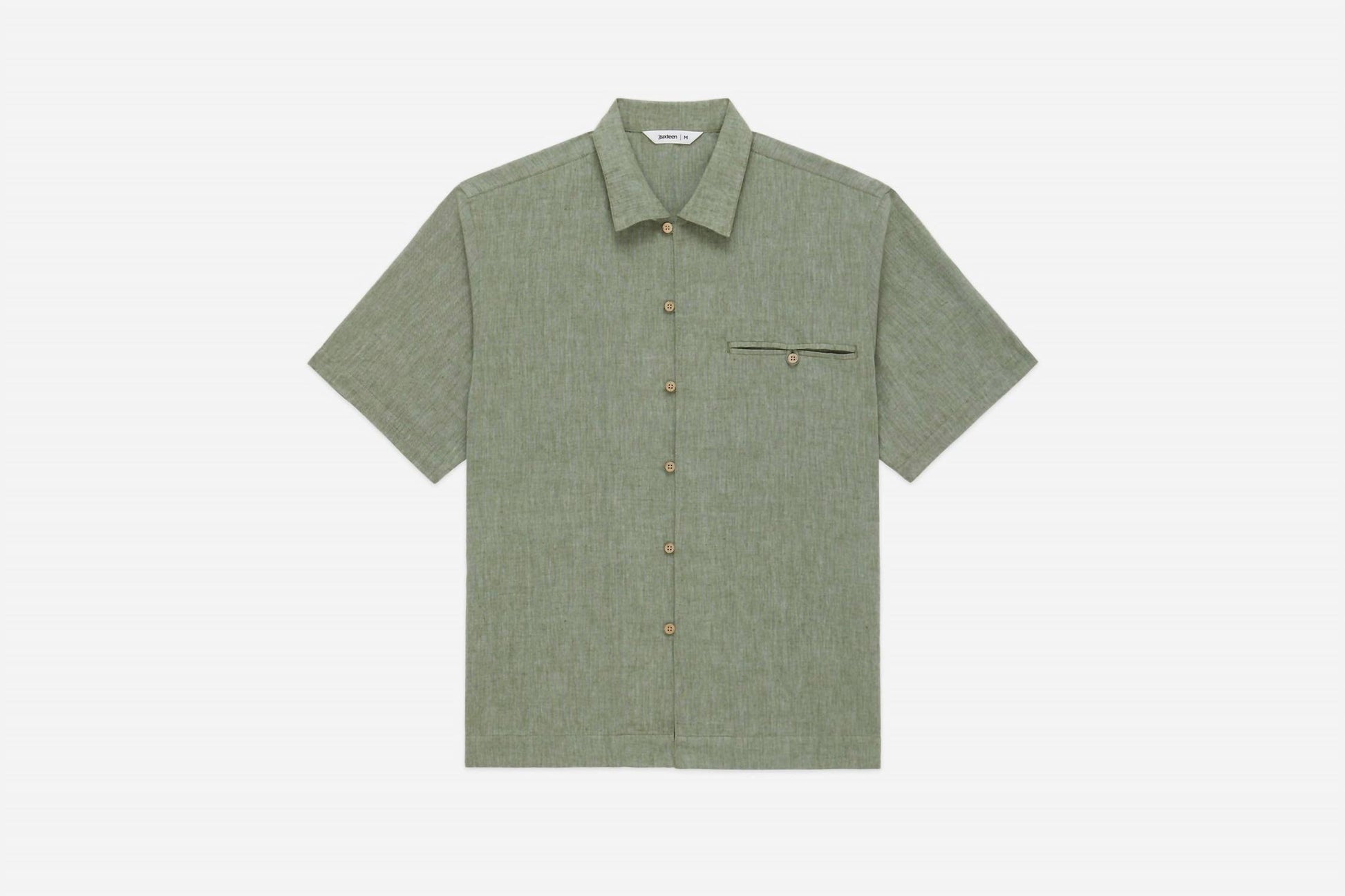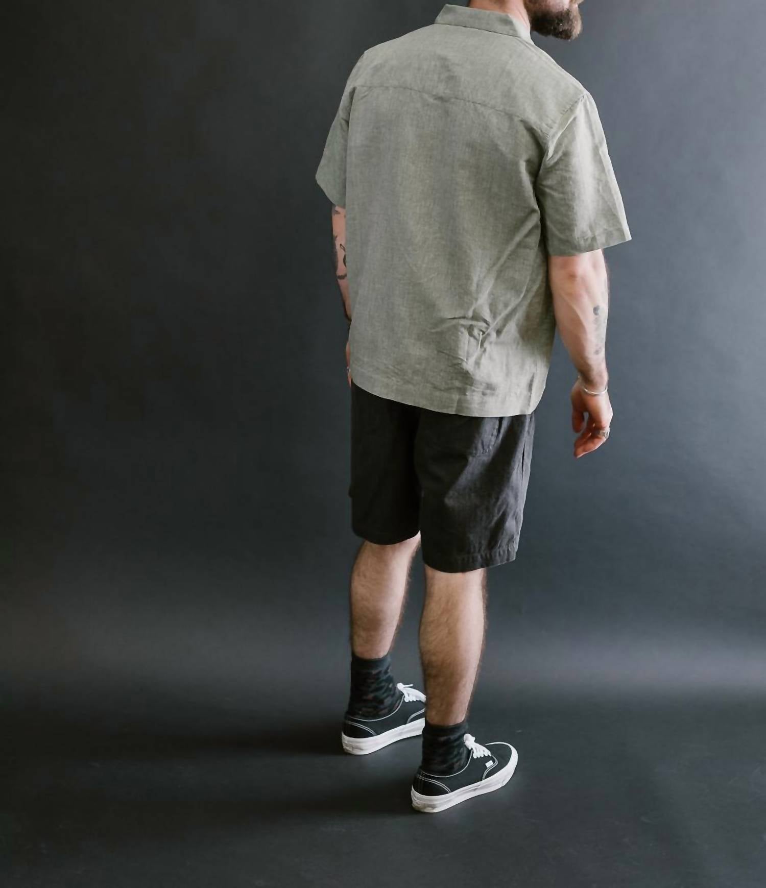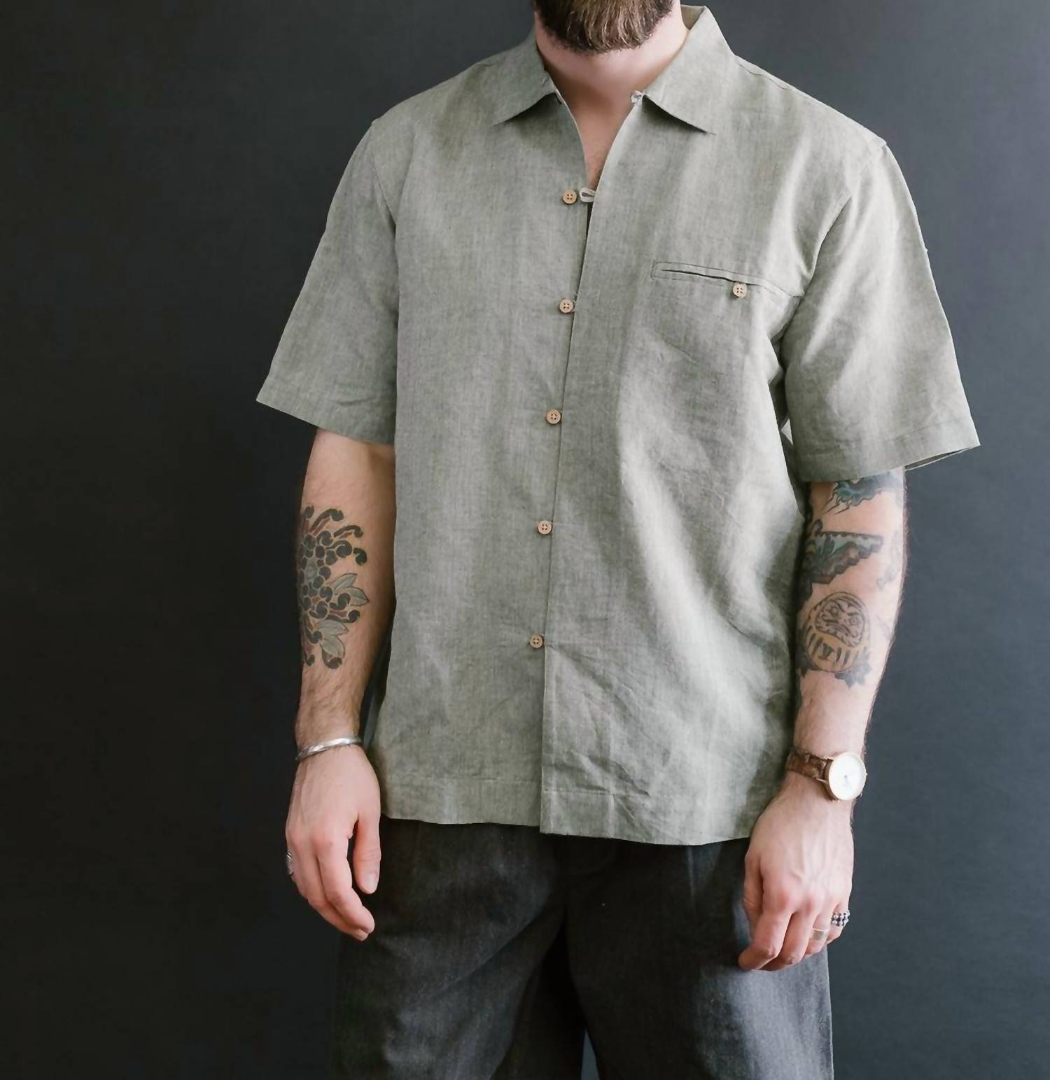 This short-sleeve loop shirt offers a refined take on a warm-weather staple, crafted from a breathable textured blend of 65% linen and 45% cotton for a soft, broken-in feel. Designed with a relaxed fit, it features an open loop collar, a single front chest pocket, coconut shell buttons, a straight back yoke, and a straight hem, making it an effortless choice for laid-back layering.