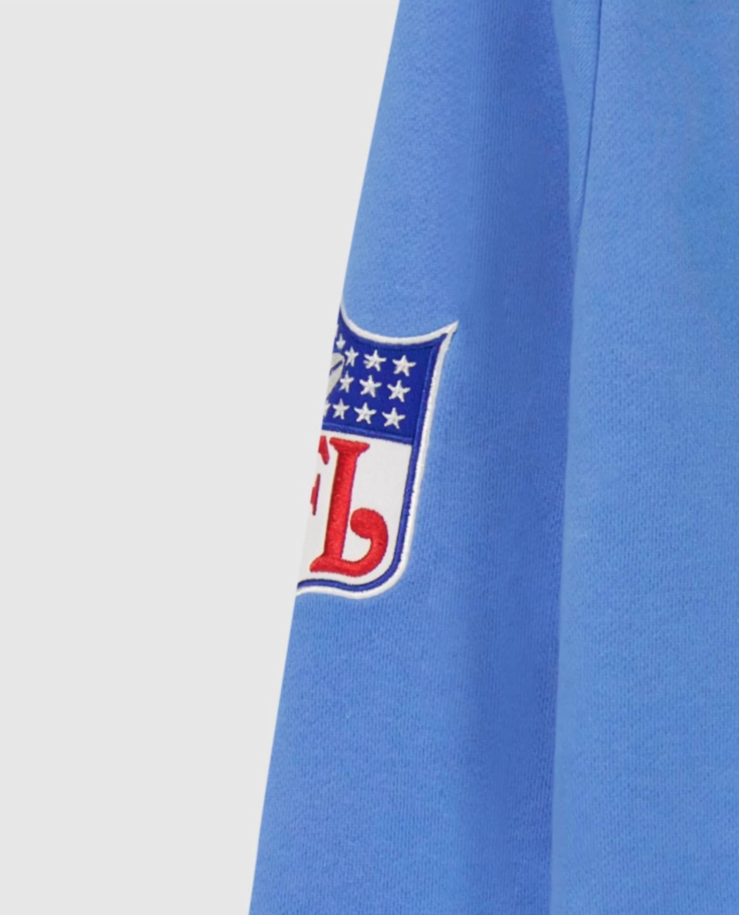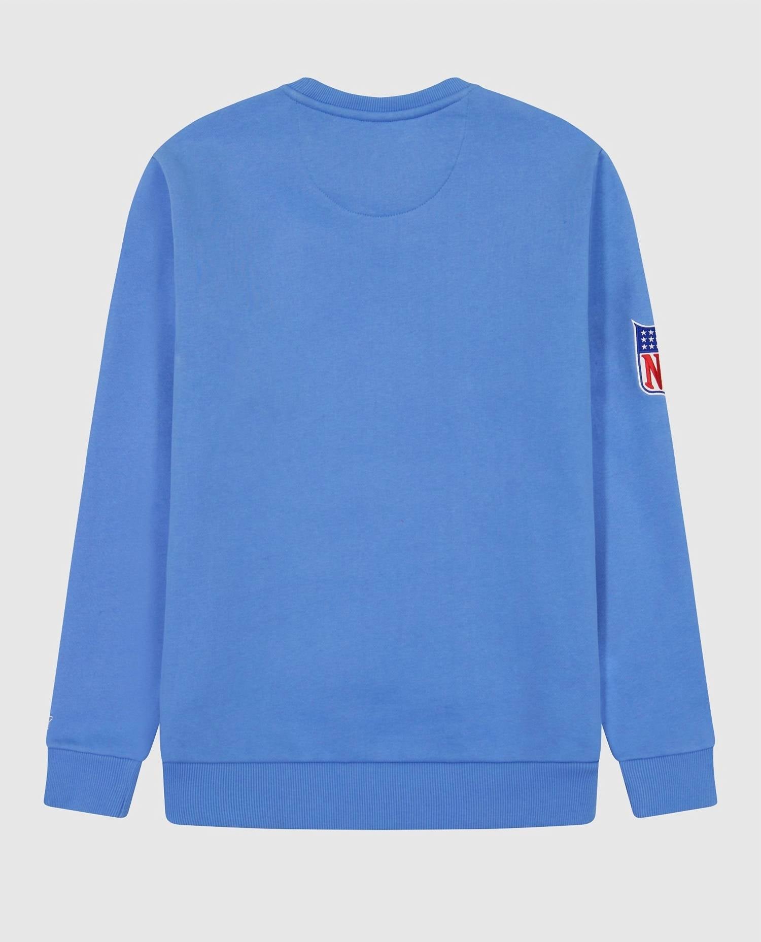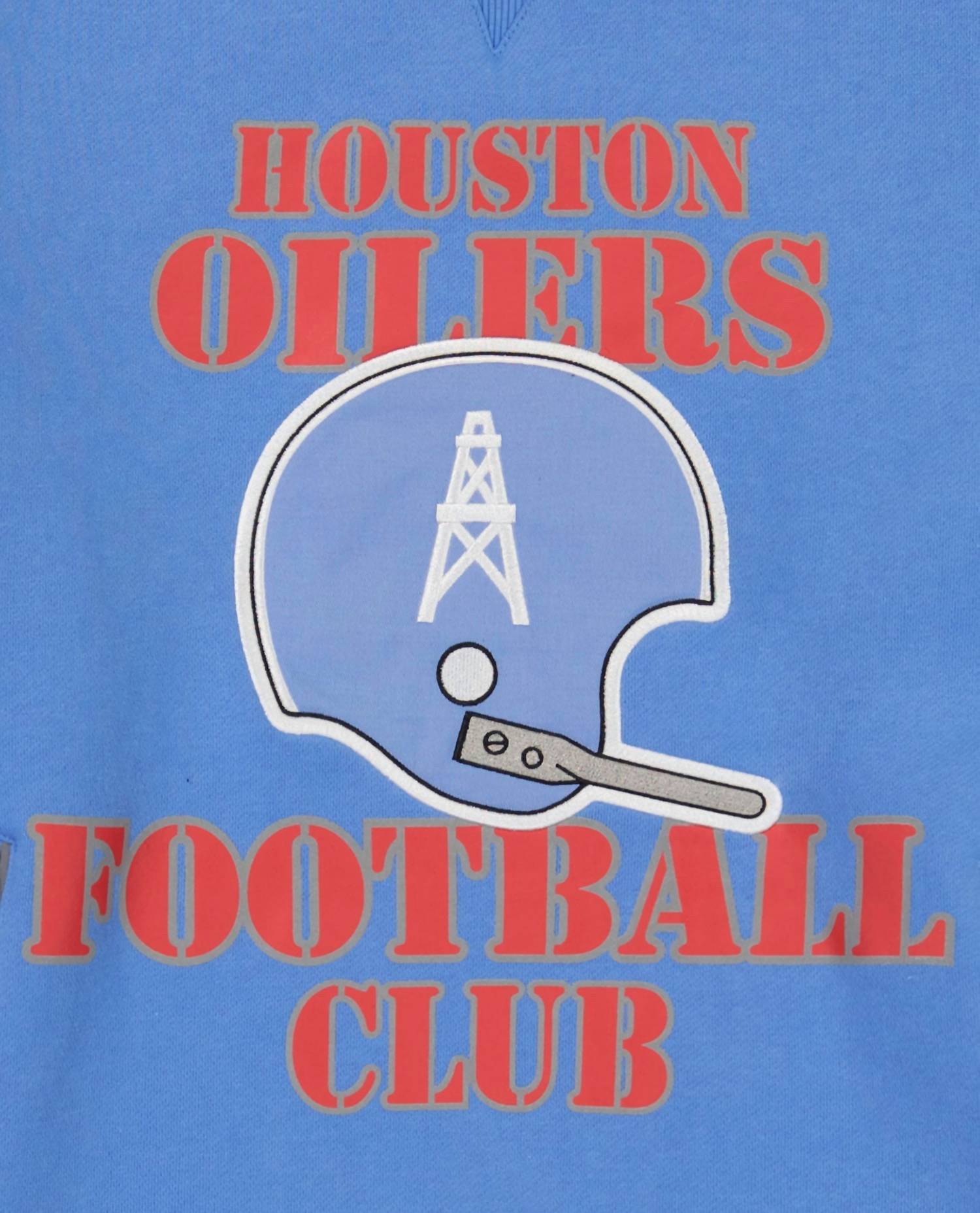 The Men's Houston Oilers Crew Neck Sweatshirt by Starter is a fleece delight in a light blue primary team color. Featuring long sleeves and a pull-on closure, this sweatshirt showcases a screen-printed team name with the city at the center chest and a large team logo helmet appliquéd at the center front. A retro NFL shield twill appliqué patch adorns the right sleeve, while the embroidered Starter logo sits on the left cuff. With a front zipper pocket detailed with reflective materials, this graphic design is perfect for any fan.