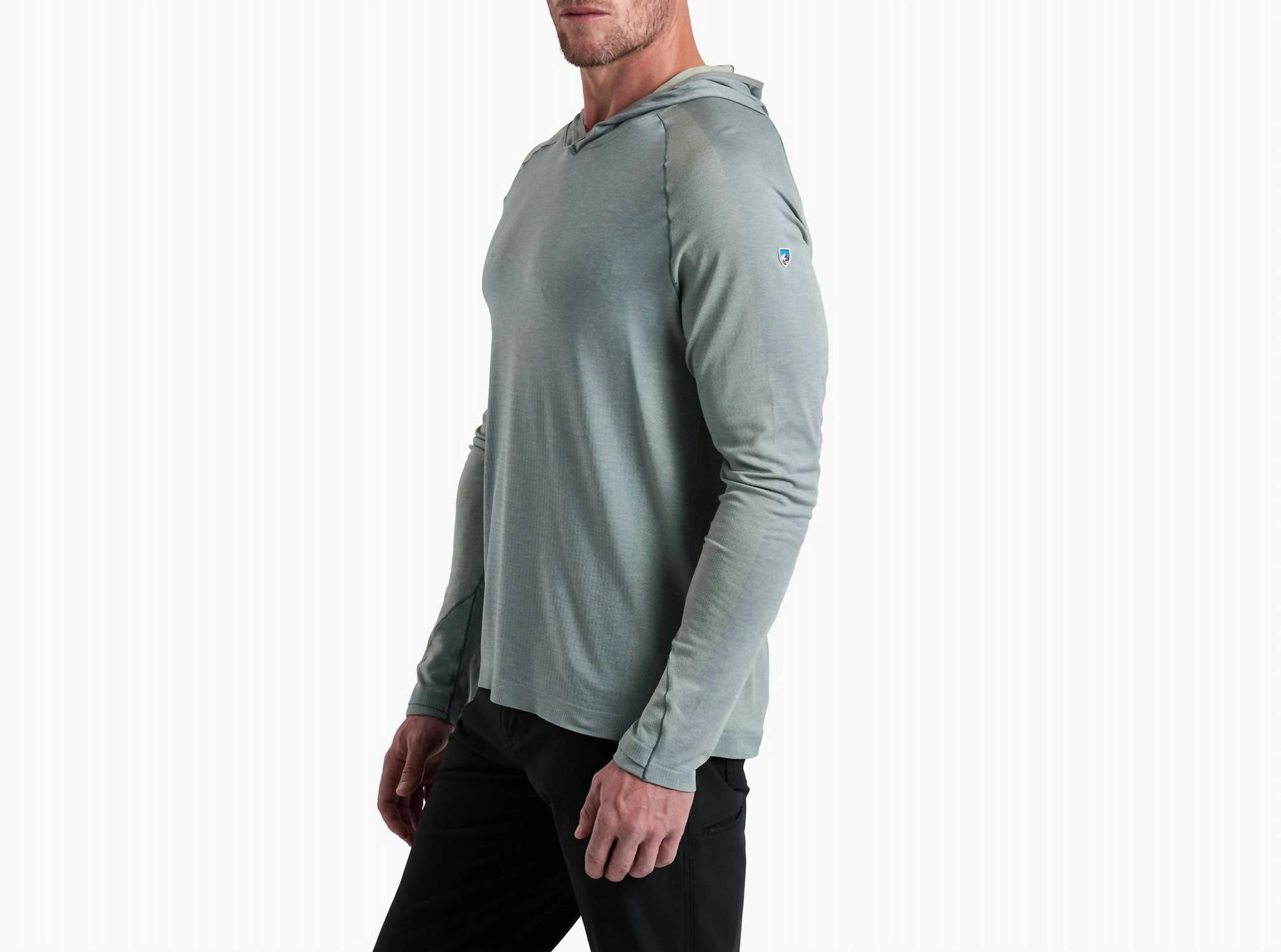 Experience the ultimate in sun protection and comfort with the Eclipser Light Hoody by KUHL, crafted for men in a rich Desert Sage color. This long sleeve sweatshirt is an essential piece for minimalist fitness enthusiasts, designed with a Nylon Blend incorporating advanced Graphene technology for temperature regulation and odor resistance. Featuring a pull-on closure, it offers a seamless, ultra-light fit, and UPF 50+ protection, perfect for outdoor workouts or a casual fall layering piece. Care is straightforward; simply machine wash and tumble dry low to maintain the garment's durability and softness.