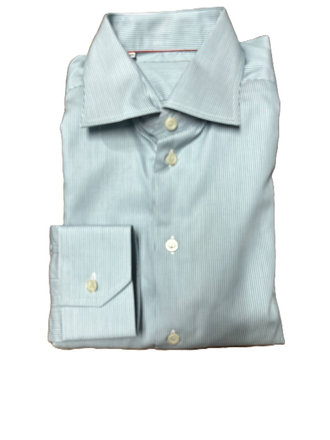 This is a new version of our Signature Twill fabric, woven with a fine striped pattern in classic business colors on a white base for versatility. It features a collar with an extreme cutaway style and a single cuff. The fabric is made from extra-long staple cotton, providing excellent luster, is wrinkle-resistant, and offers a delicate texture for all-day sharpness and comfort.