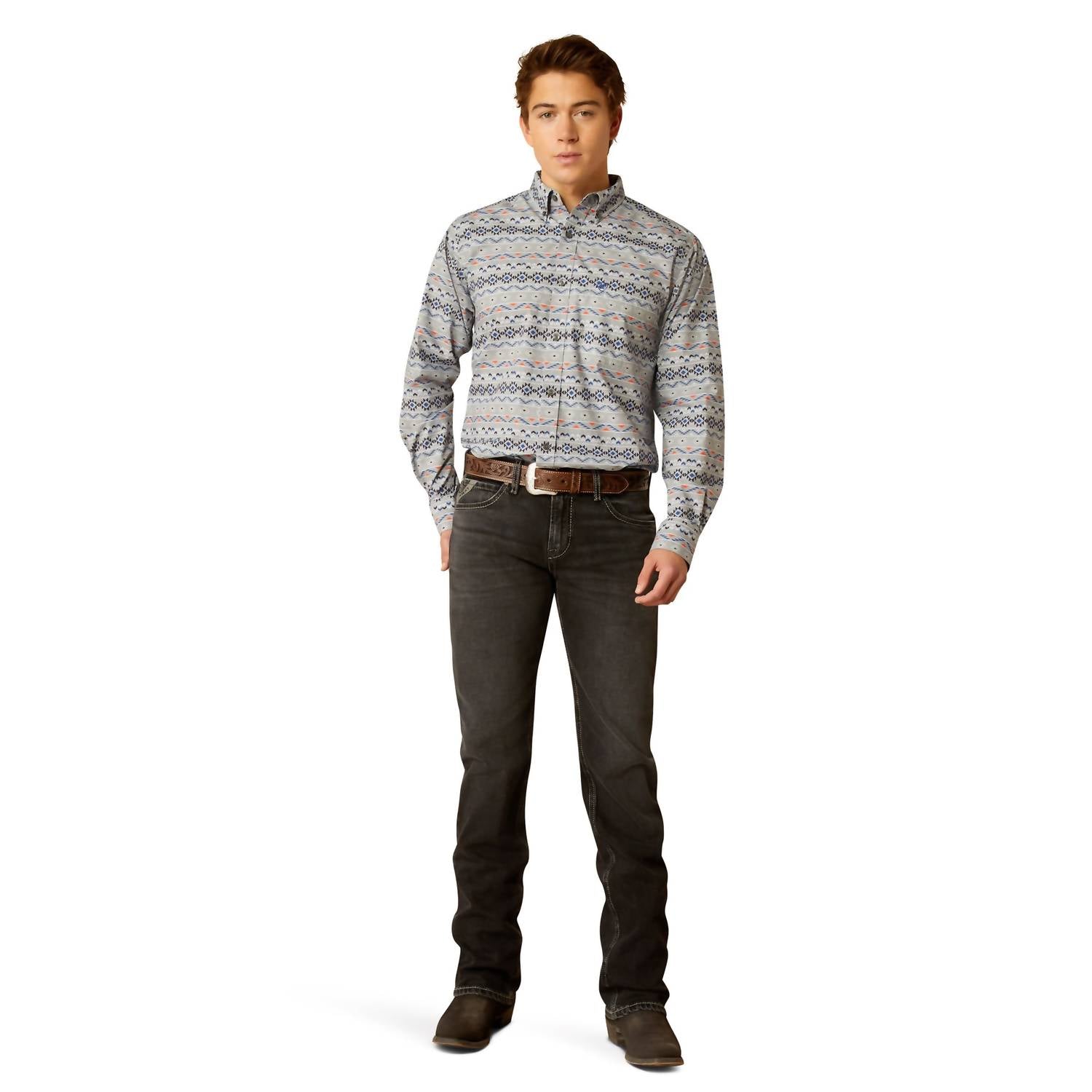 The ARIAT Men's Fitted Richie Casual Shirt in grey is perfect for your spring vacations with its western trend vibe. Featuring long sleeves and a classic collared neckline, this patterned shirt offers a polished yet relaxed look. Designed with a button closure, it ensures easy wear while allowing you to showcase your effortless style. Made for casual settings, this shirt is a must-have addition to your spring wardrobe.